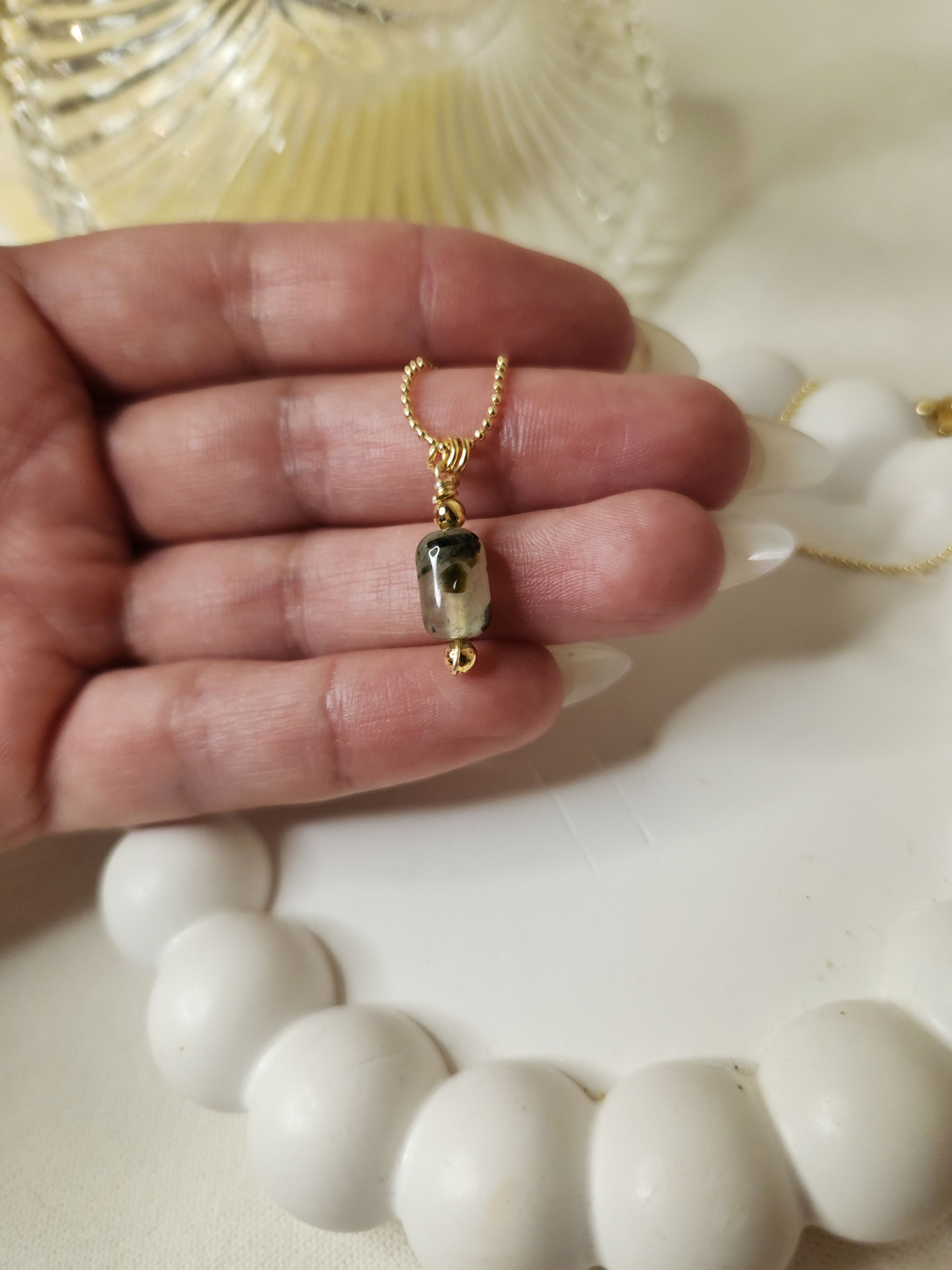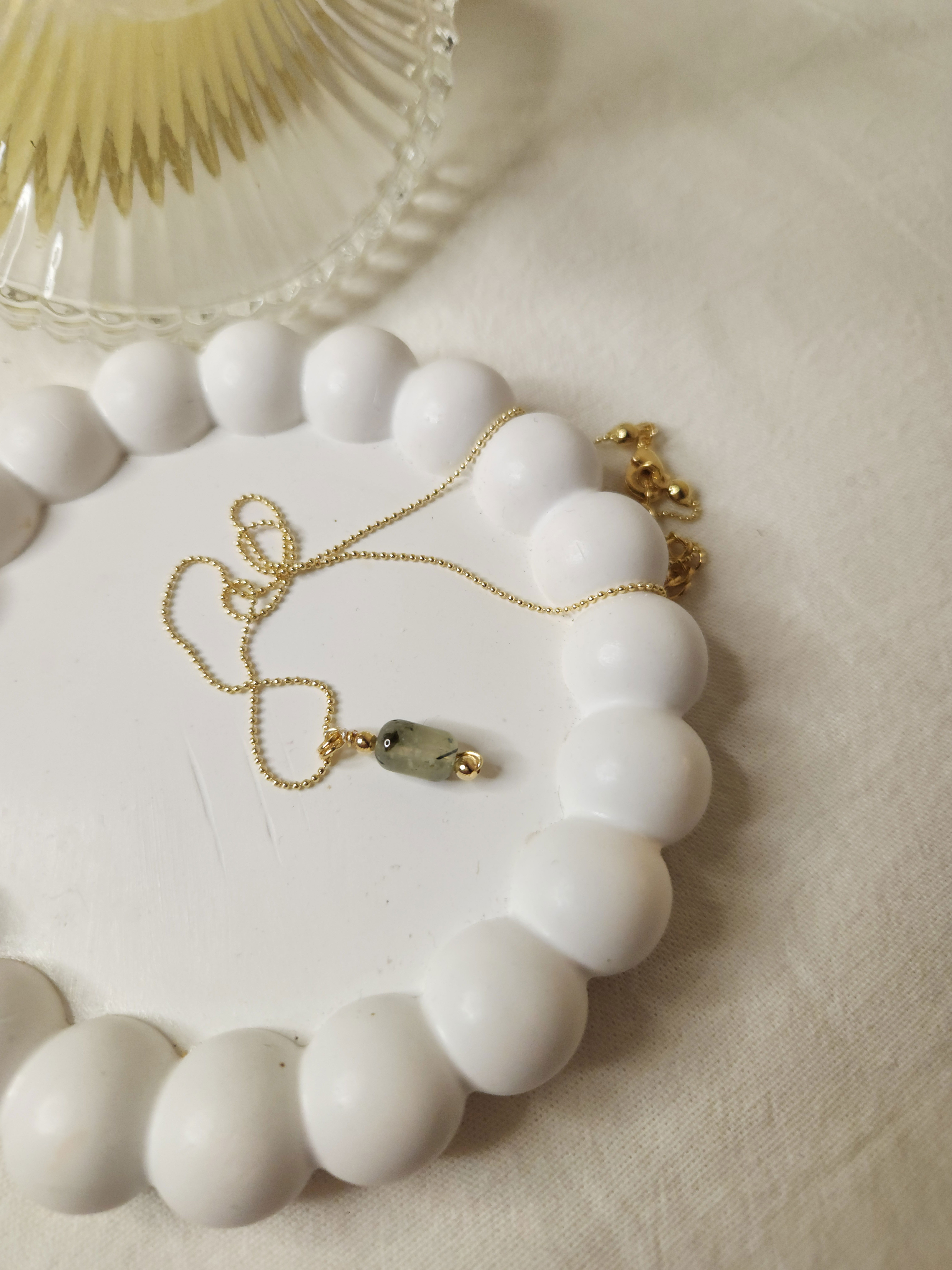 Conjunto realizado con cadena finita + dije piedra natural prehnita, todo en oro laminado hipoalergenico.
