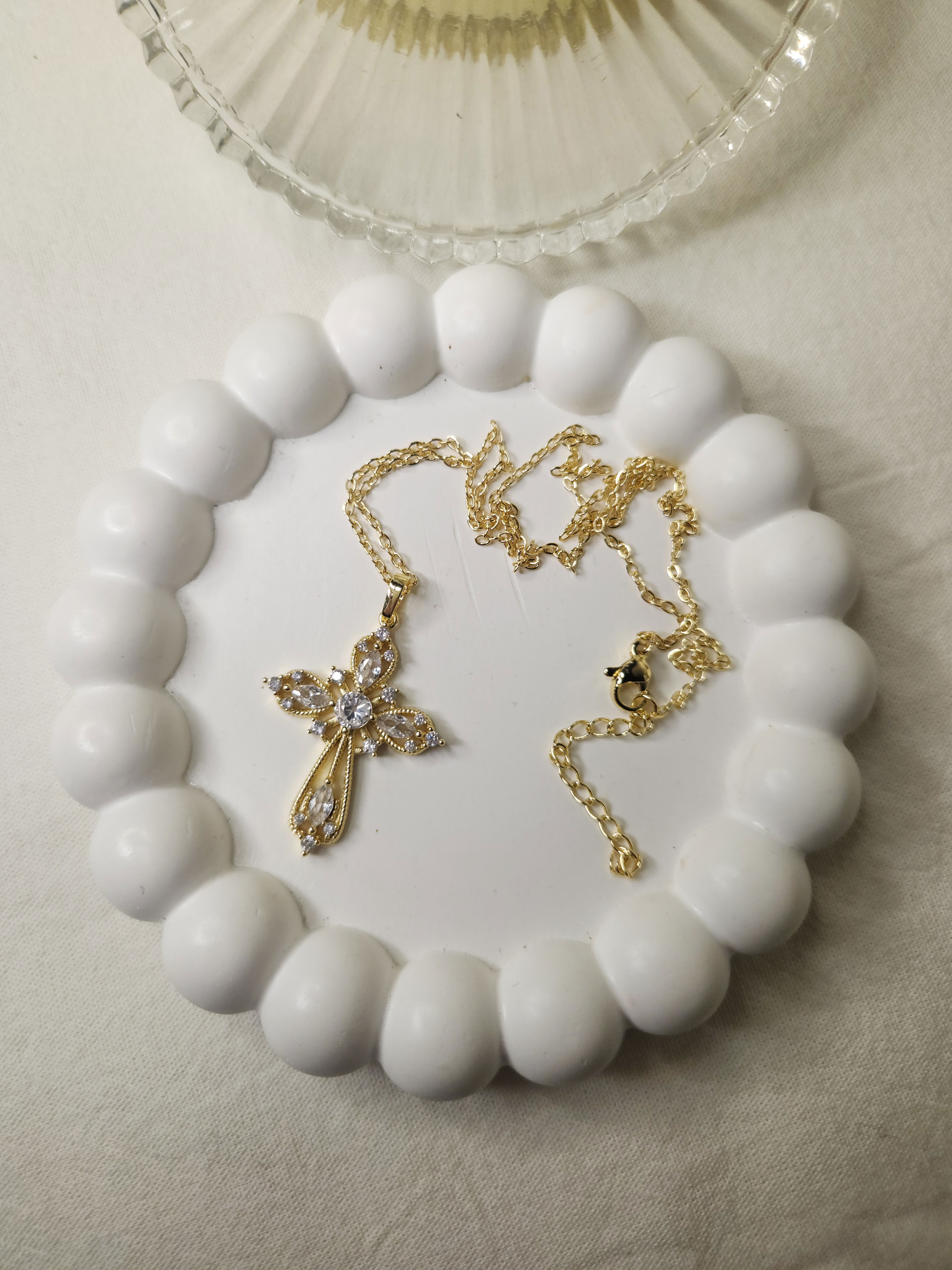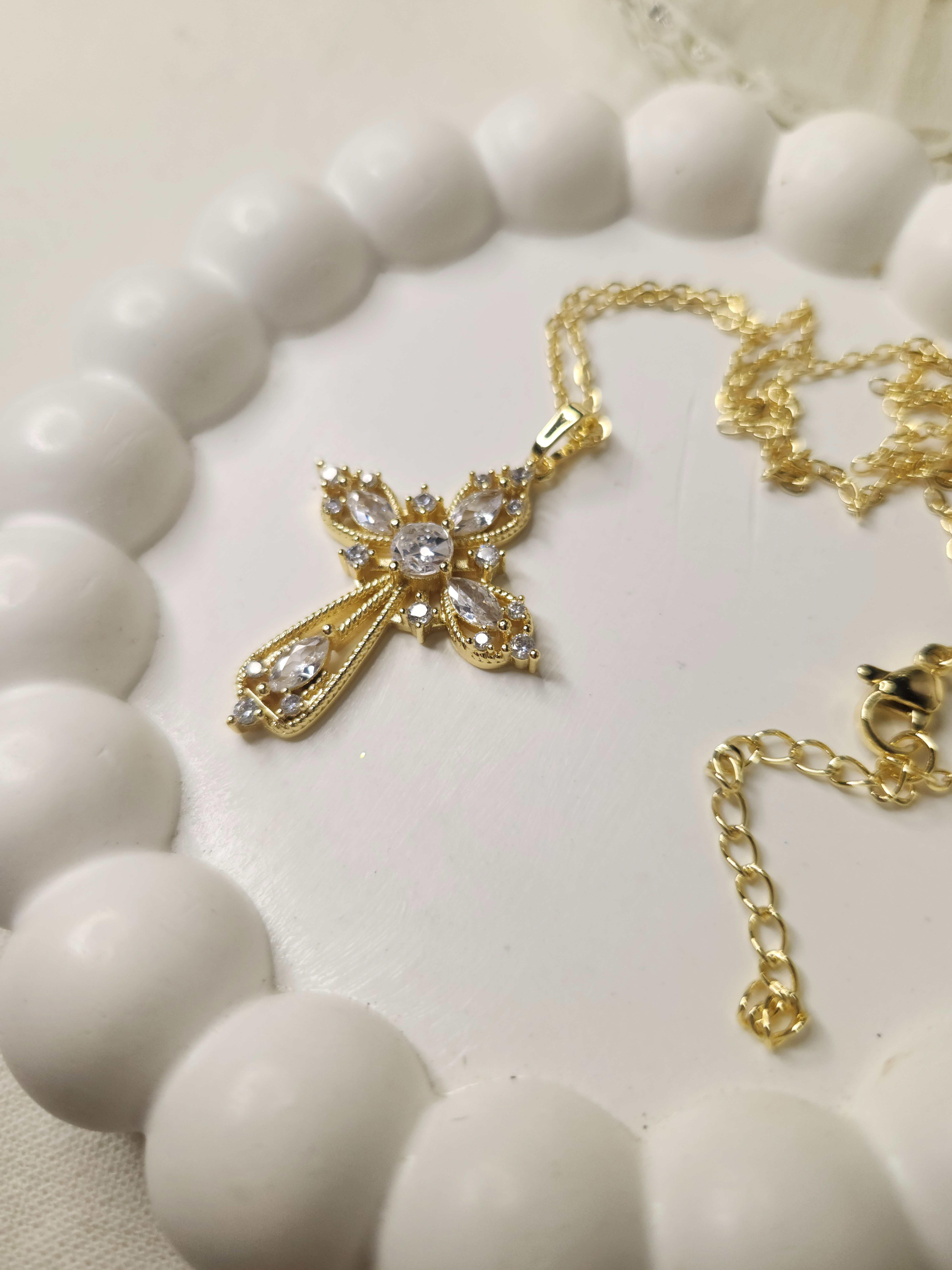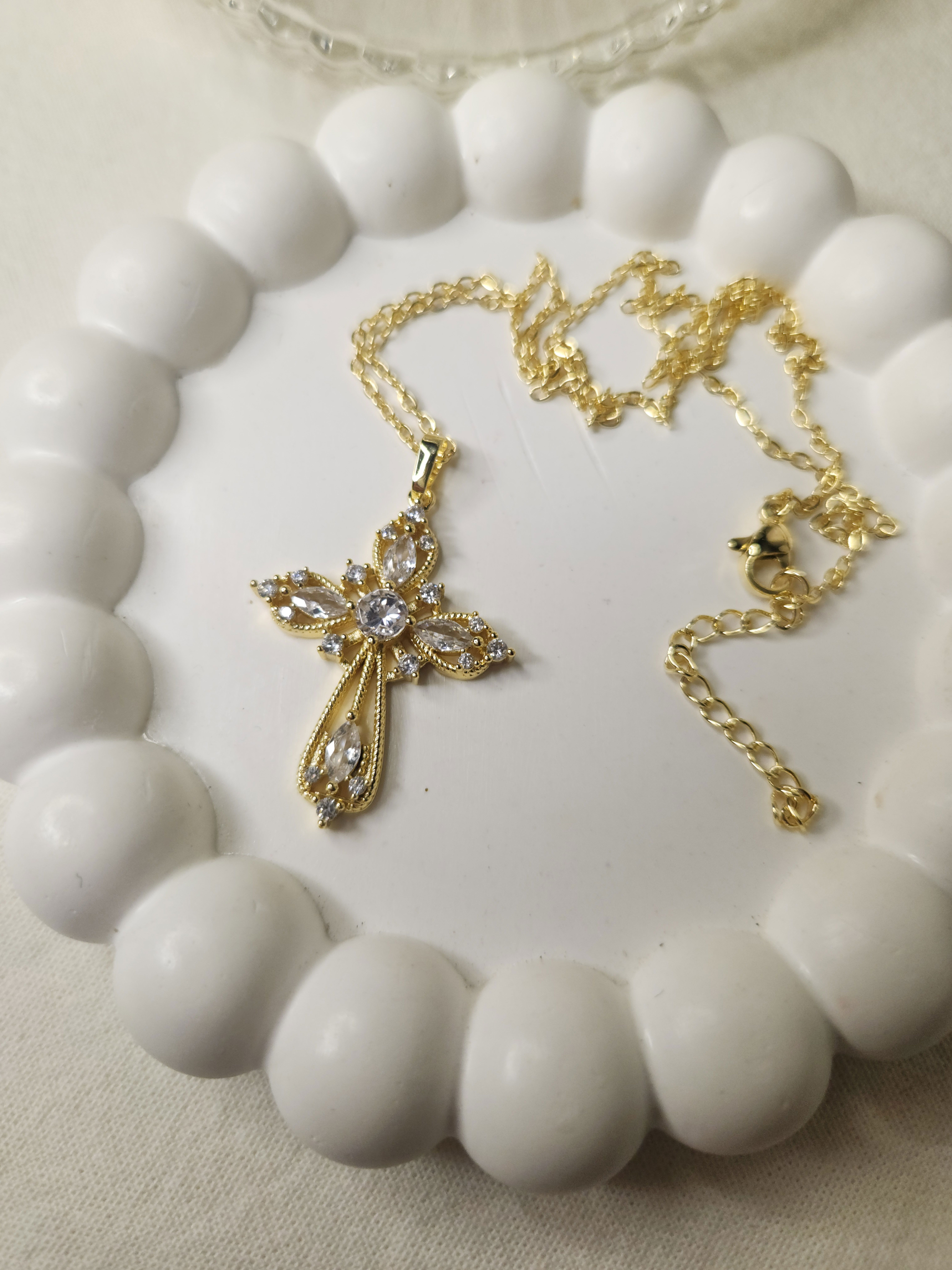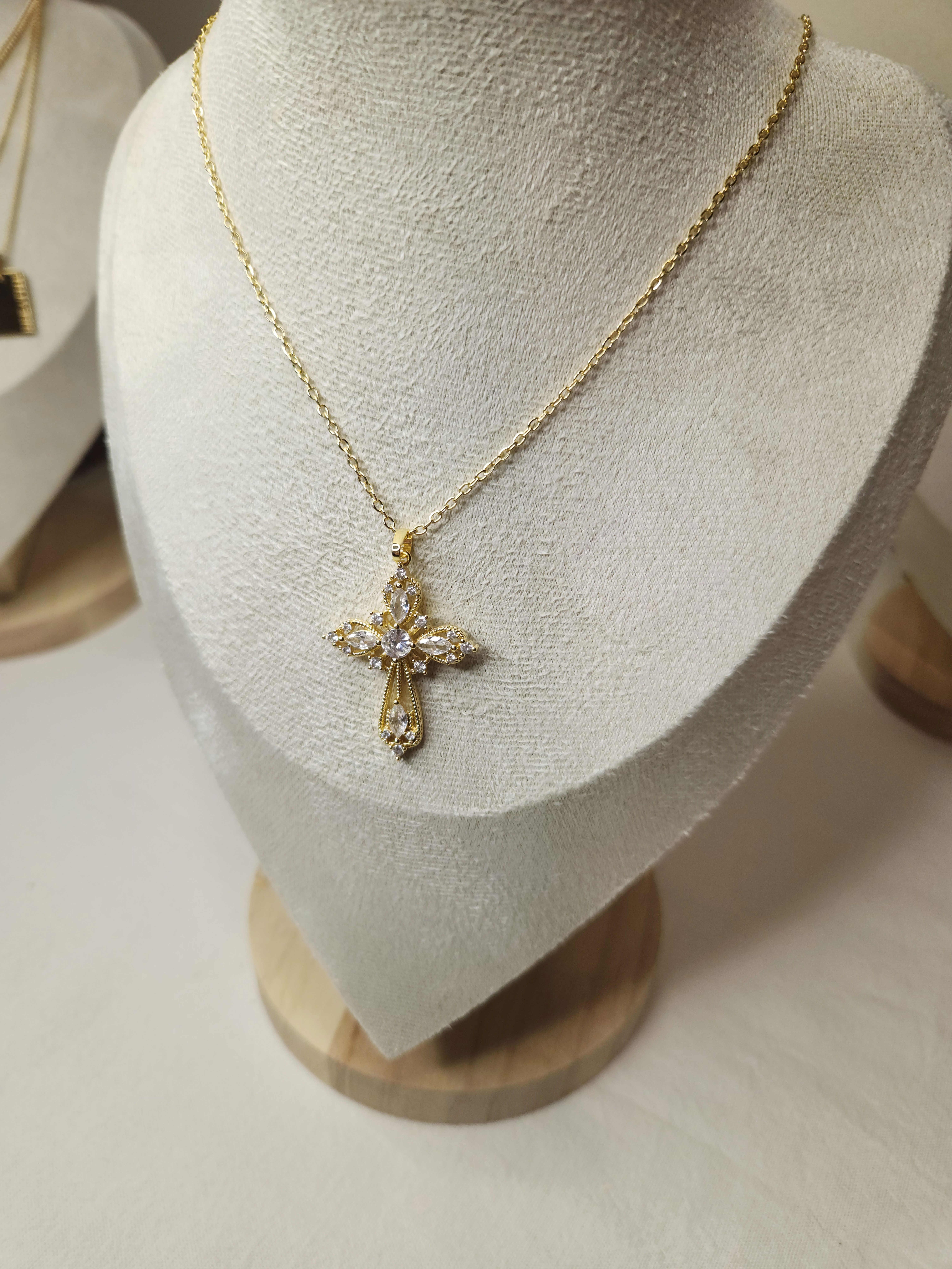 Collar de cadena tiffany con dije cruz calada, terminada en brillantes.