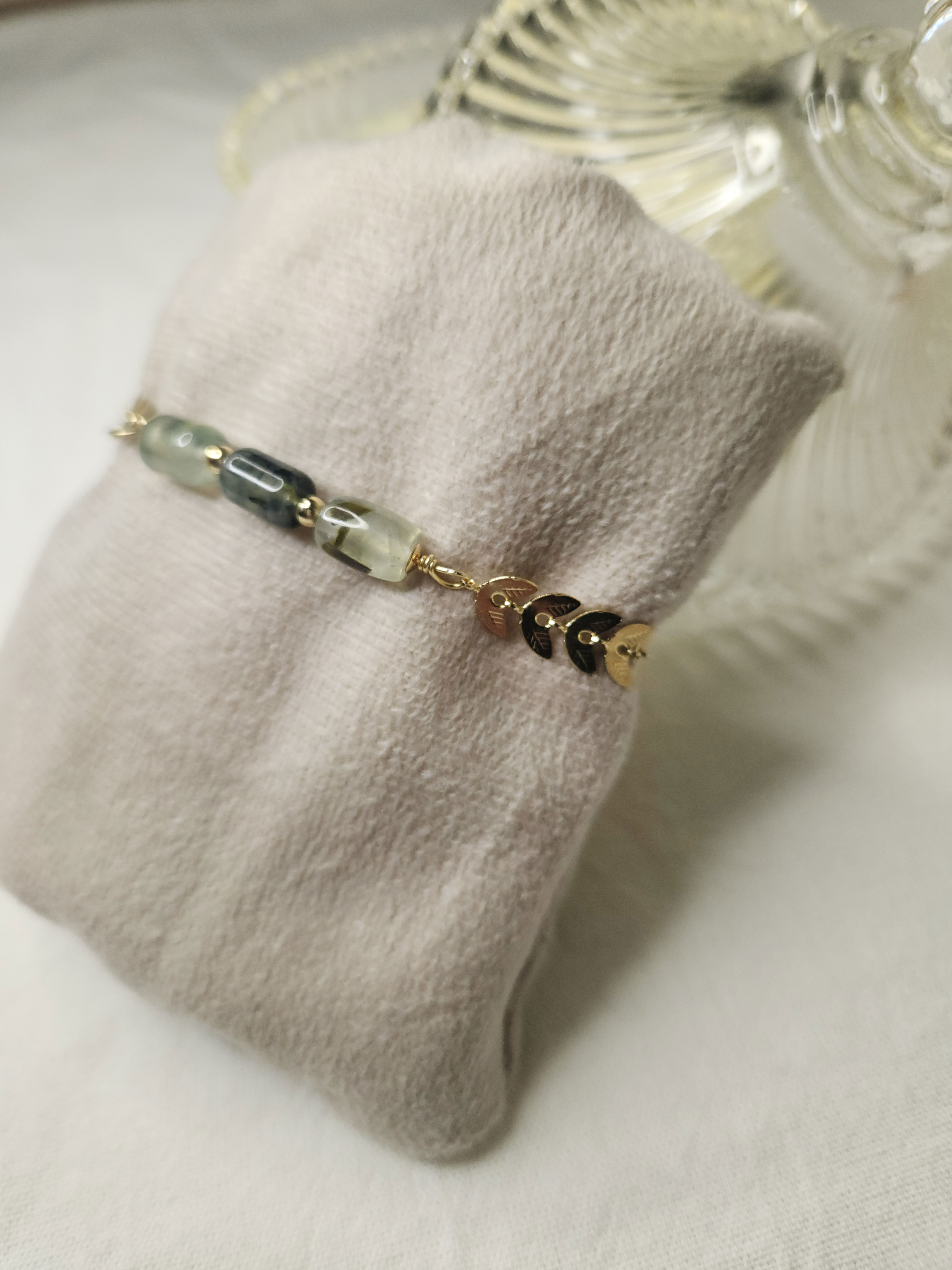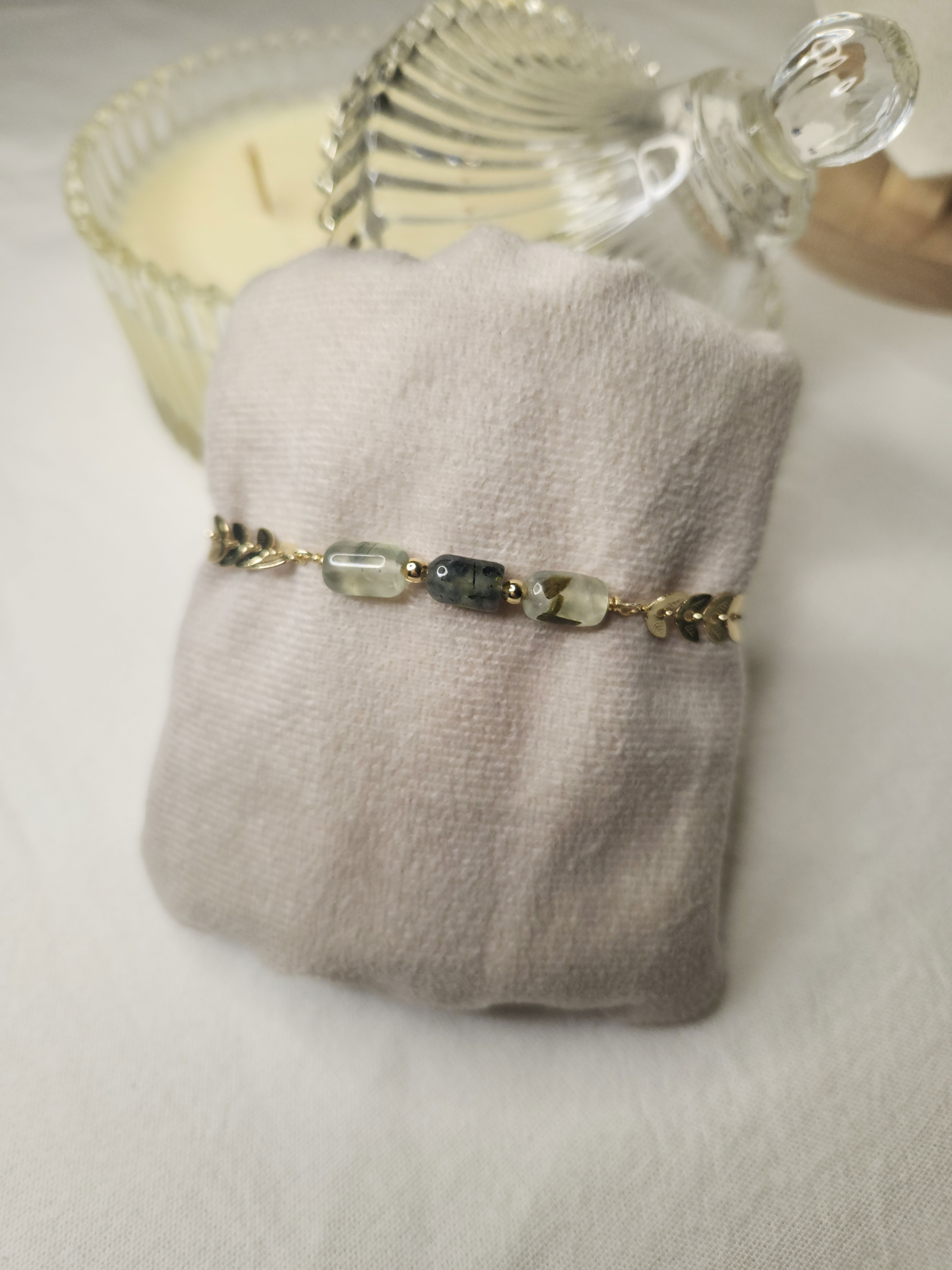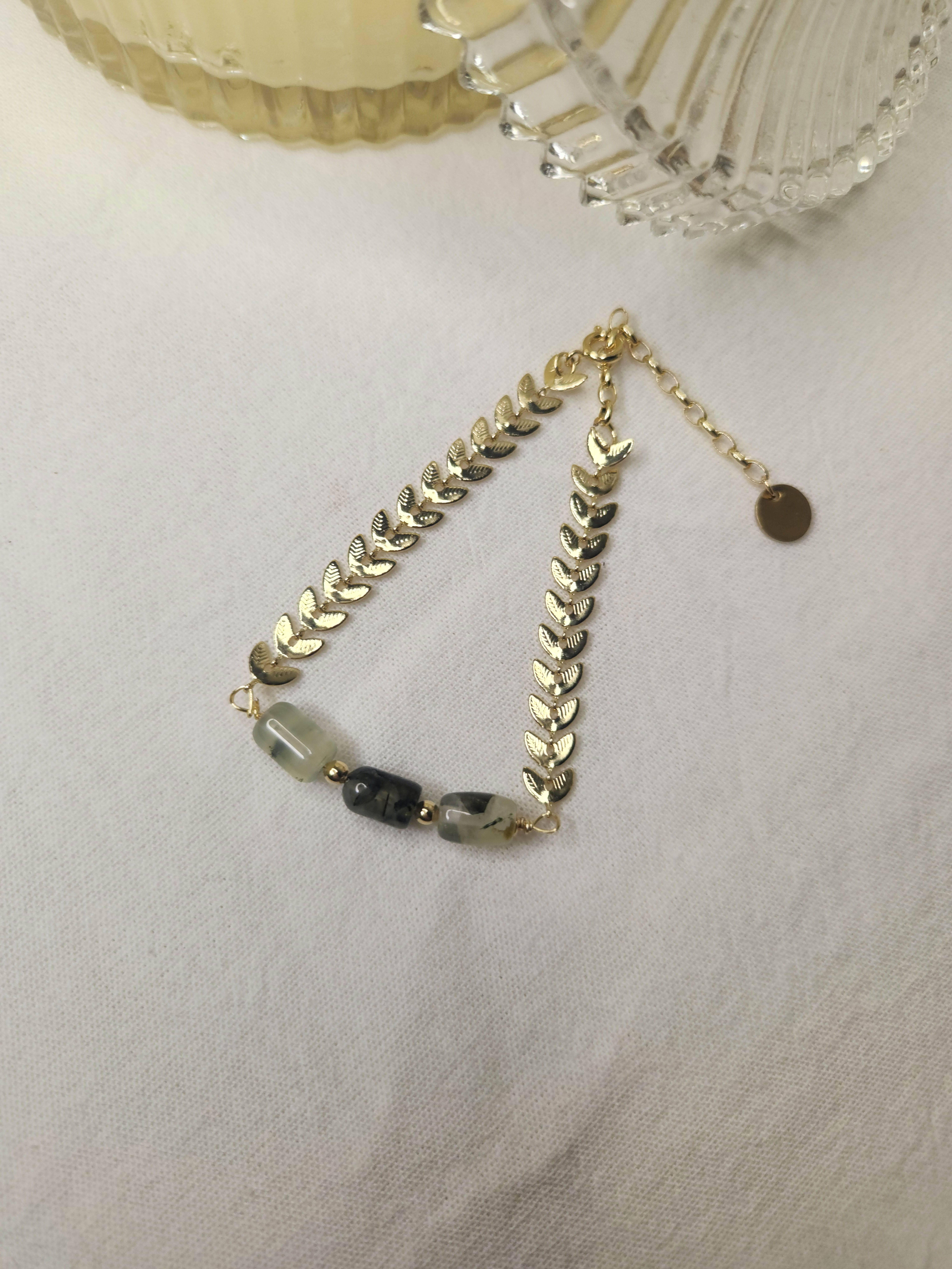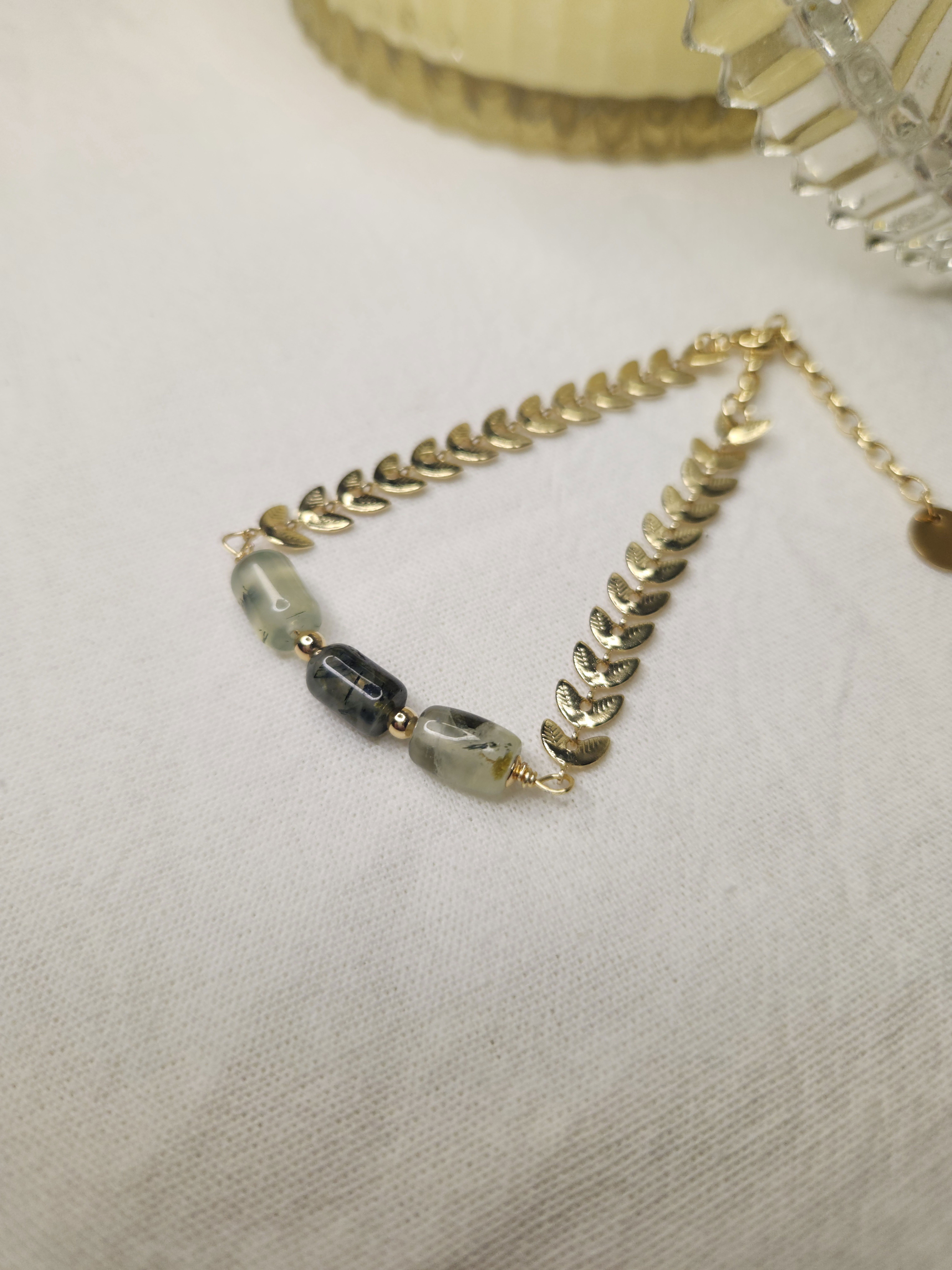 Pulsera en oro laminado con cadena en forma de flechas y columna de piedra natural prehnita.