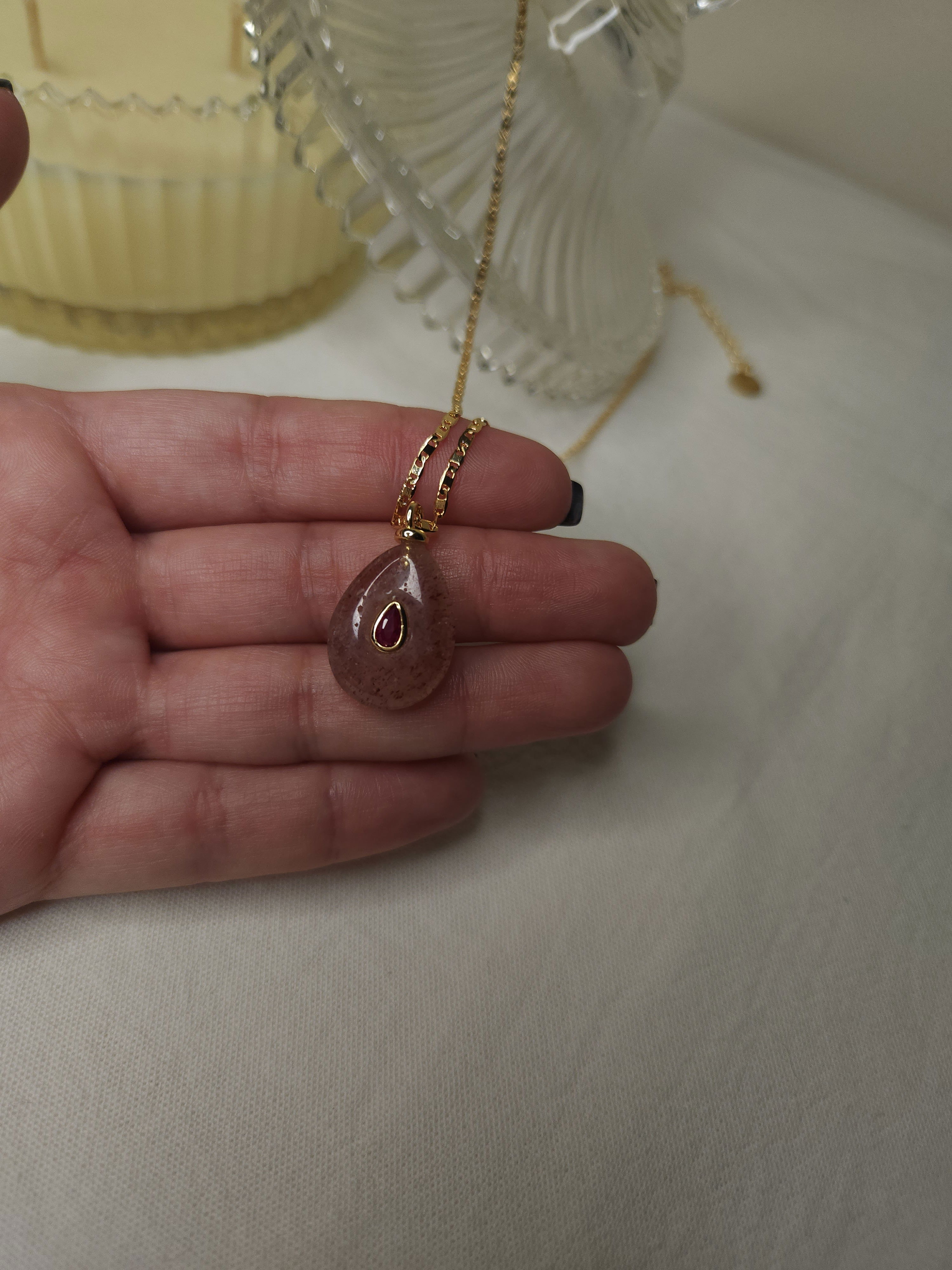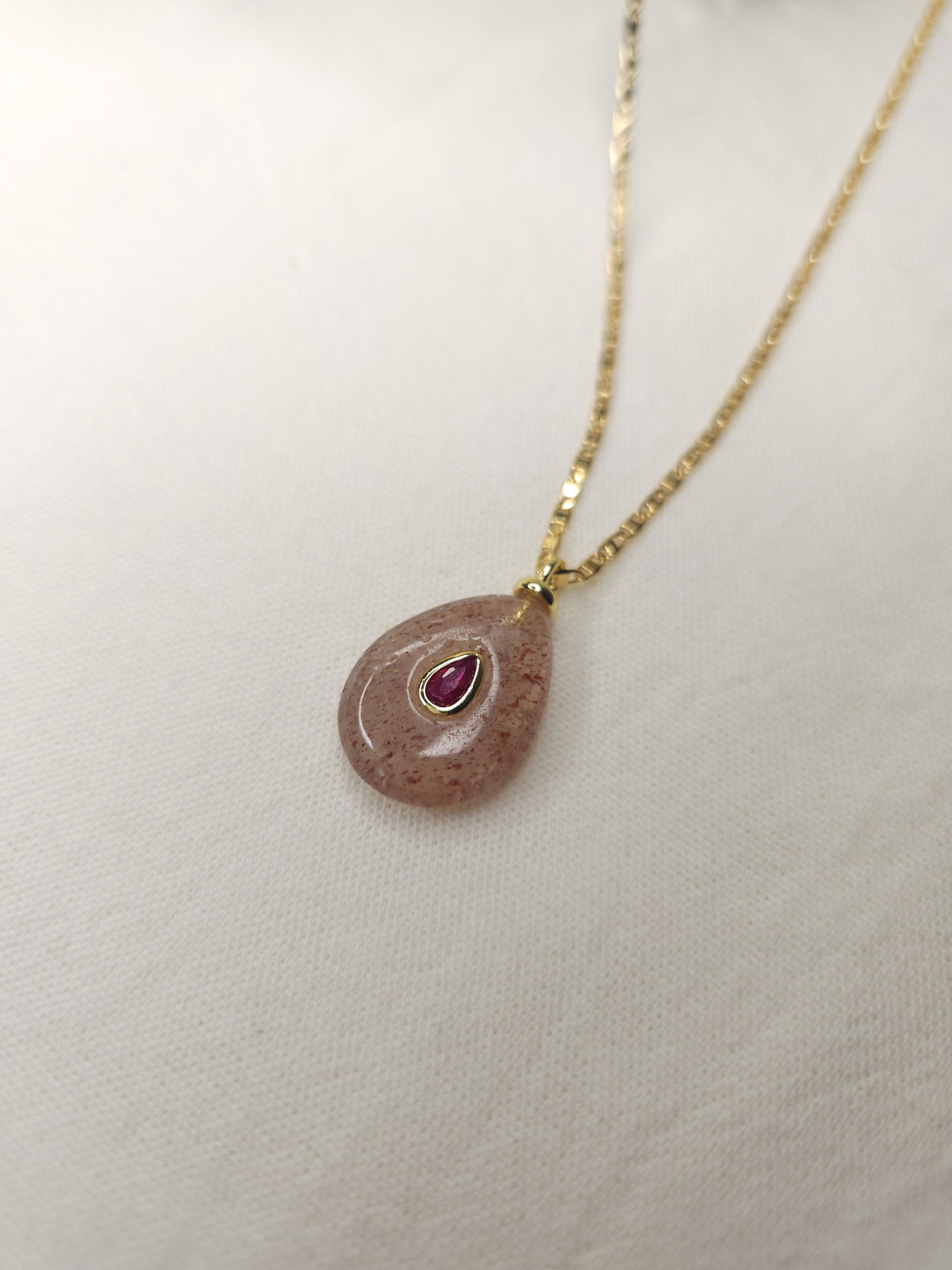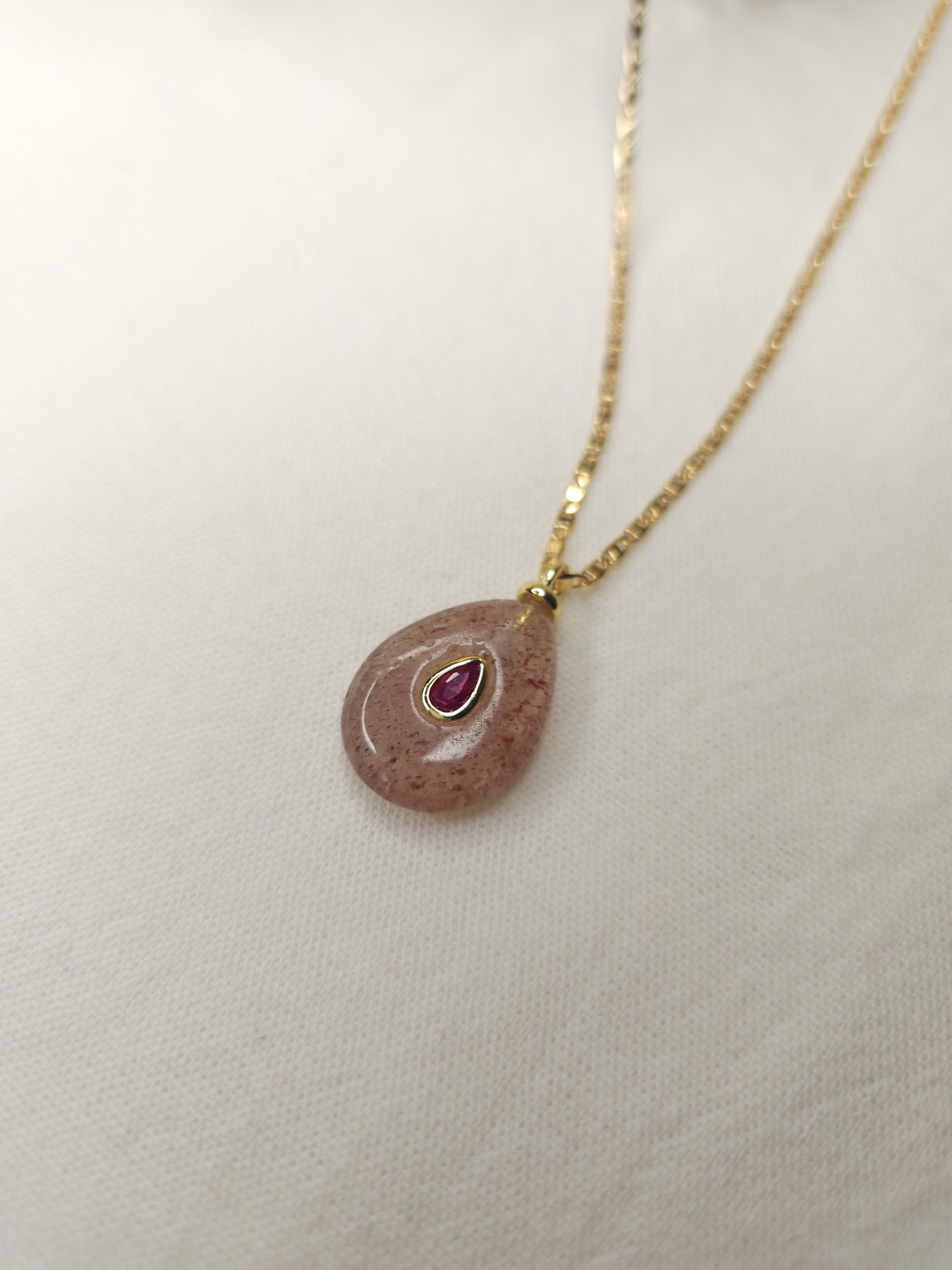 Conjunto en oro laminado con cadena plana de 1,6 mm y dije piedra natural en forma de gota color nude con aplique de 24,7 mm x 15 mm aprox.