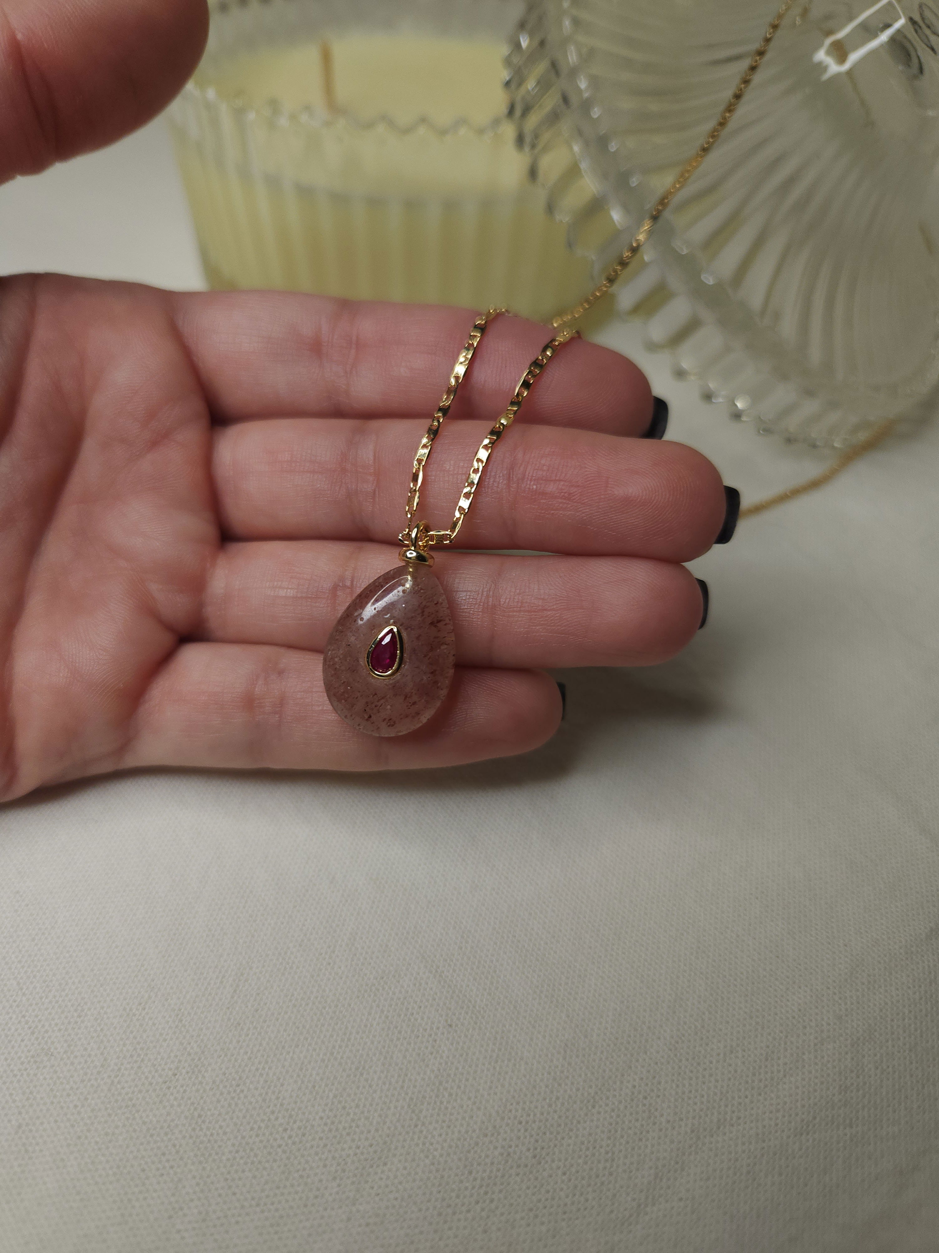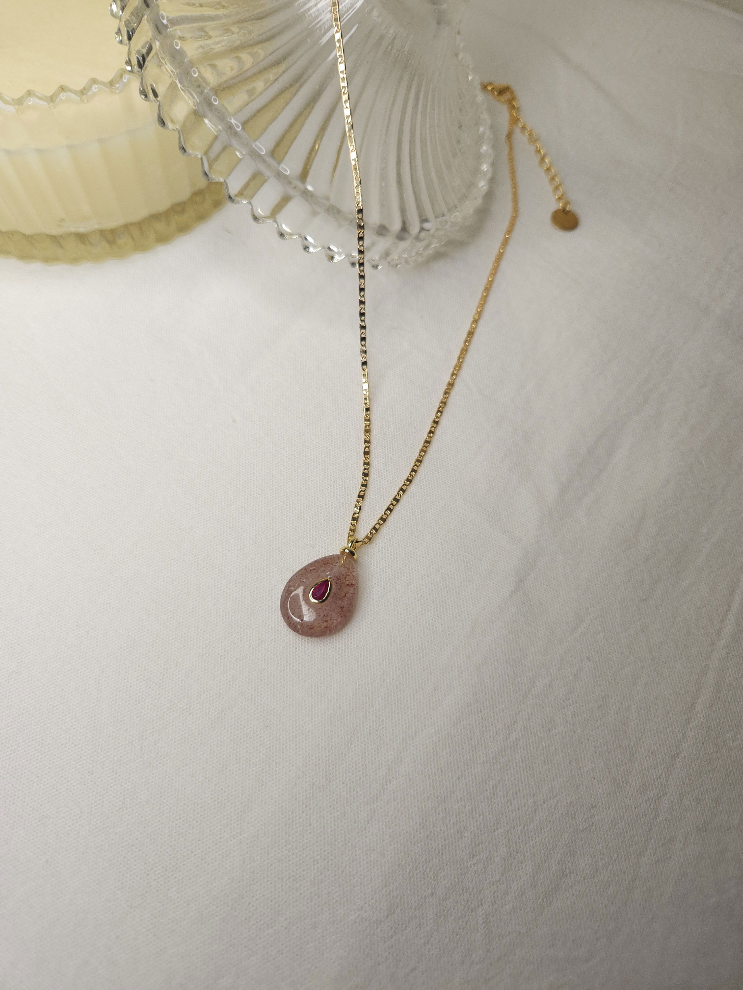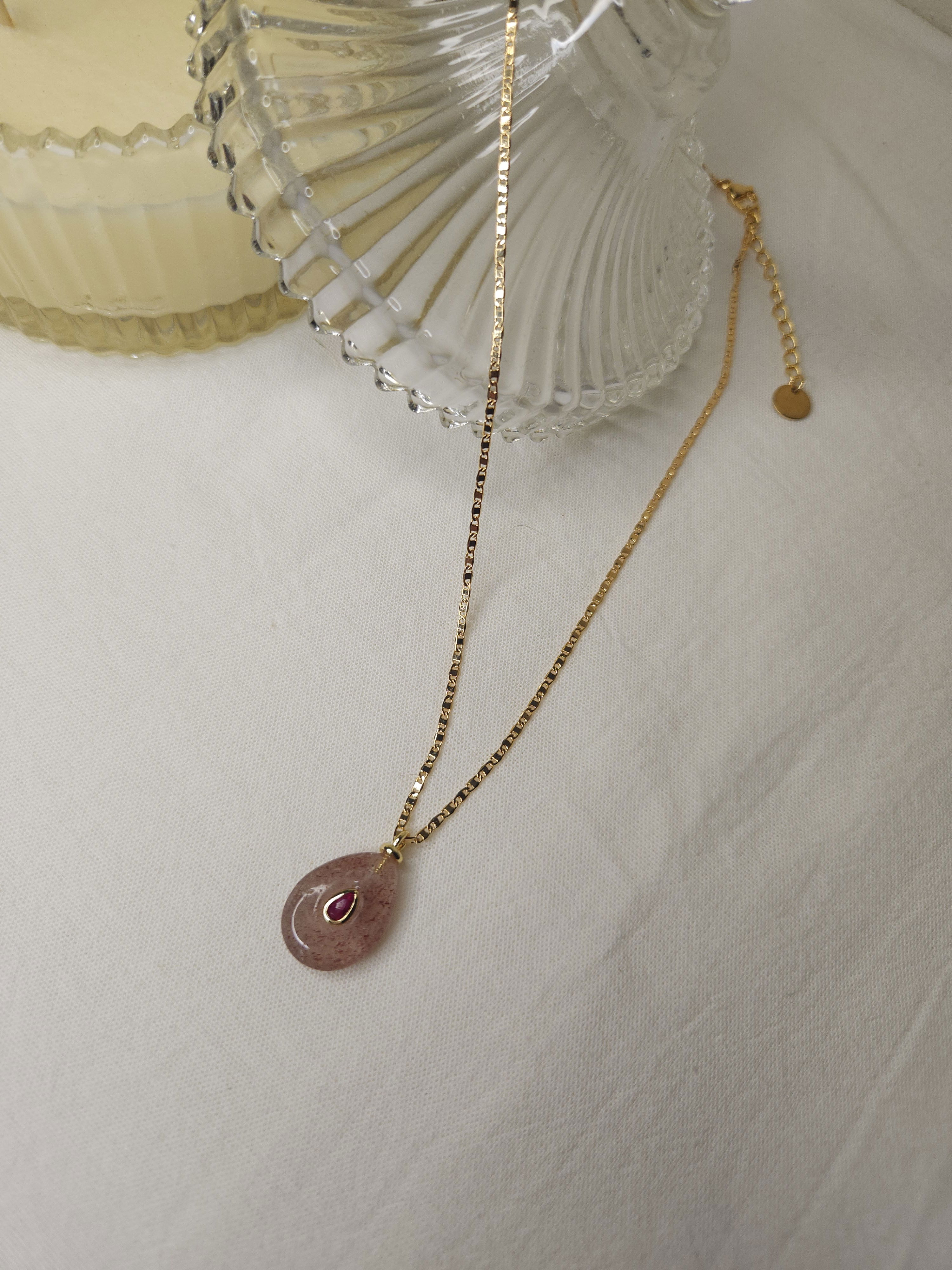 Conjunto en oro laminado con cadena plana de 1,6 mm y dije piedra natural en forma de gota color nude con aplique de 24,7 mm x 15 mm aprox.