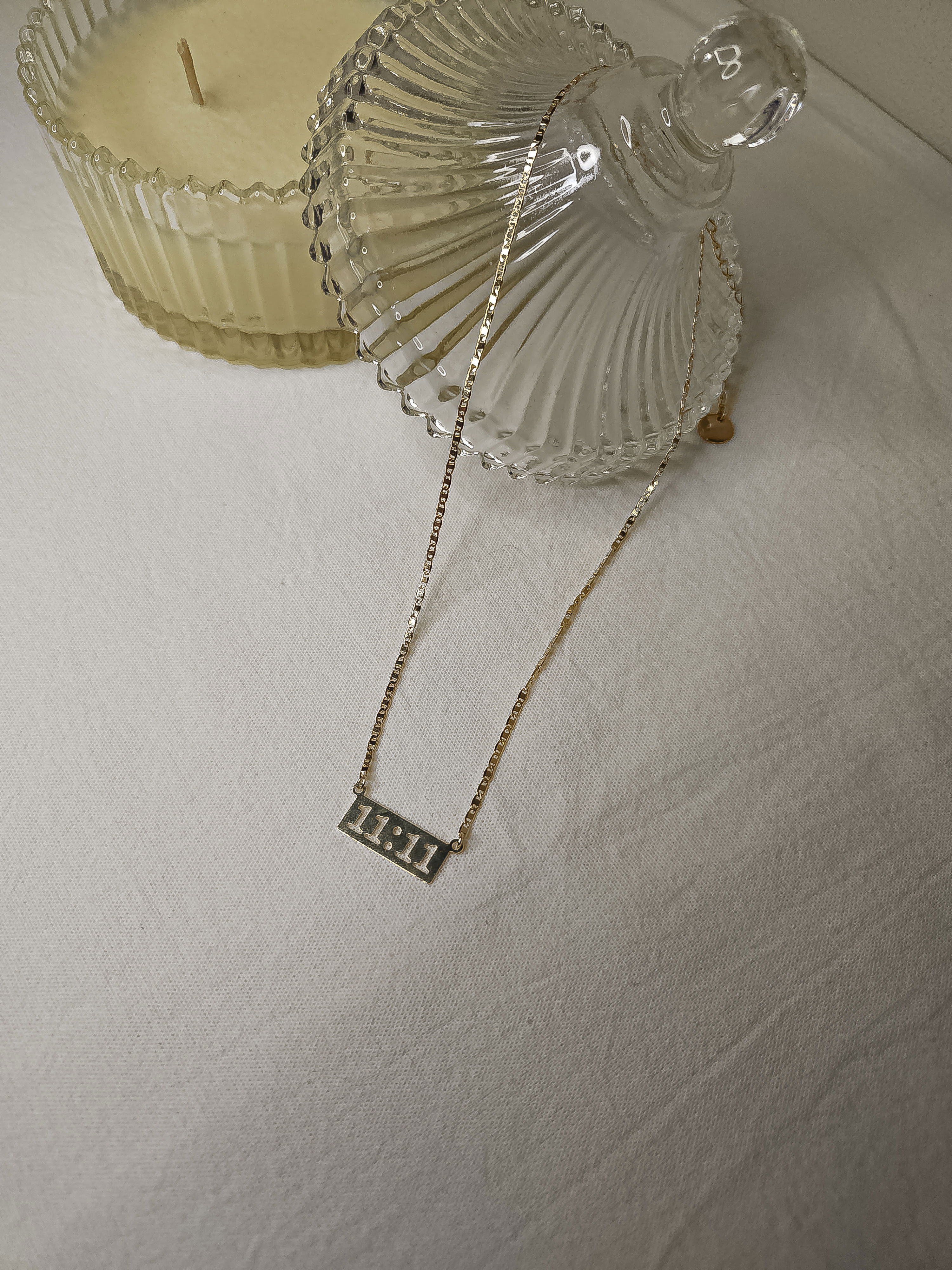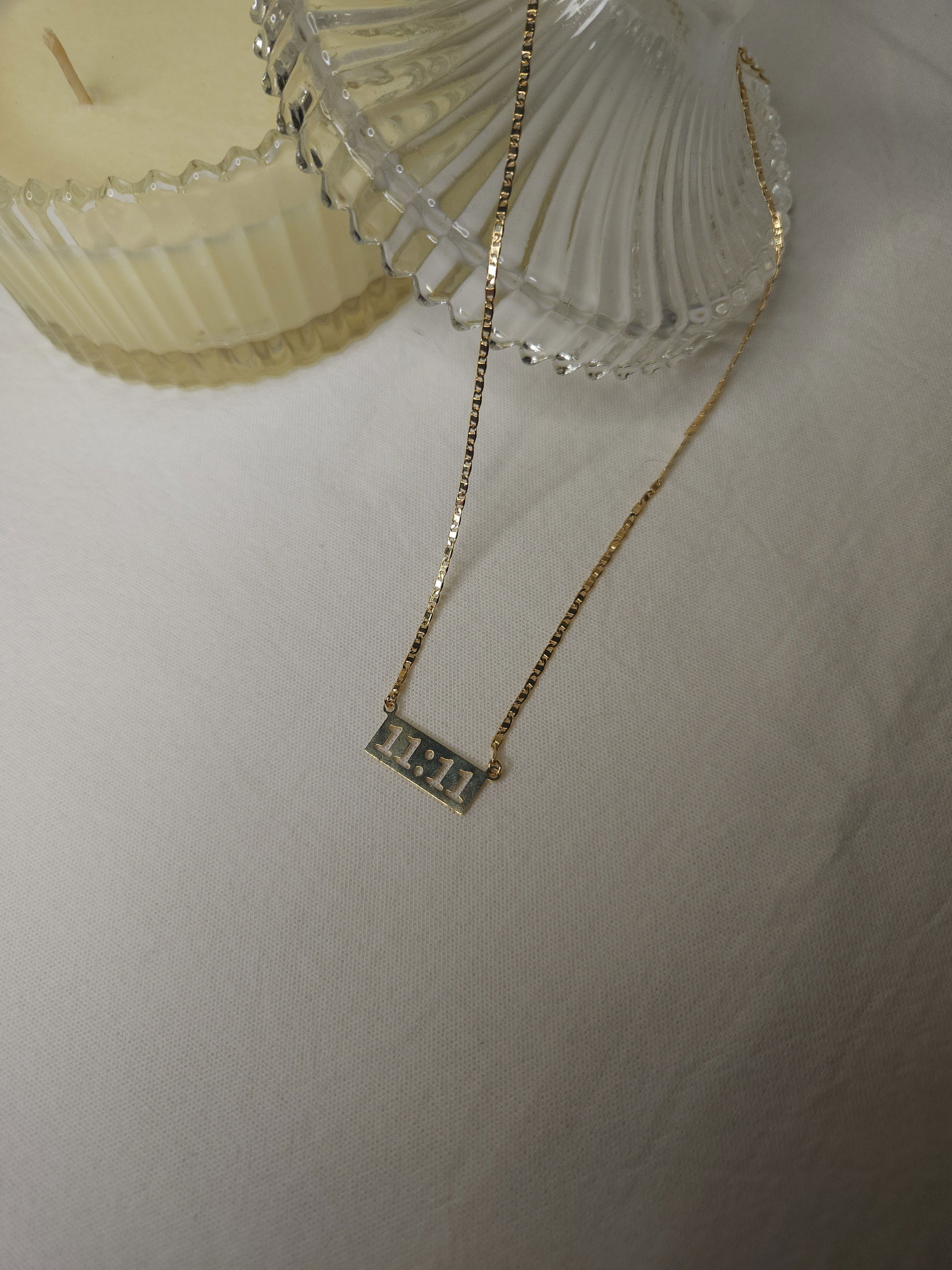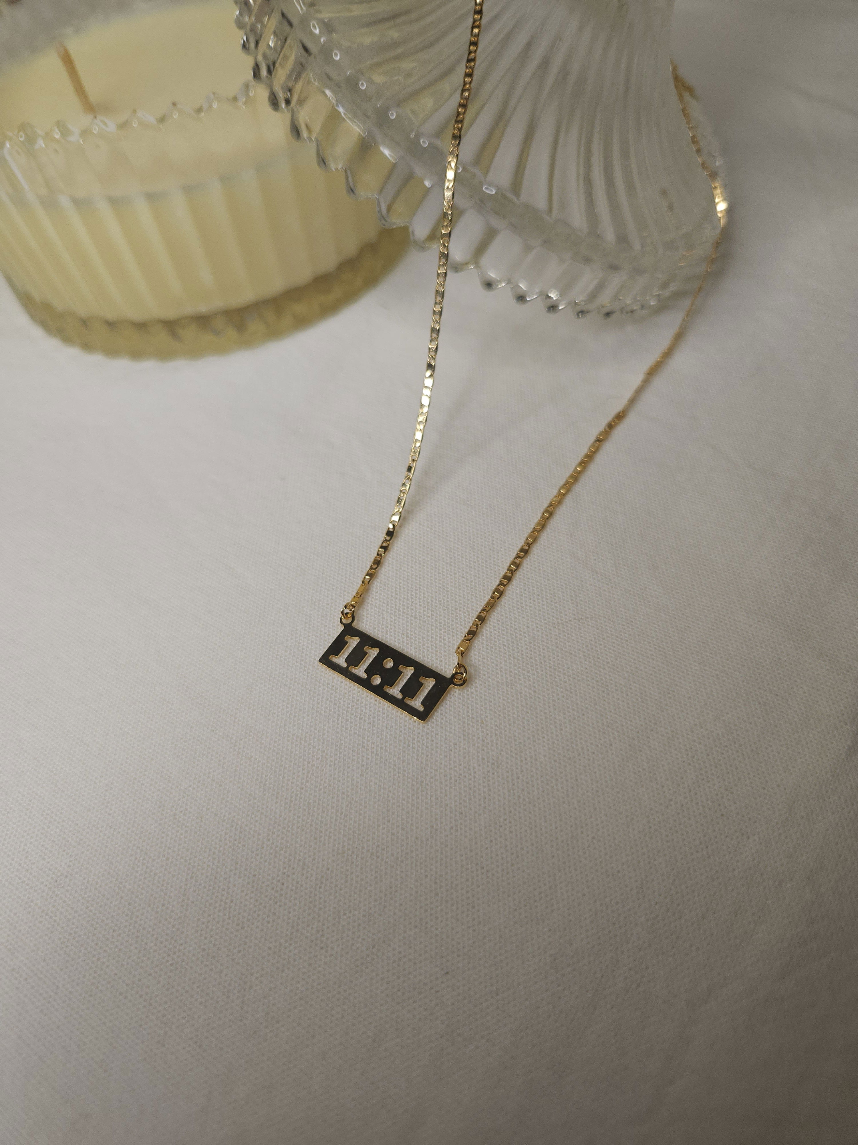 Conjunto en oro laminado con cadena plana de 1,6 mm y dije placa 11:11 de 23 mm x 9,4 mm.