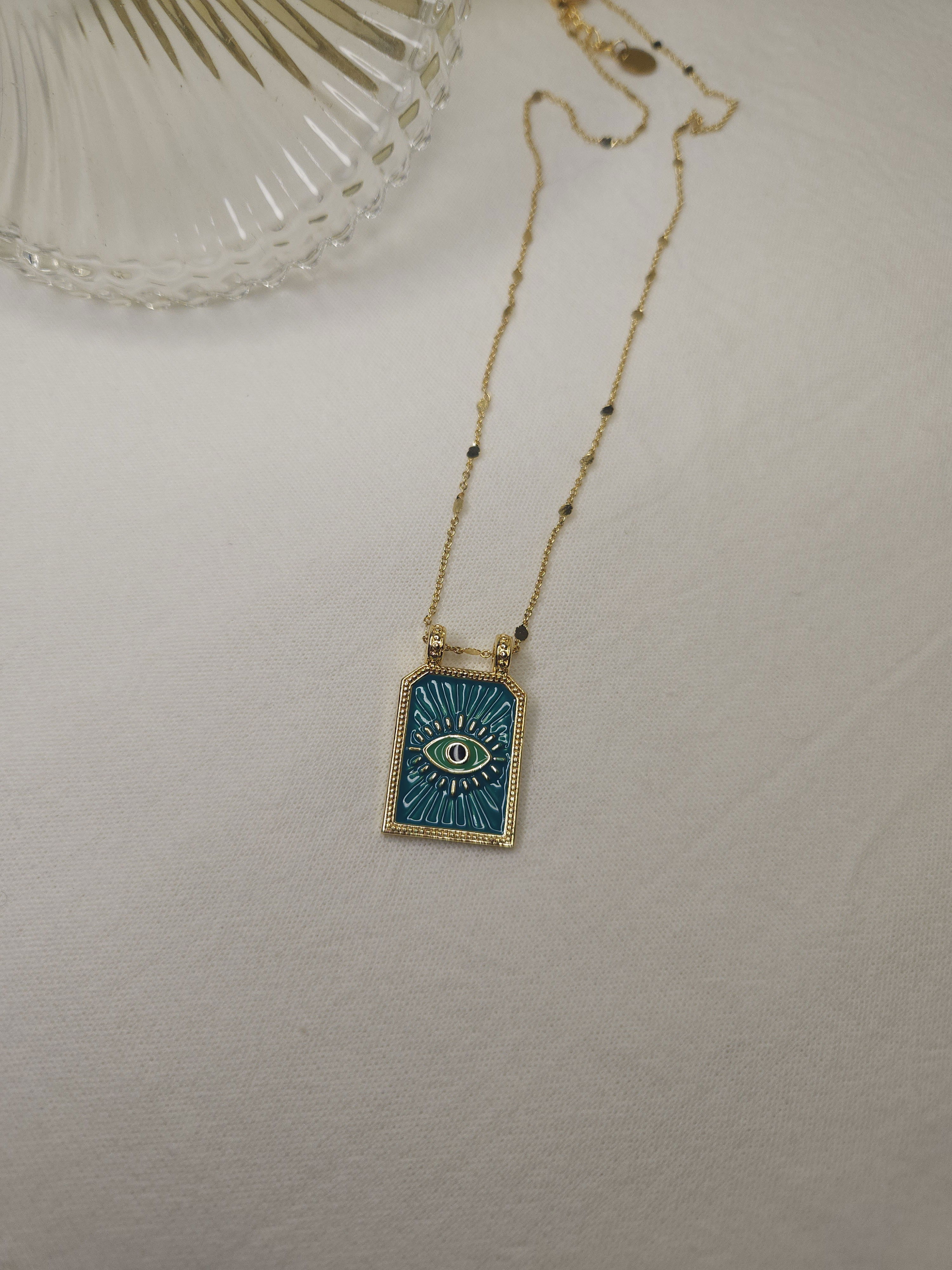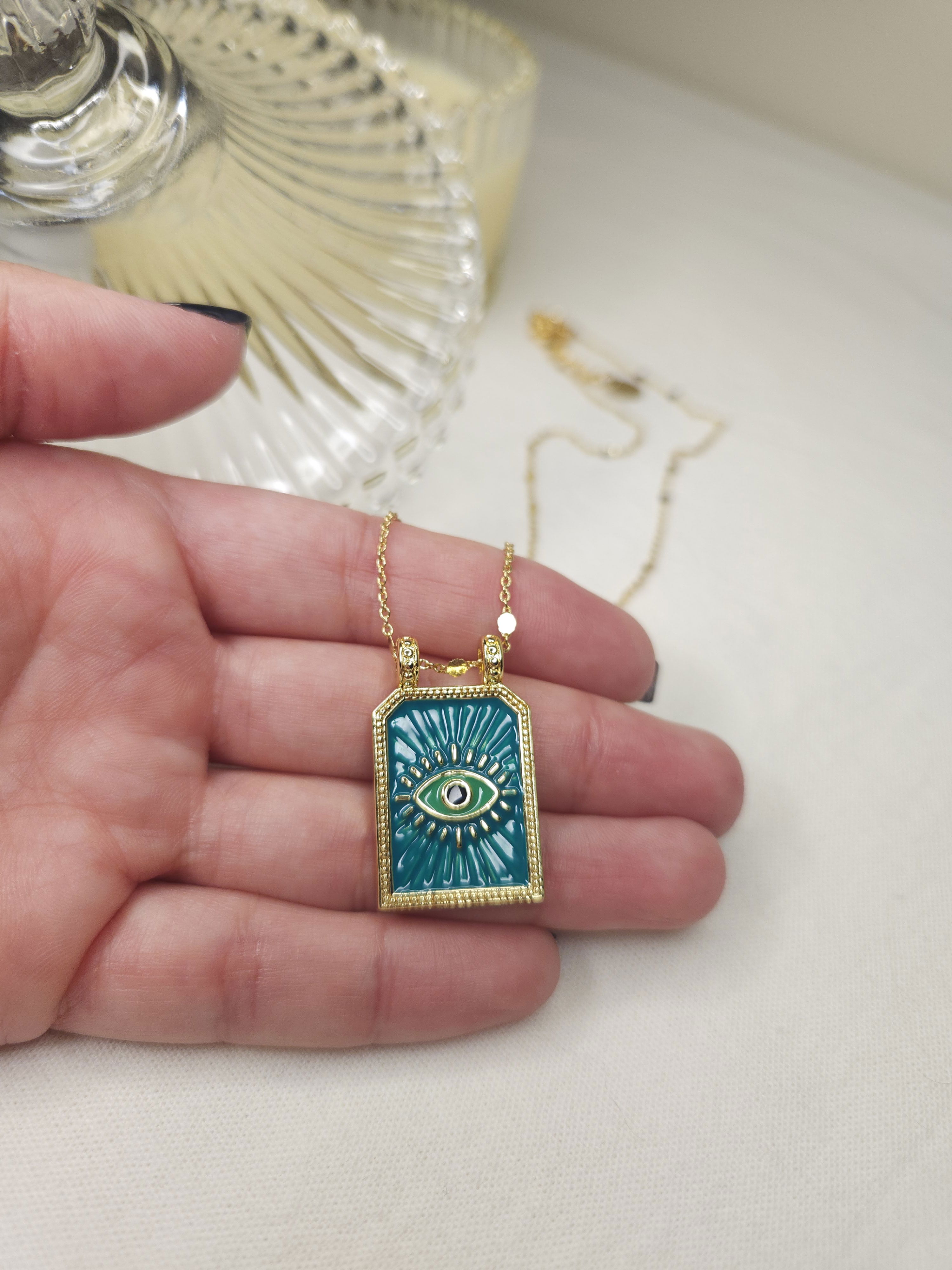Conjunto en oro laminado con cadena destello finita y dije placa esmaltado ojito en color verde.