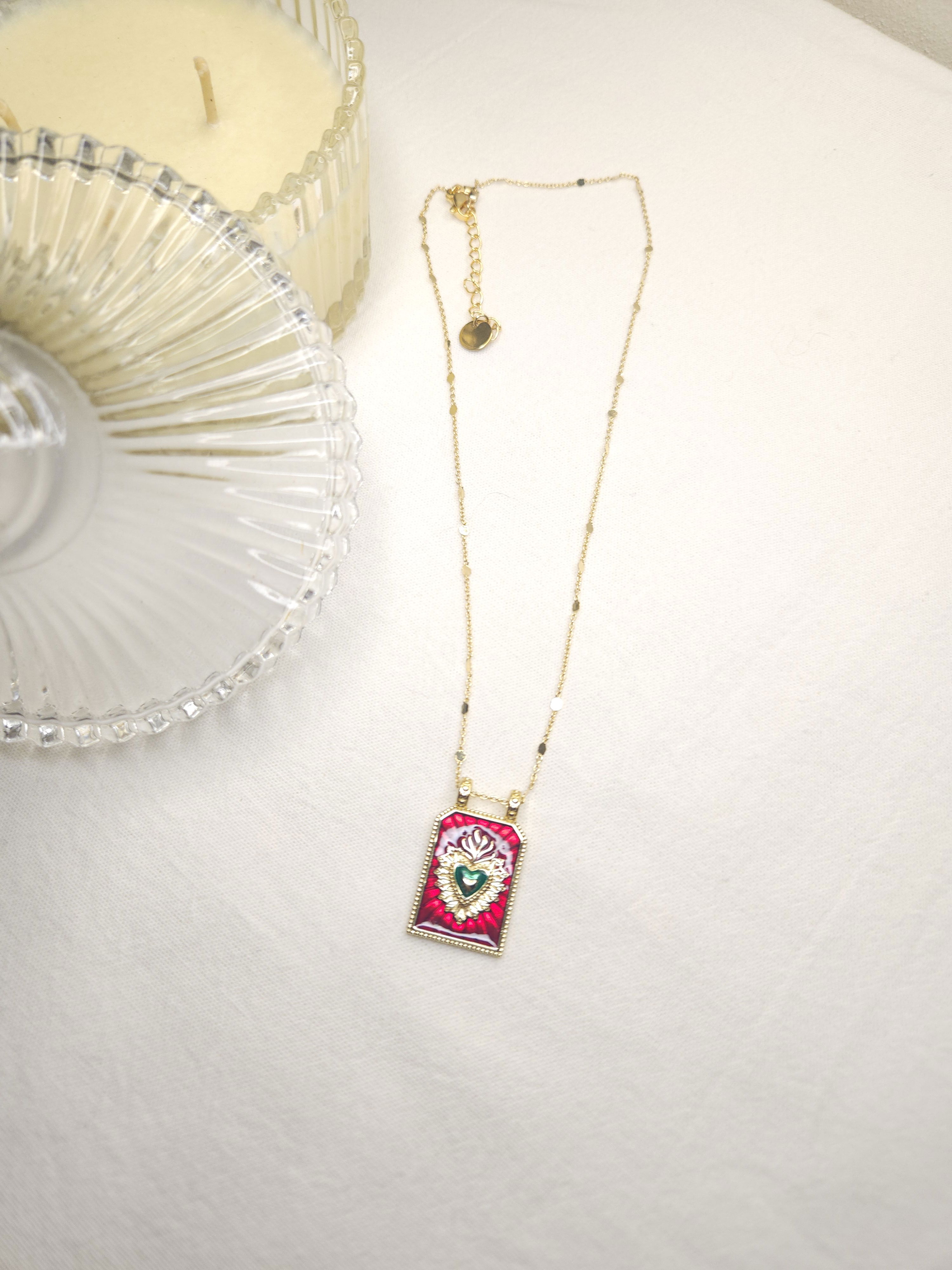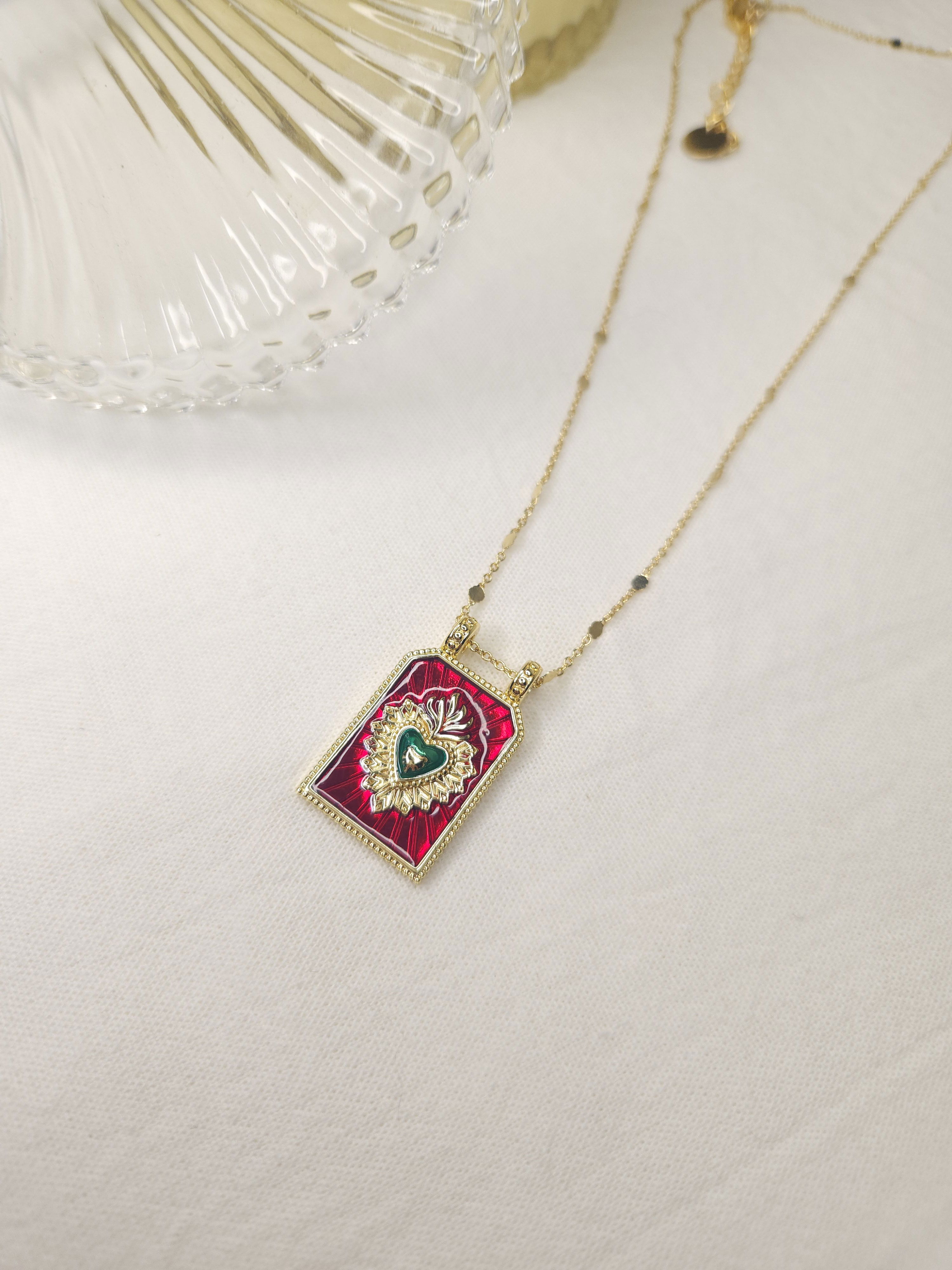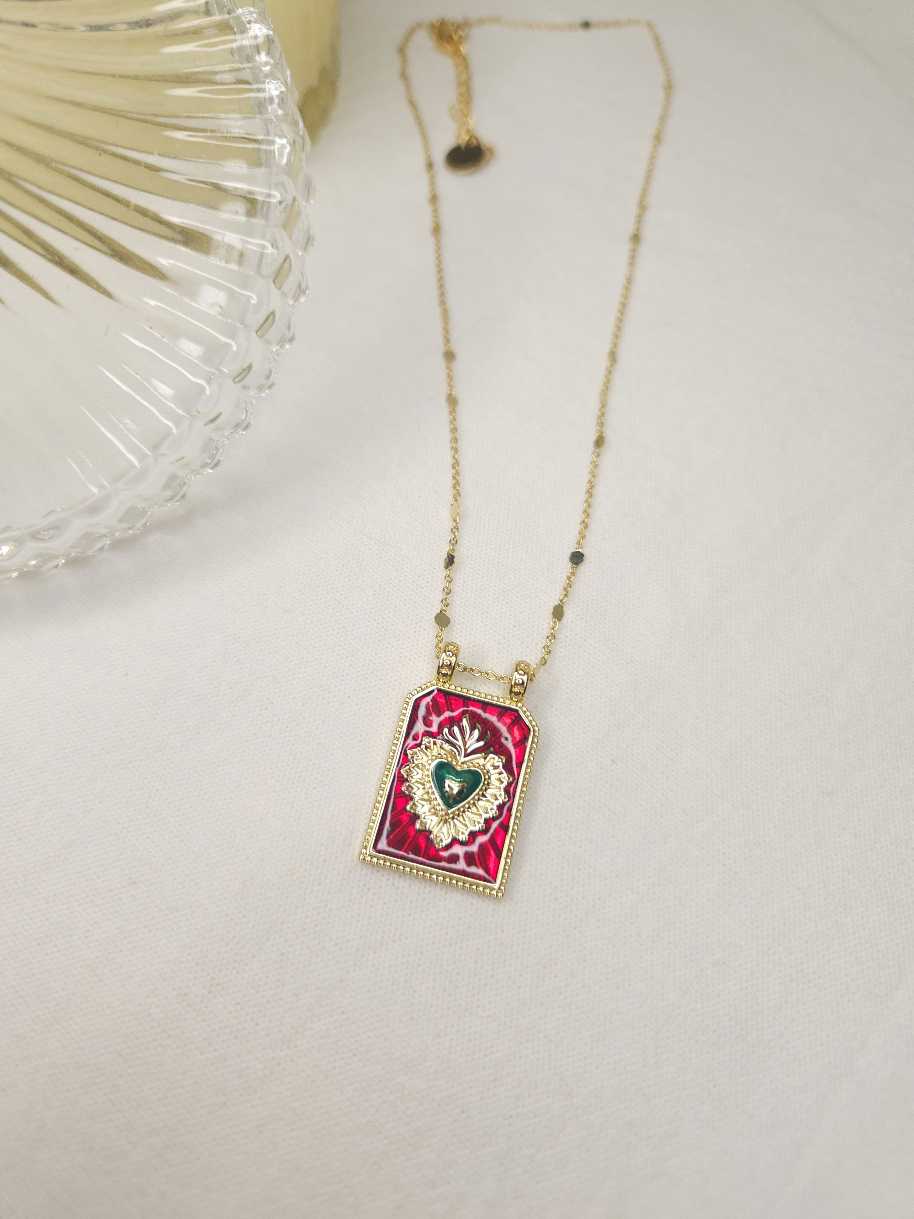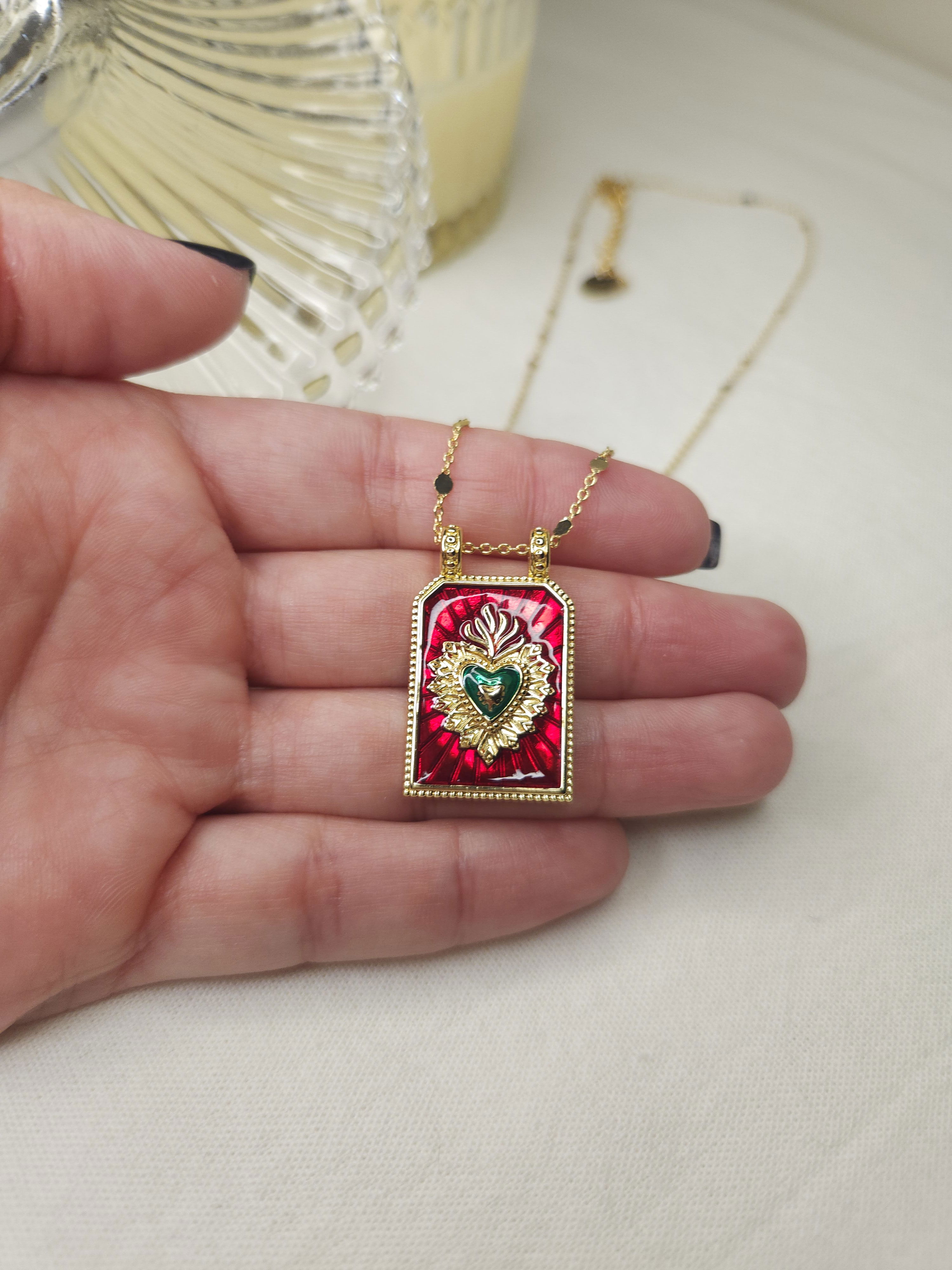 Conjunto en oro laminado con cadena destello finita y dije placa esmaltado corazón verde y rojo.
