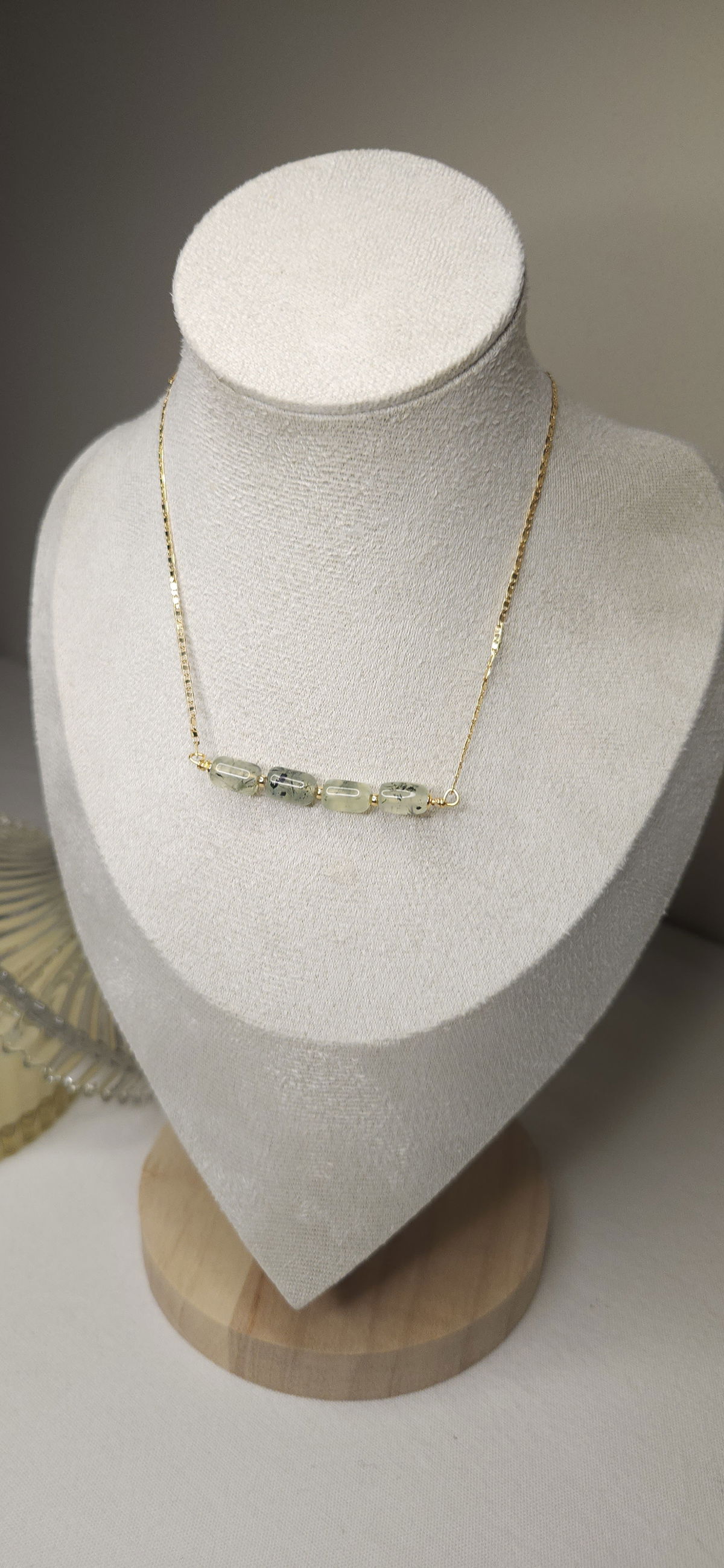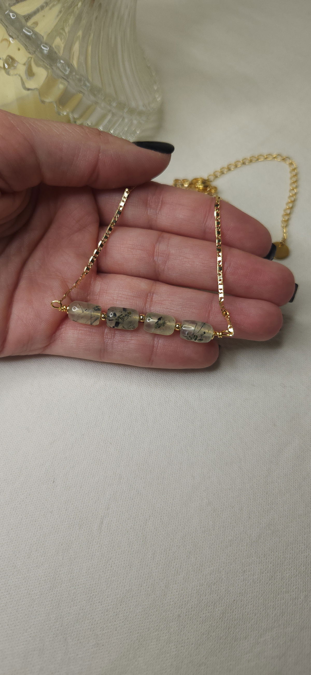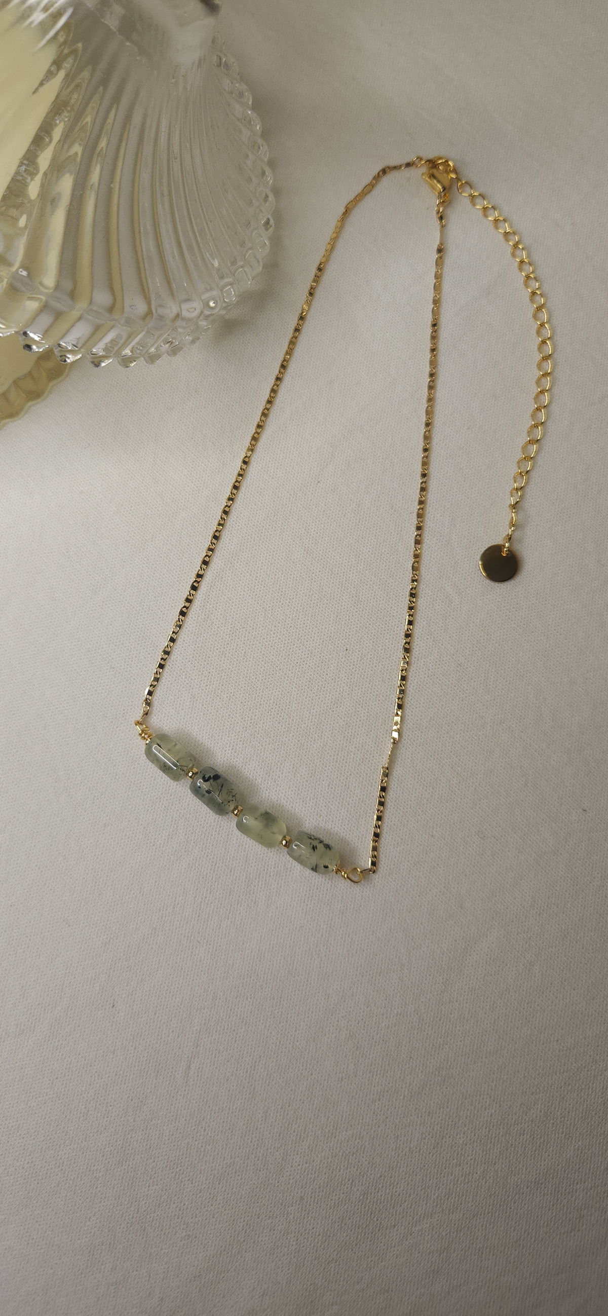 Conjunto realizado con cadena en oro laminado + dijes piedras natural prehnita, y separadores en oro laminado.
