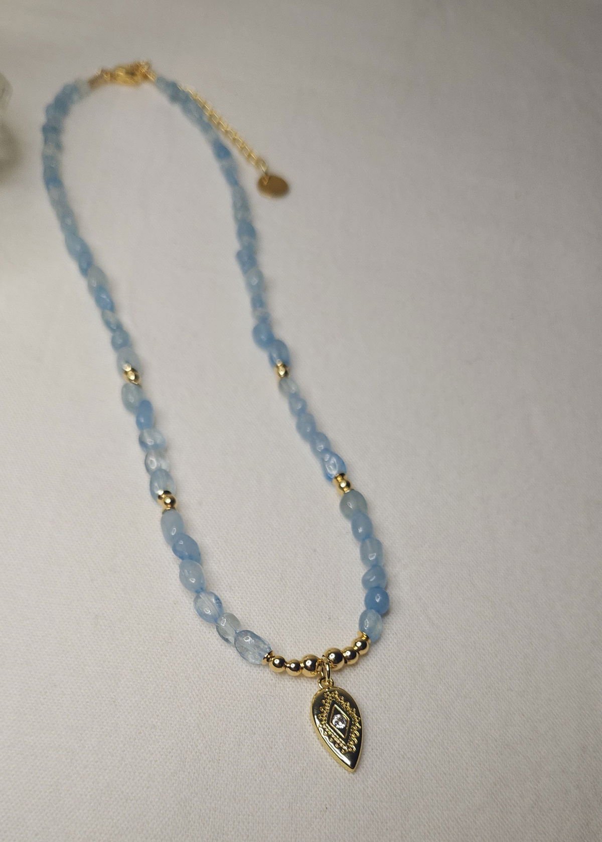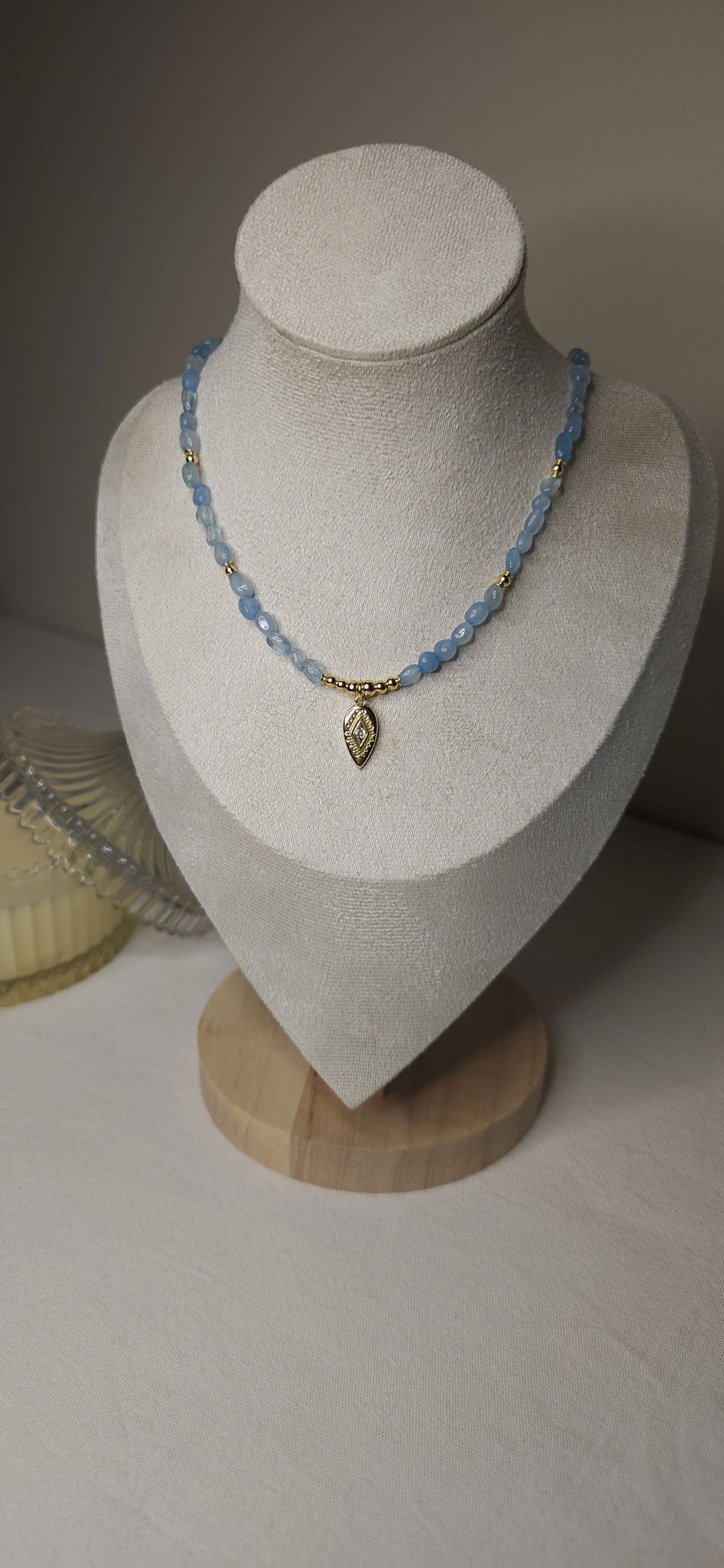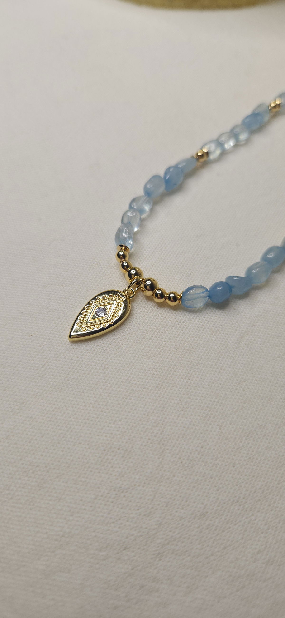 - La Aguamarina calma, mientras el Ojo Turco protege. Resultado: un amuleto que te hace sentir liviana, segura y en paz.