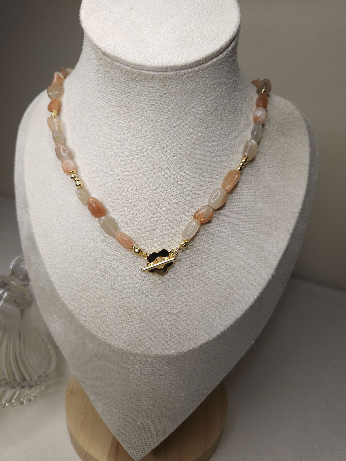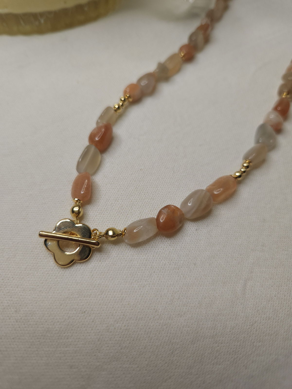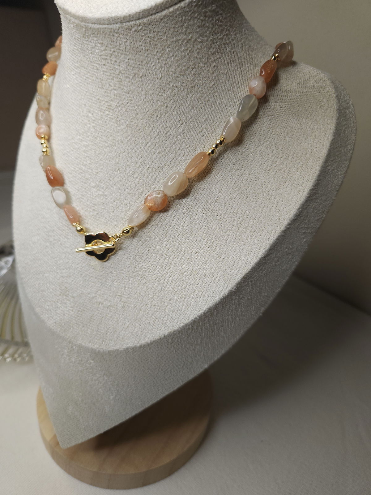 Conjunto realizado con piedras naturales semillas solar grado B de 5-12mm + broche en forma de flor + detalles y terminaciones todo en oro laminado hipoalergenico. Se prende del broche.