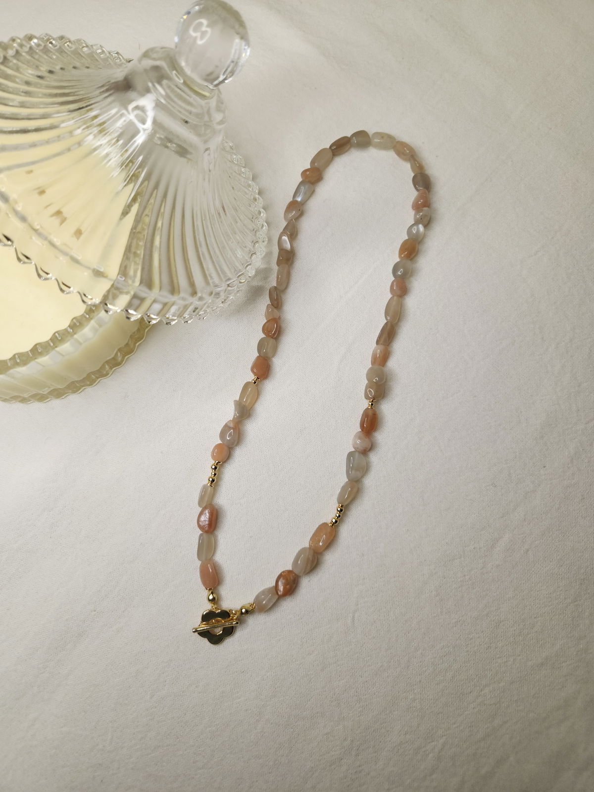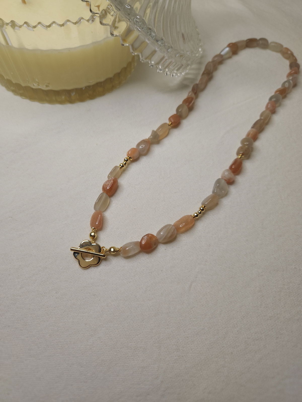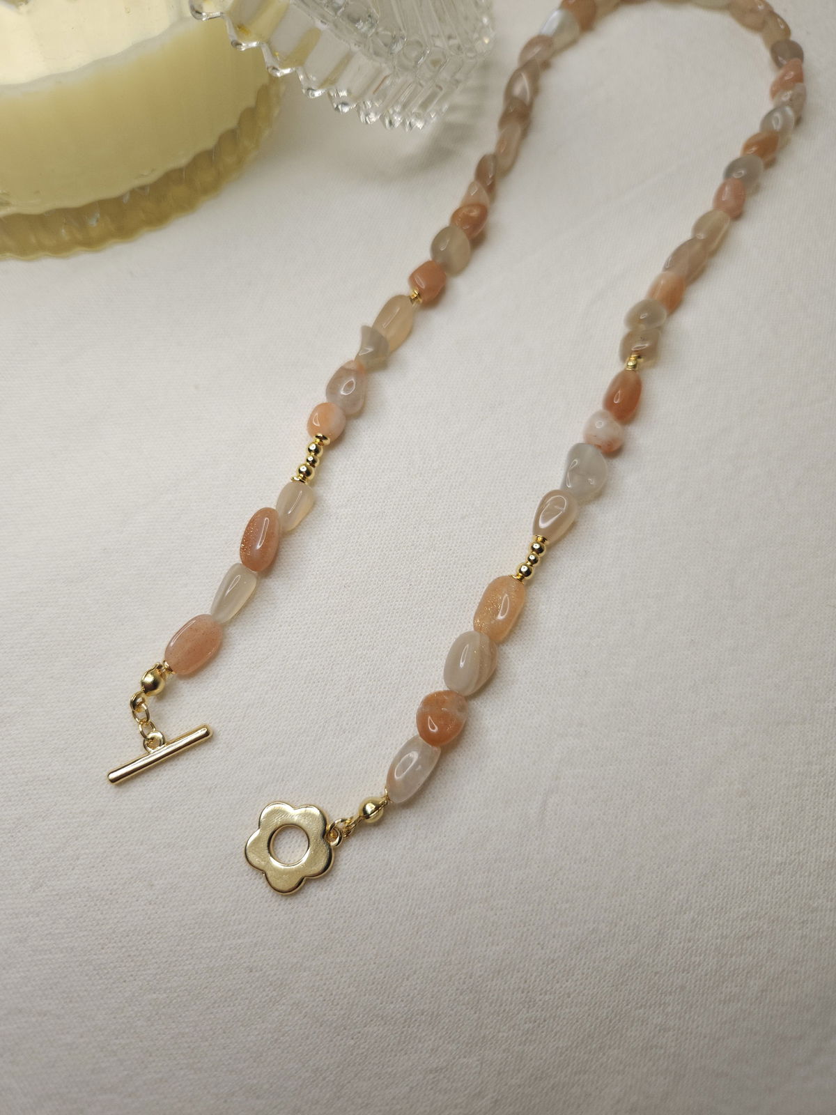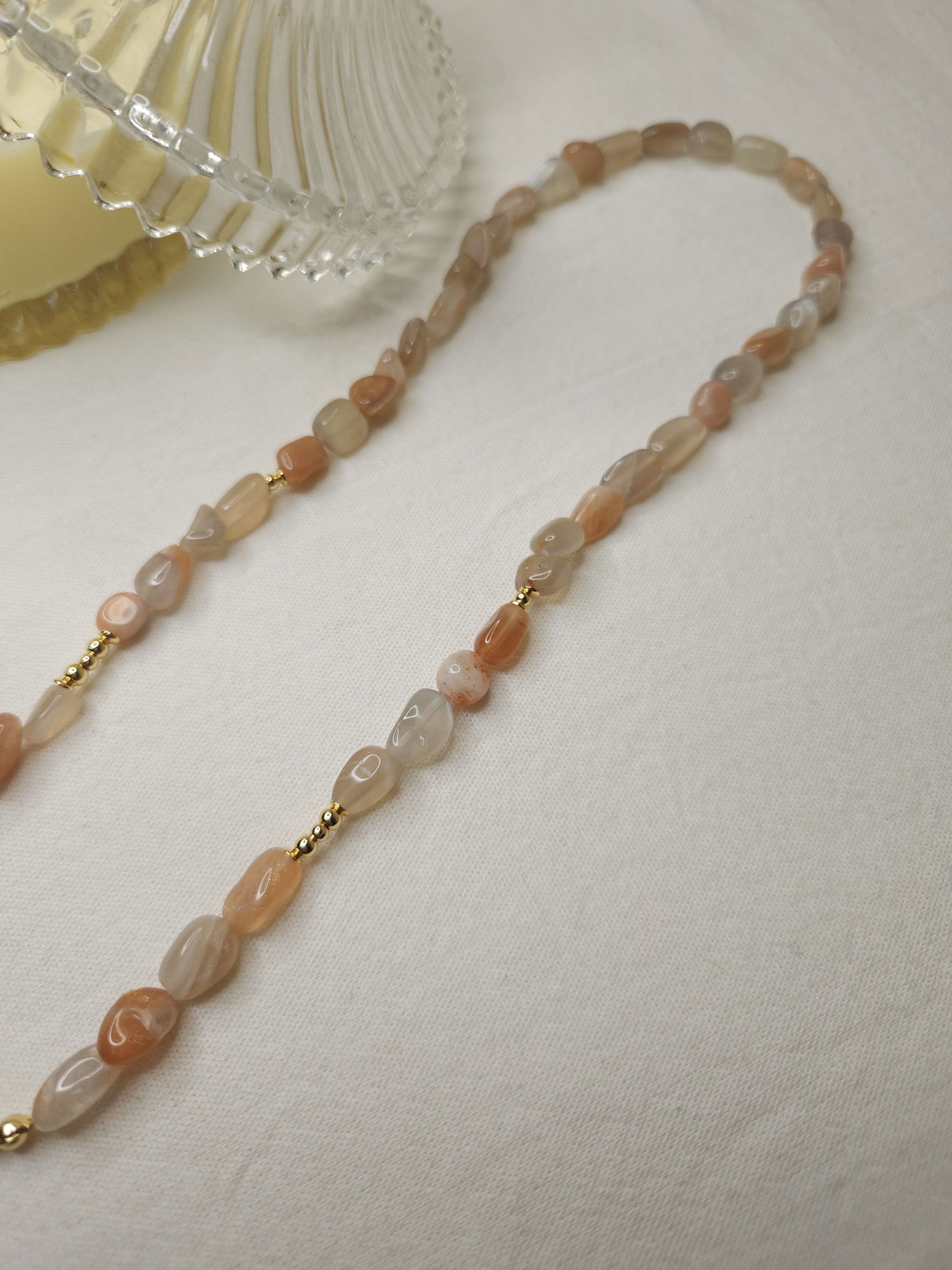 Conjunto realizado con piedras naturales semillas solar grado B de 5-12mm + broche en forma de flor + detalles y terminaciones todo en oro laminado hipoalergenico. Se prende del broche.