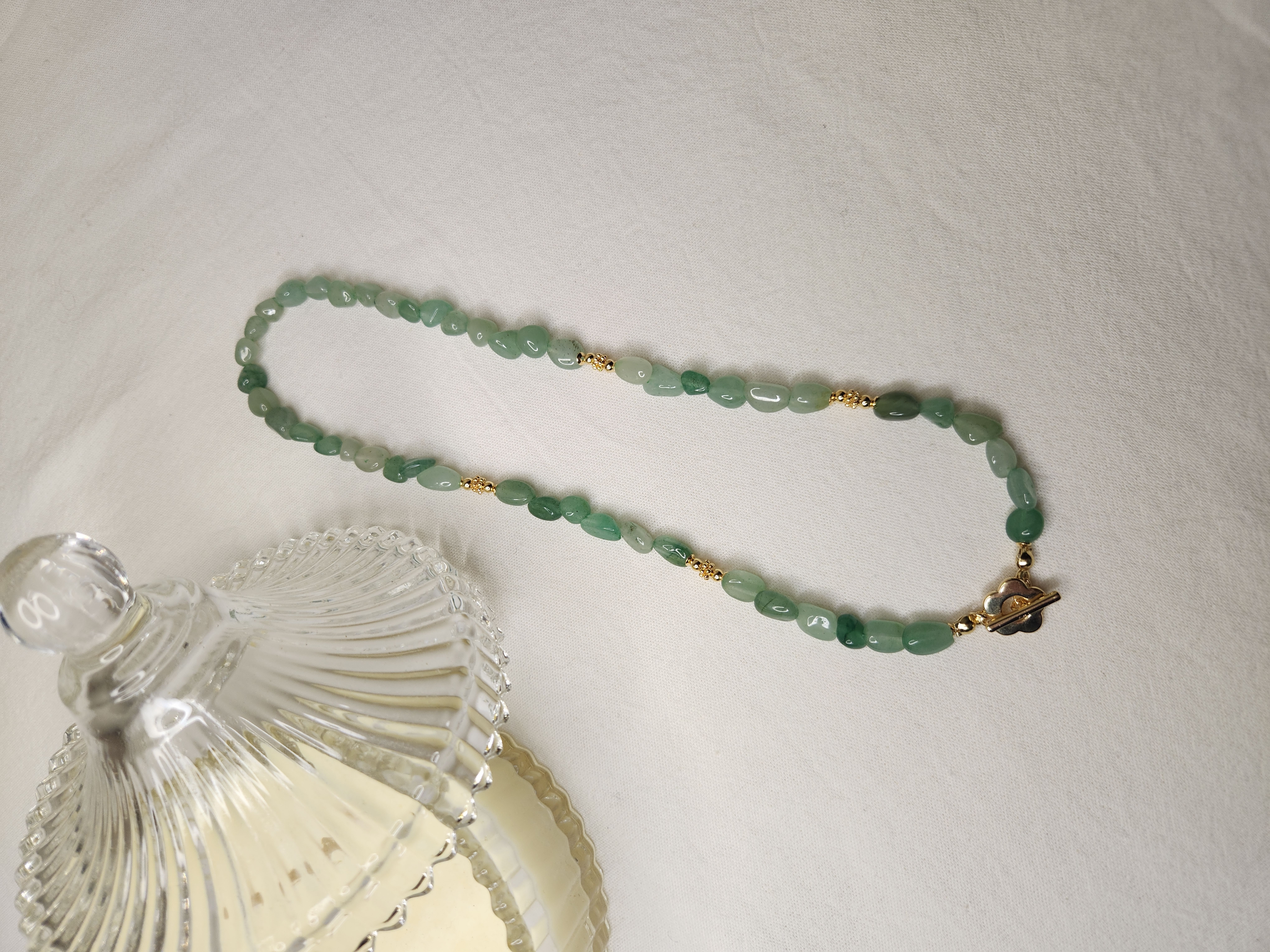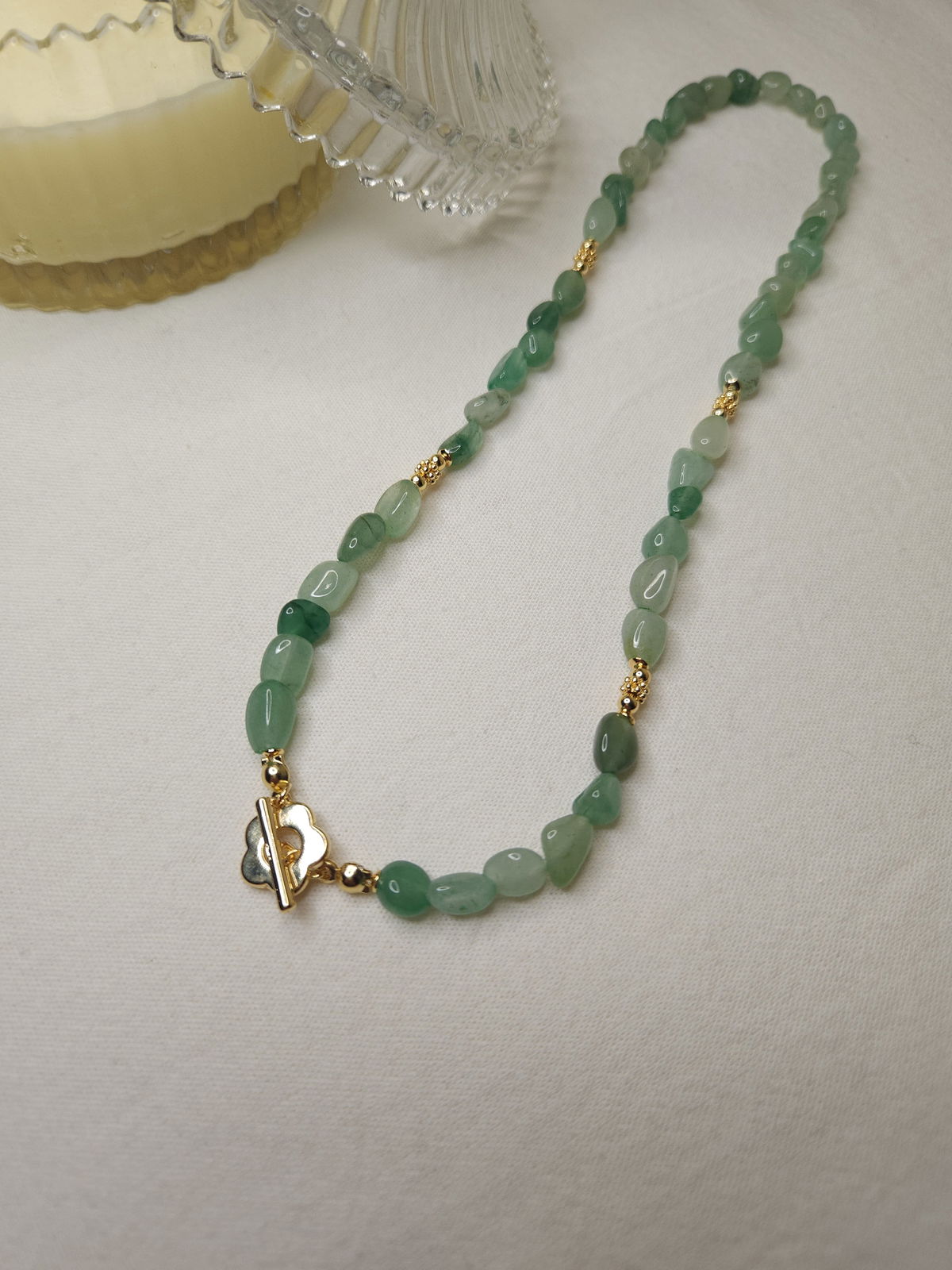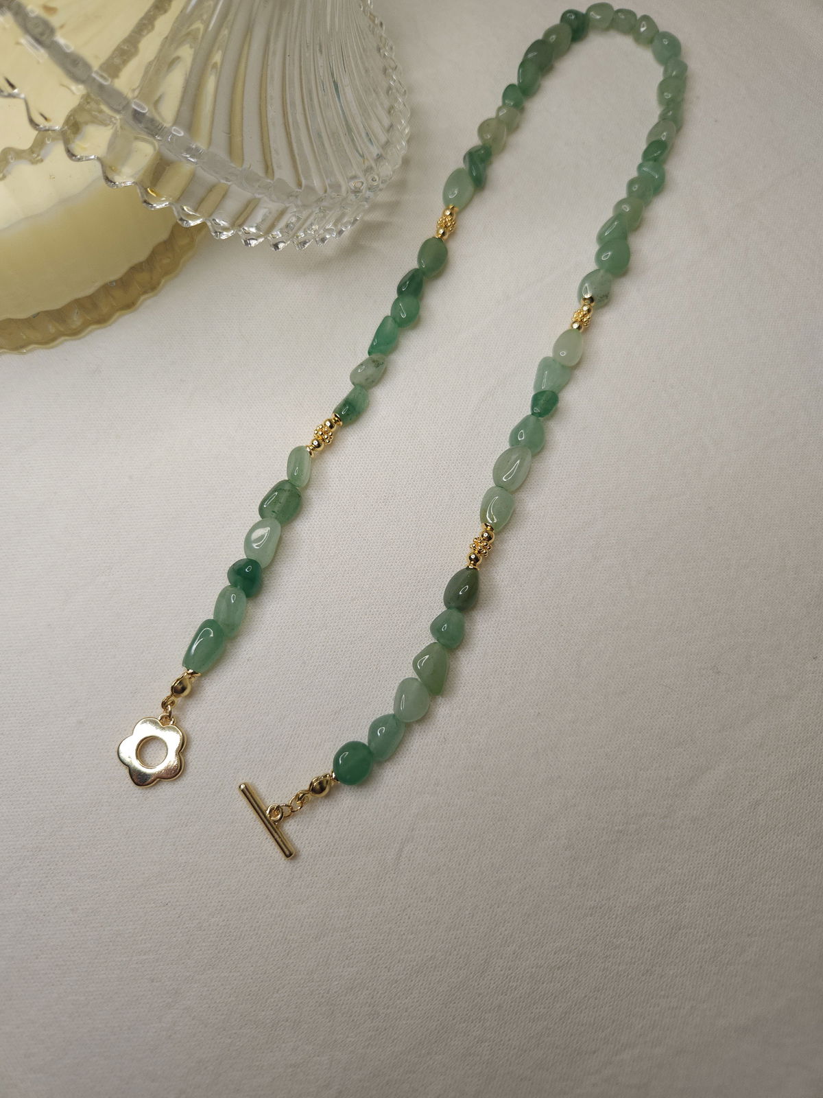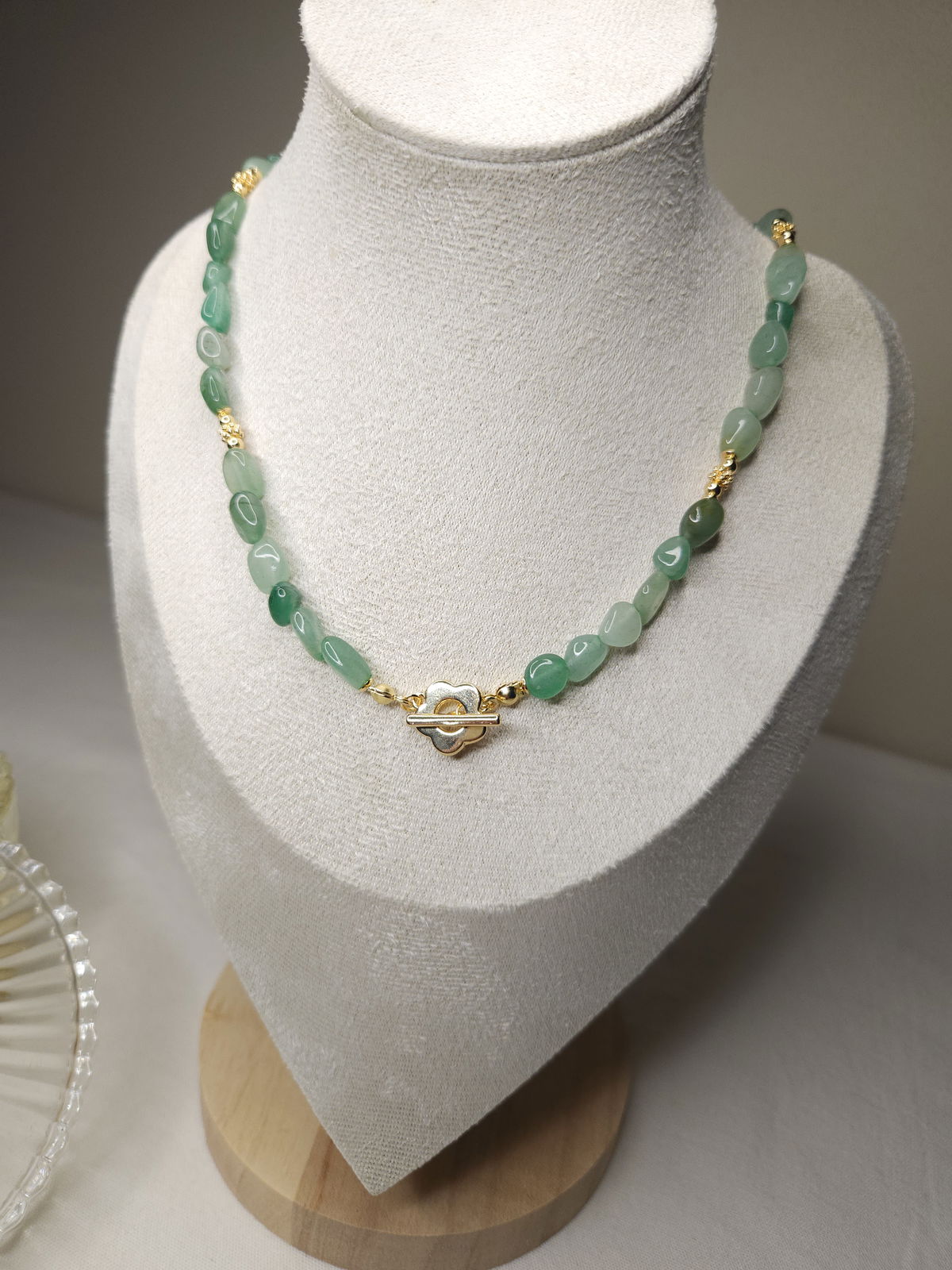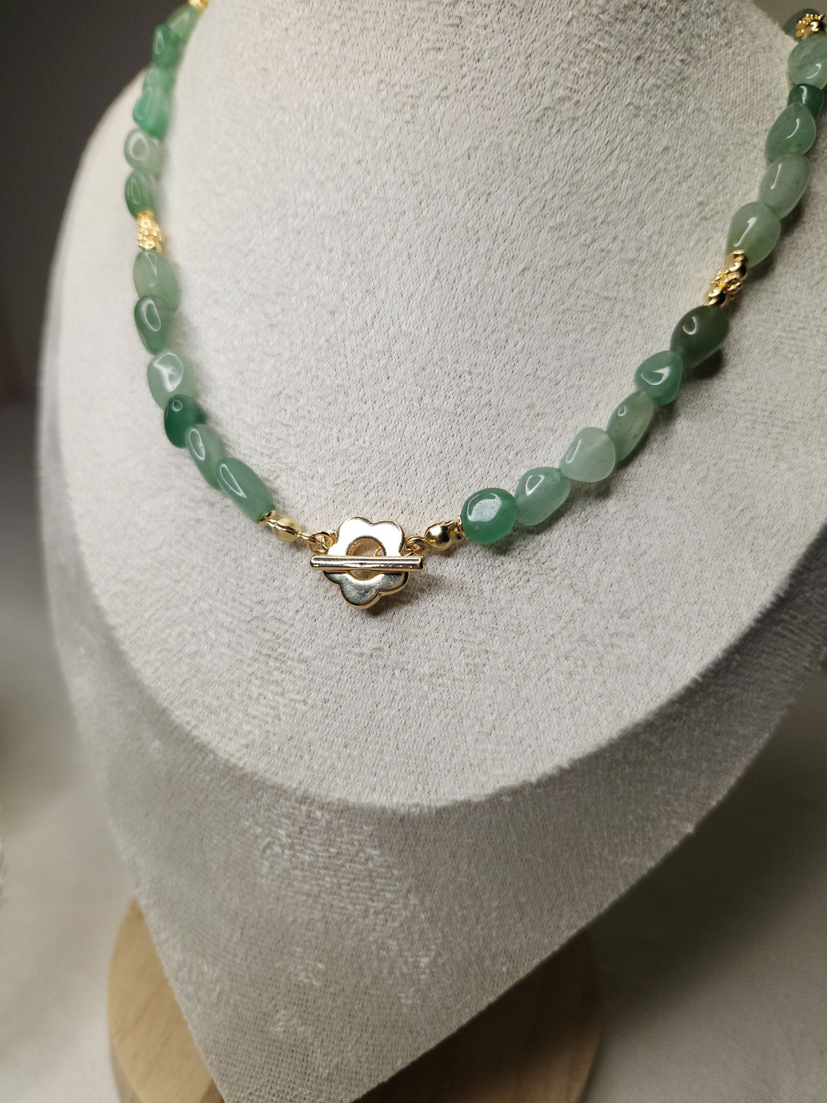 Conjunto realizado con piedras naturales semillas Aventurina de 5-12mm + broche en forma de flor + detalles y terminaciones todo en oro laminado hipoalergenico. Se prende del broche.
