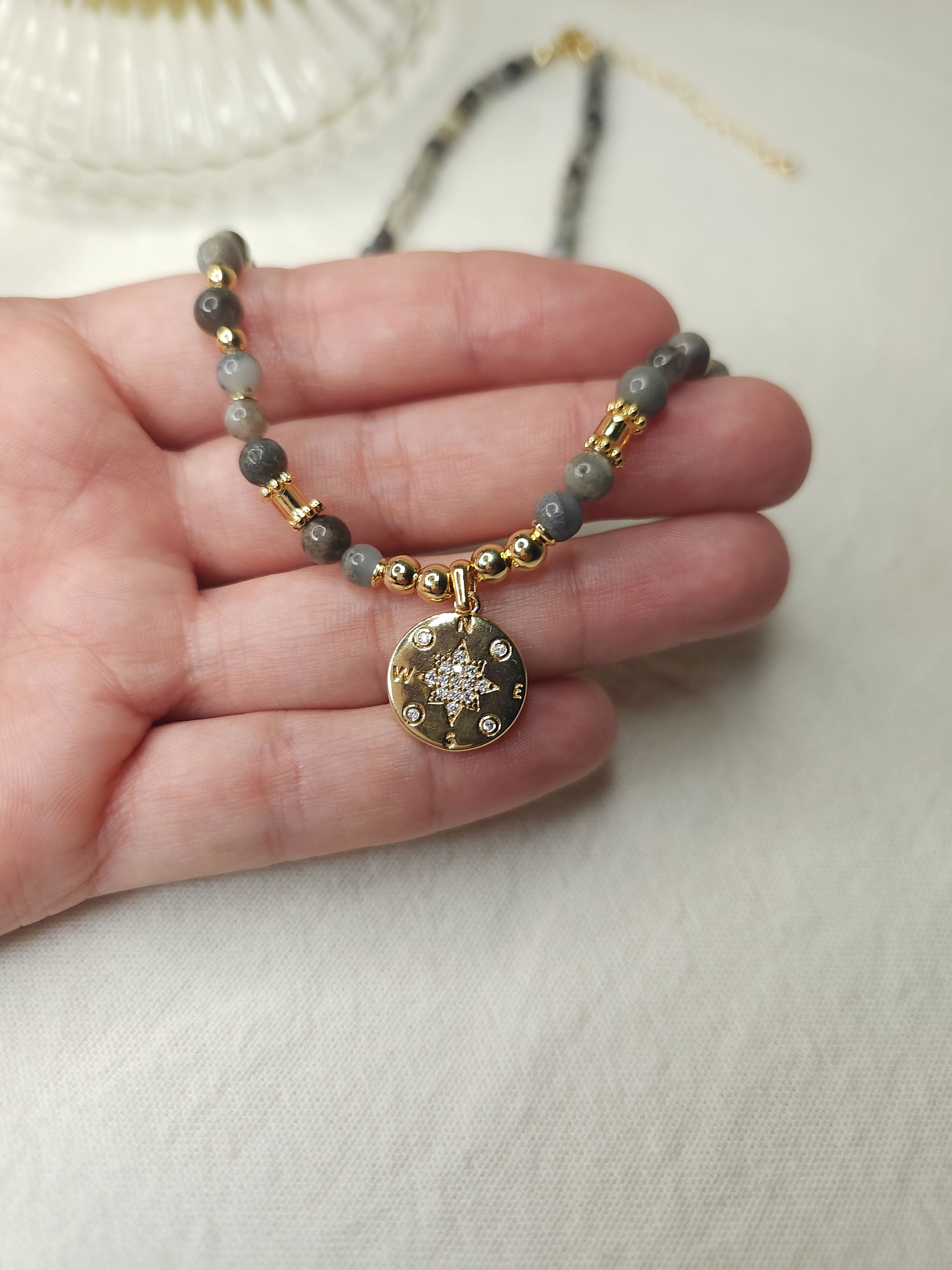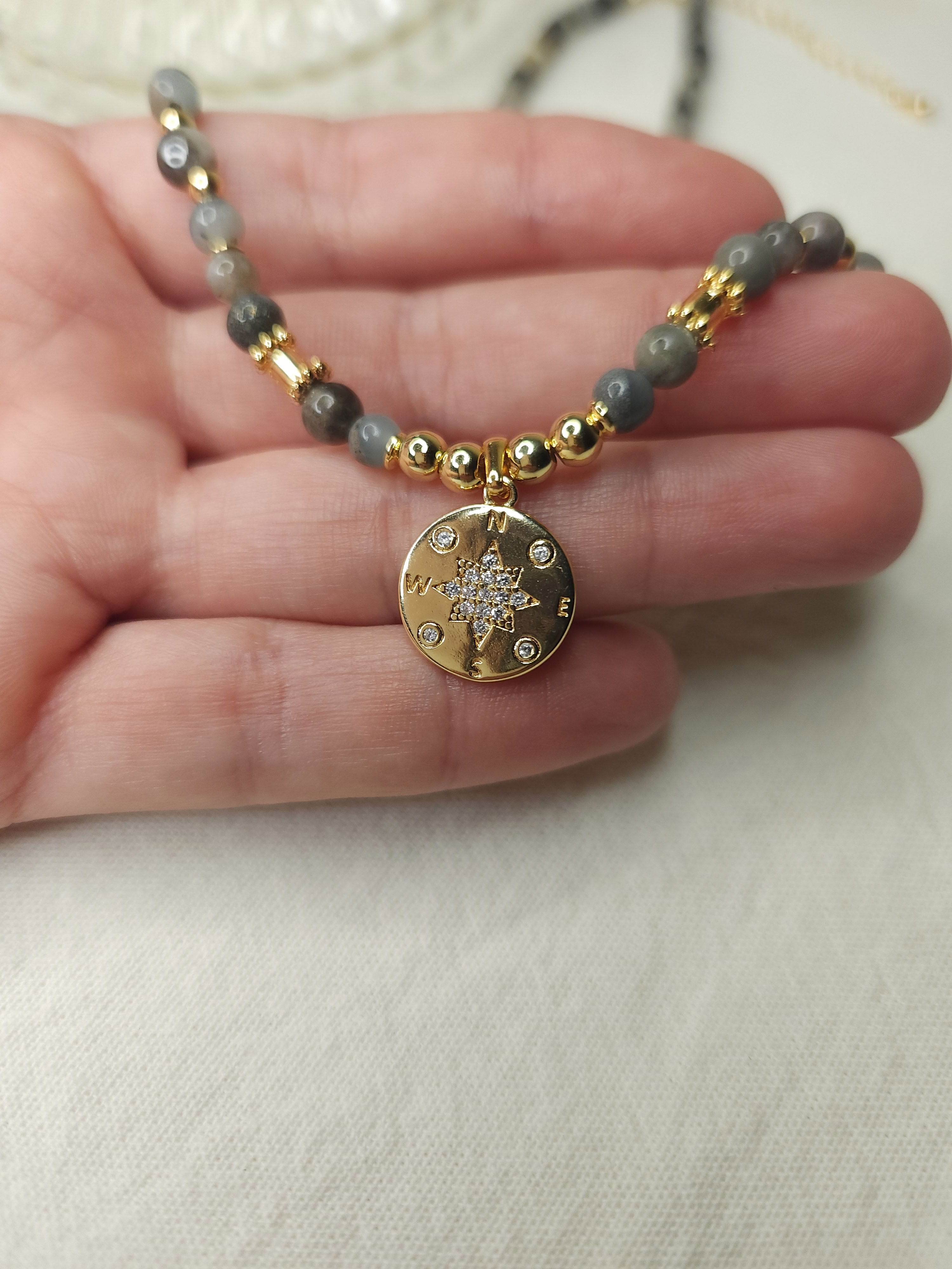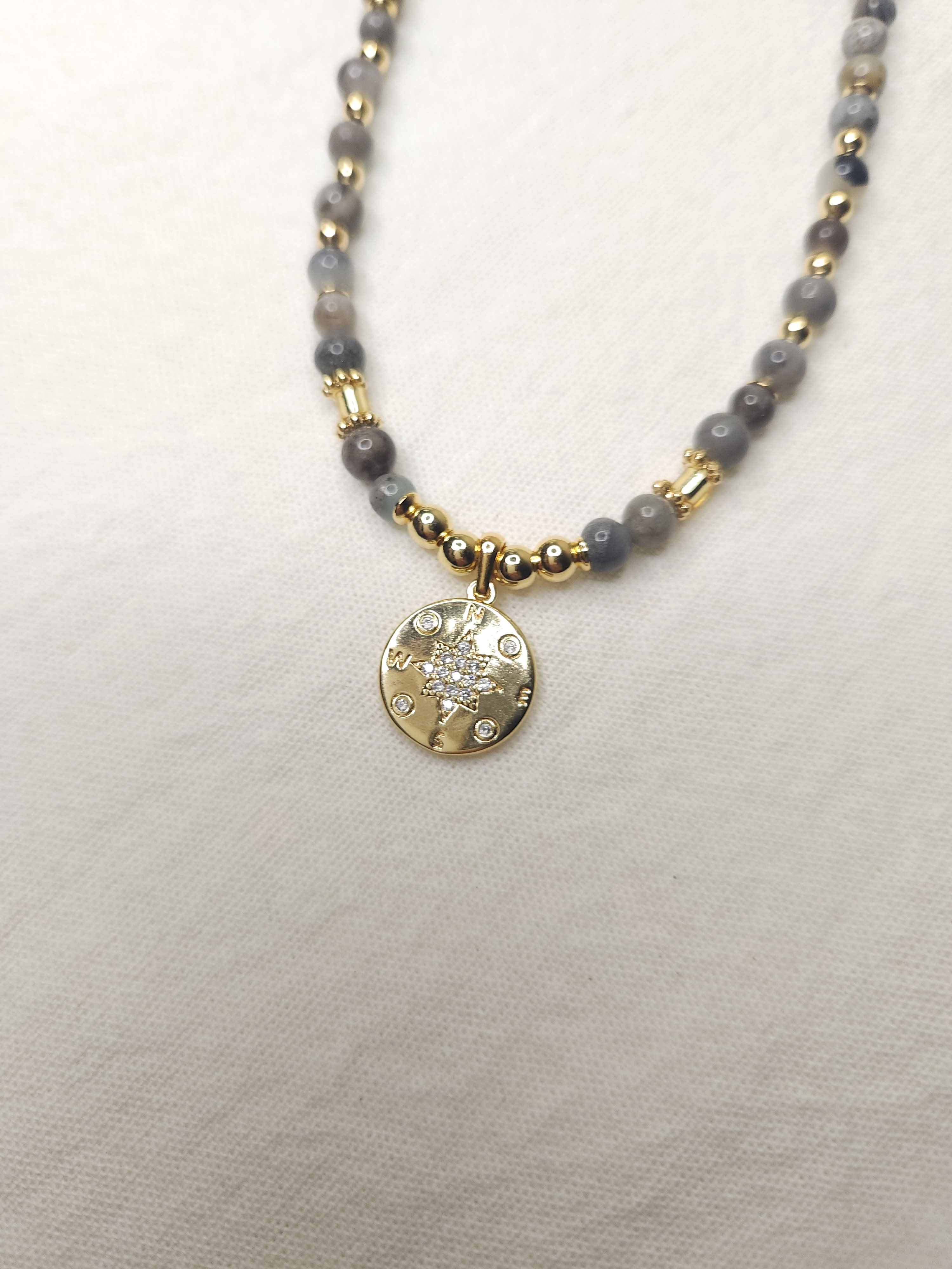 Conjunto realizado con piedras naturales Ágata India de 4mm + separadores de Oro laminado + dije Brújula todo en oro laminado hipoalergenico.