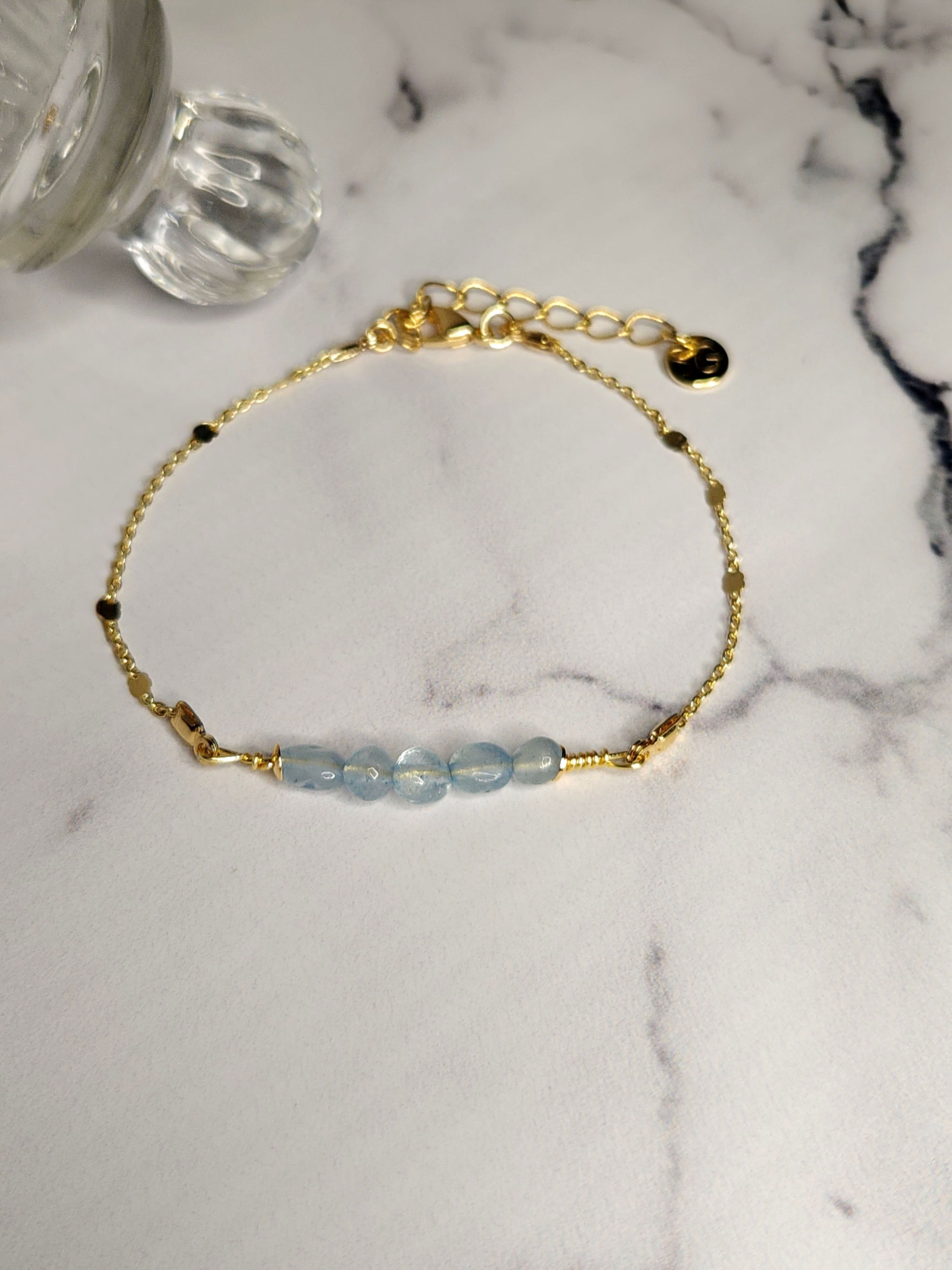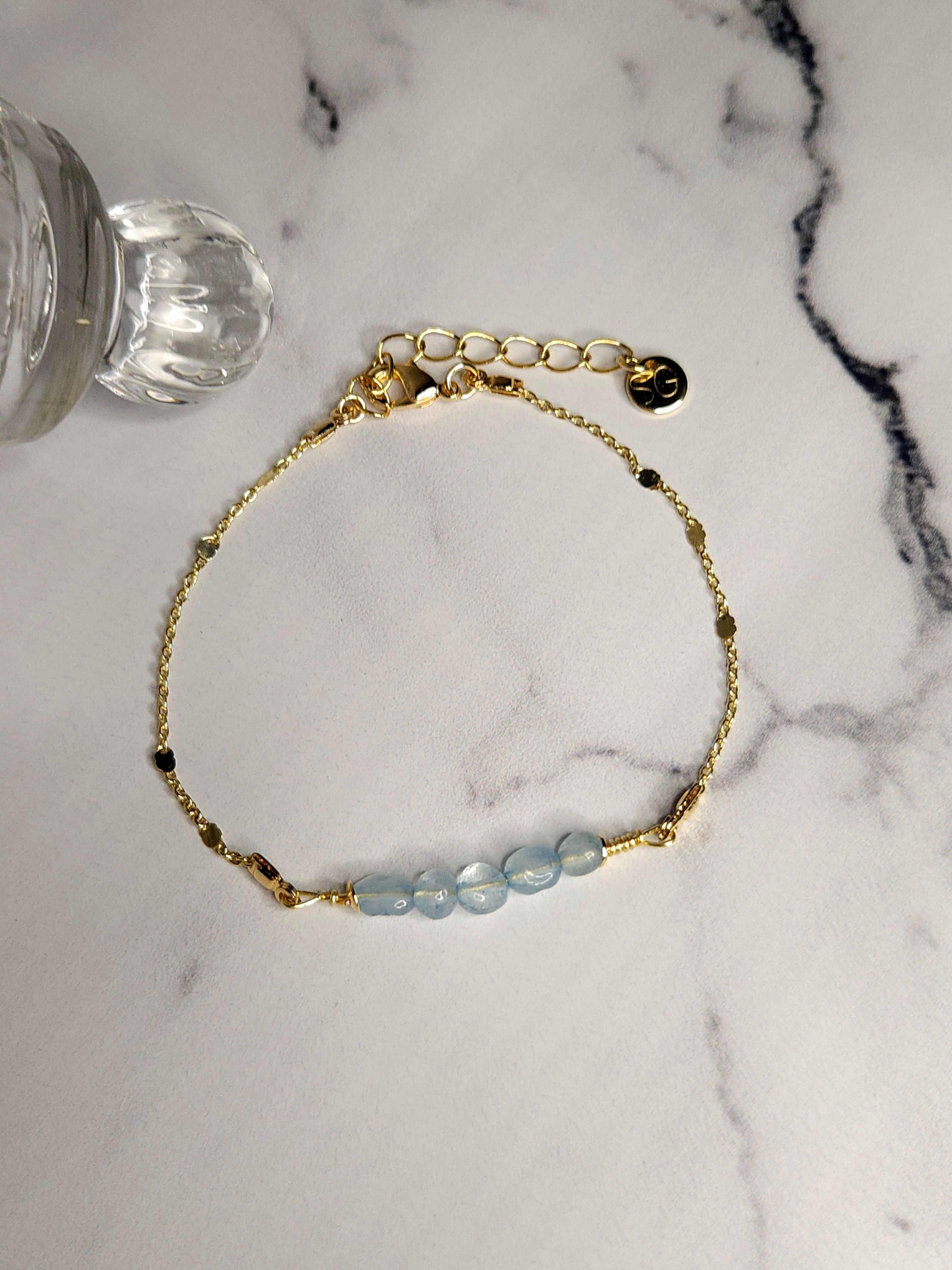 Pulsera flexible, realizado con piedras naturales Aguamarina en forma de semillas + cadena finita. Todo en oro laminado hipoalergénico.