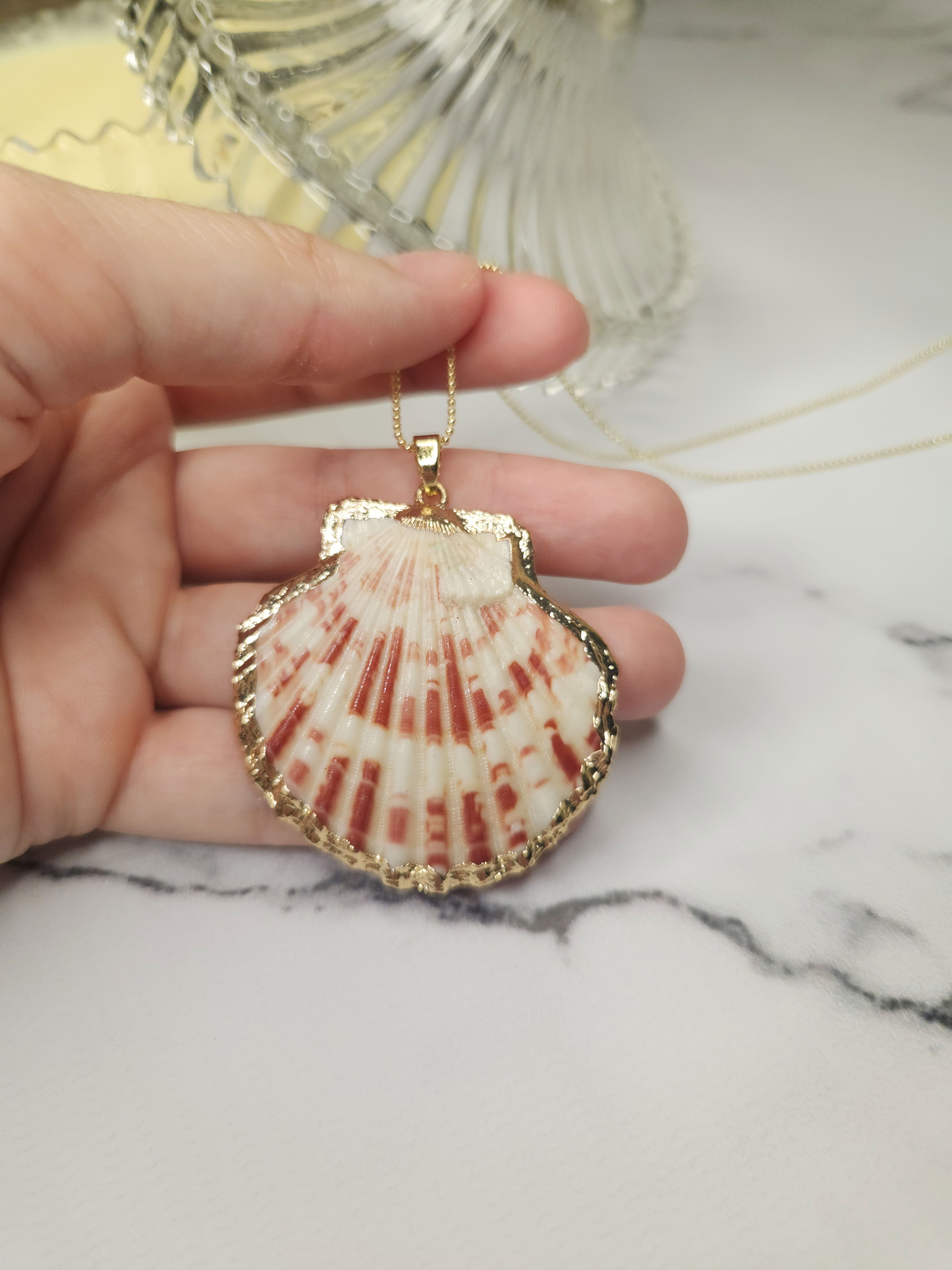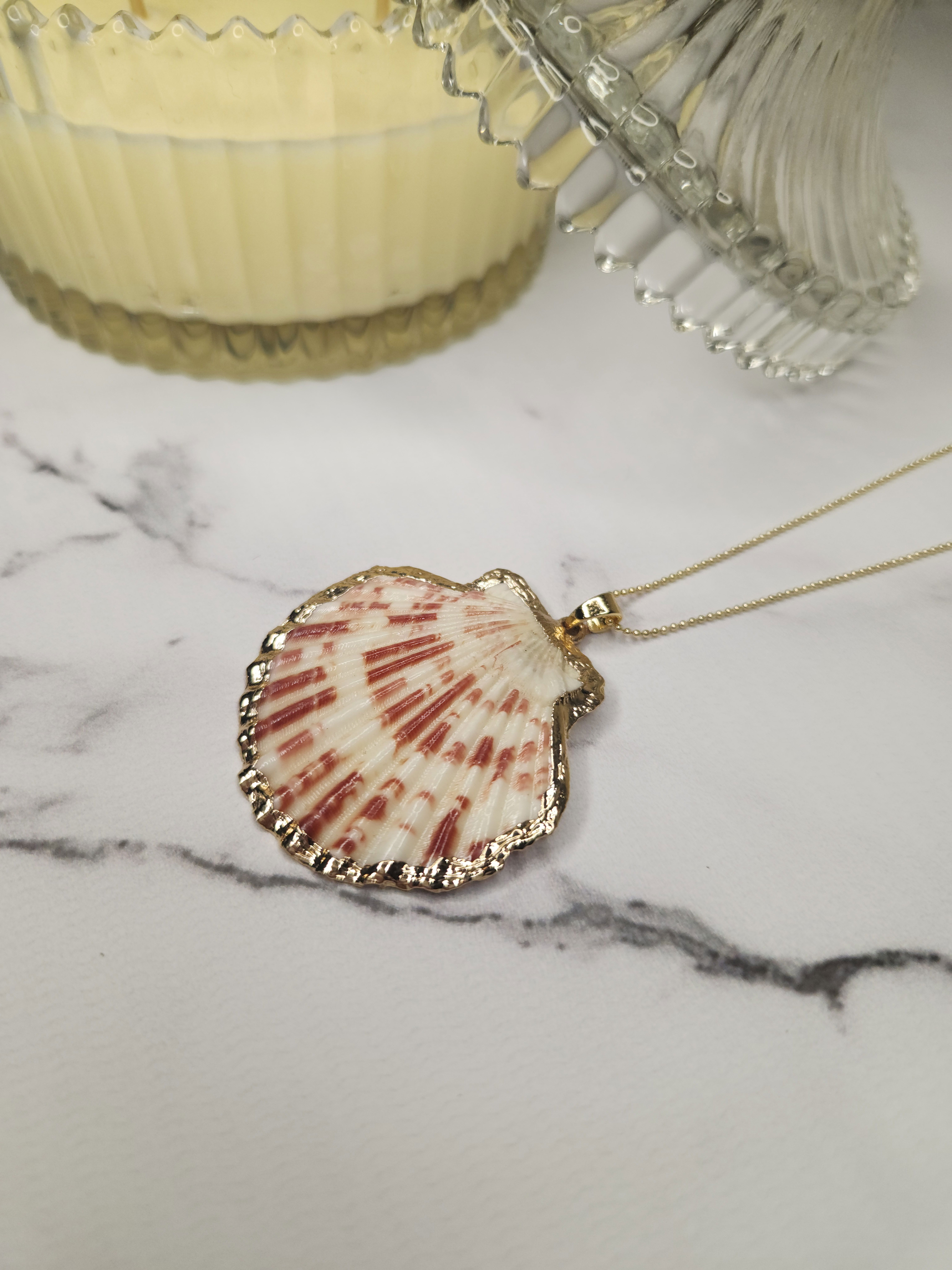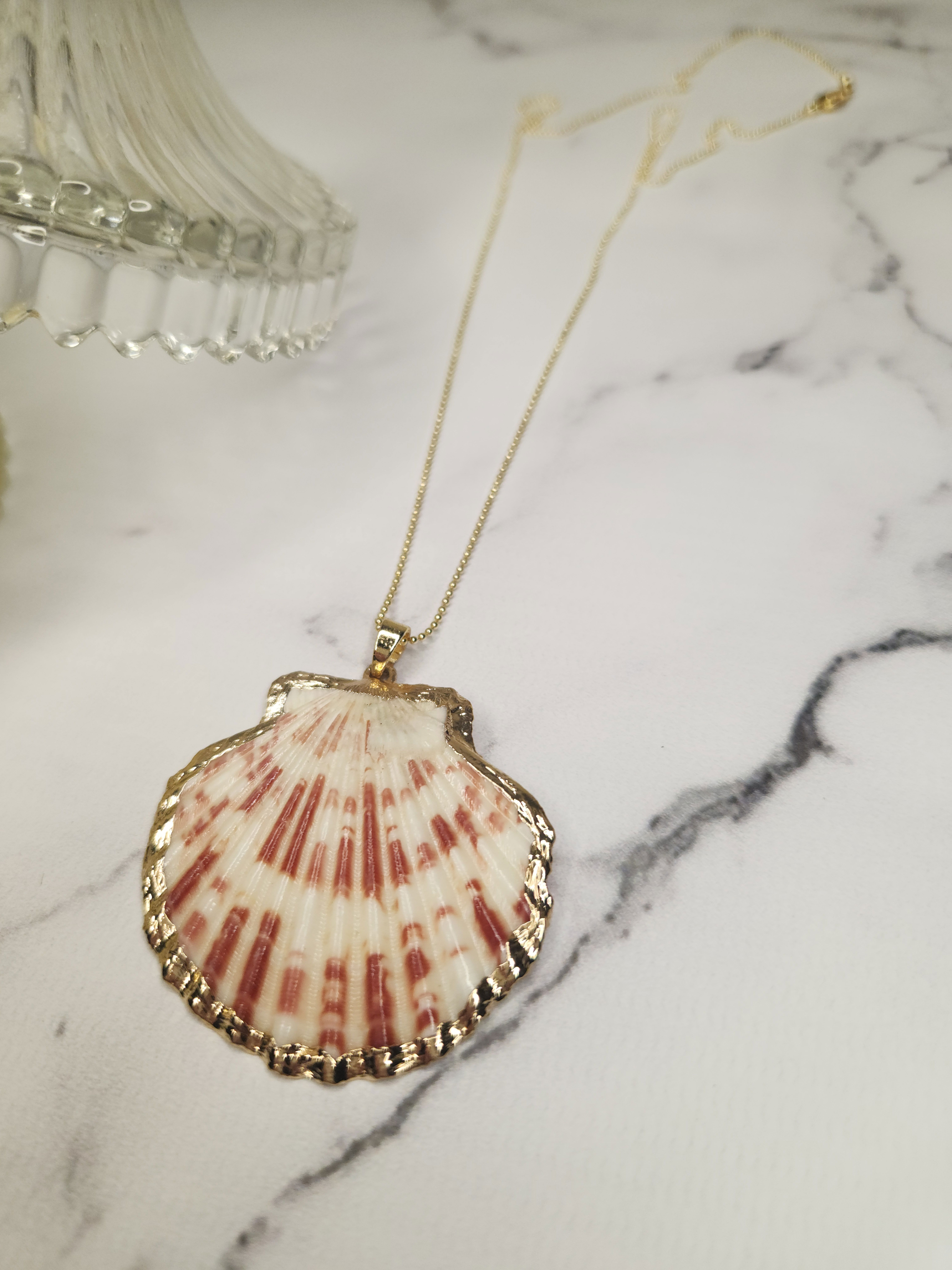 Conjunto realizado con cadena finita y terminaciones en Oro Laminado hipoalergénico + dije ostra natural en tonos bordó con borde dorado.