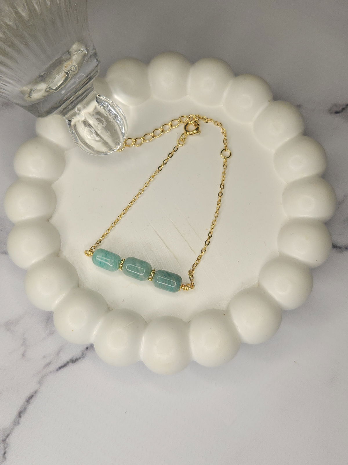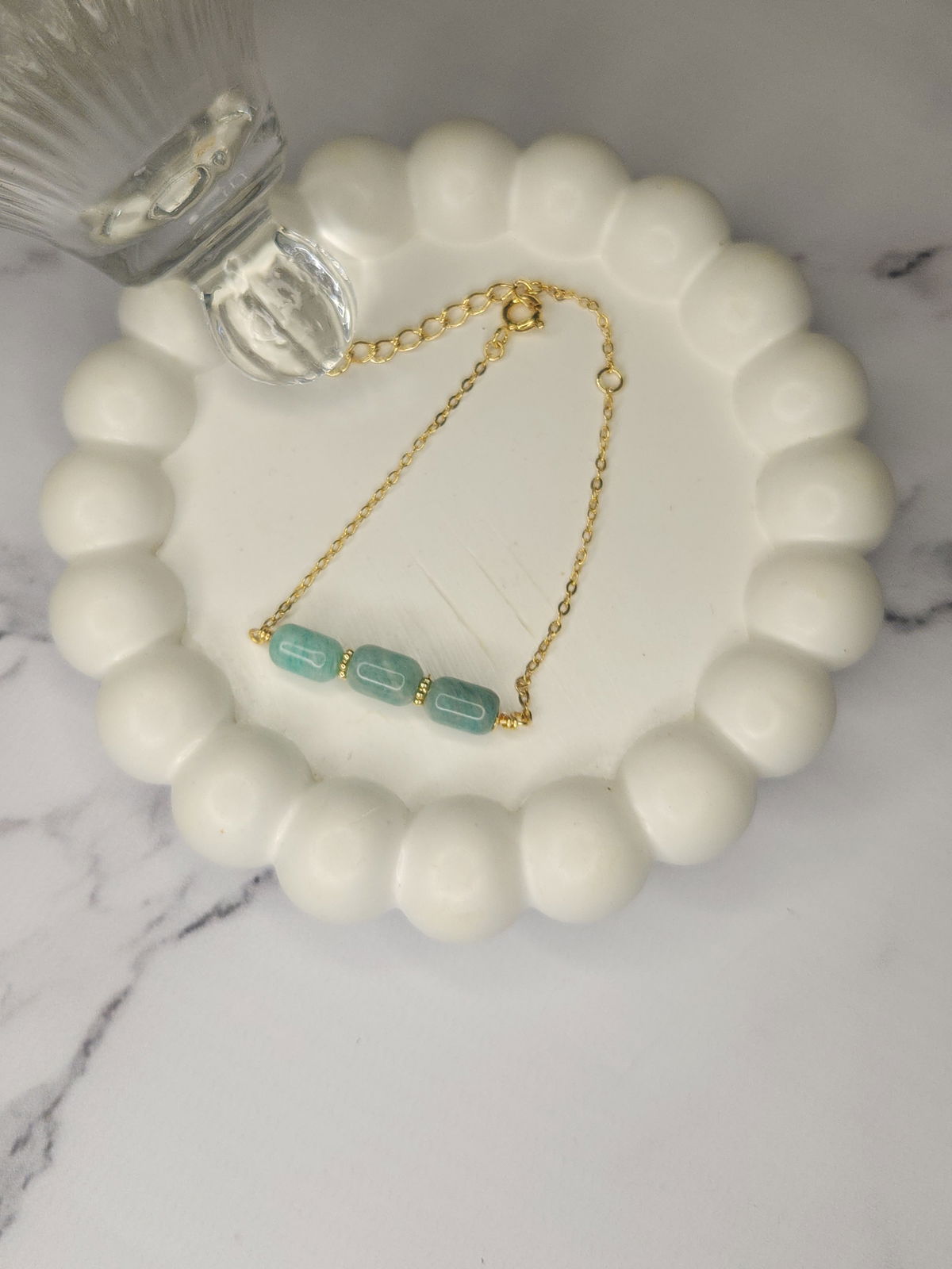 Pulsera realizada con cadena en oro laminado + piedras natural Amazonita en forma de columna, y separadores en oro laminado.