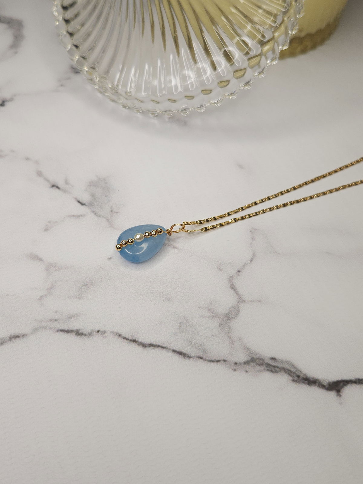 Conjunto en oro laminado con cadena plana de 1,6 mm y dije piedra natural Aguamarina en forma de buzio con perla cultivada, de 23.5~24 mm de largo x13 mm de ancho.