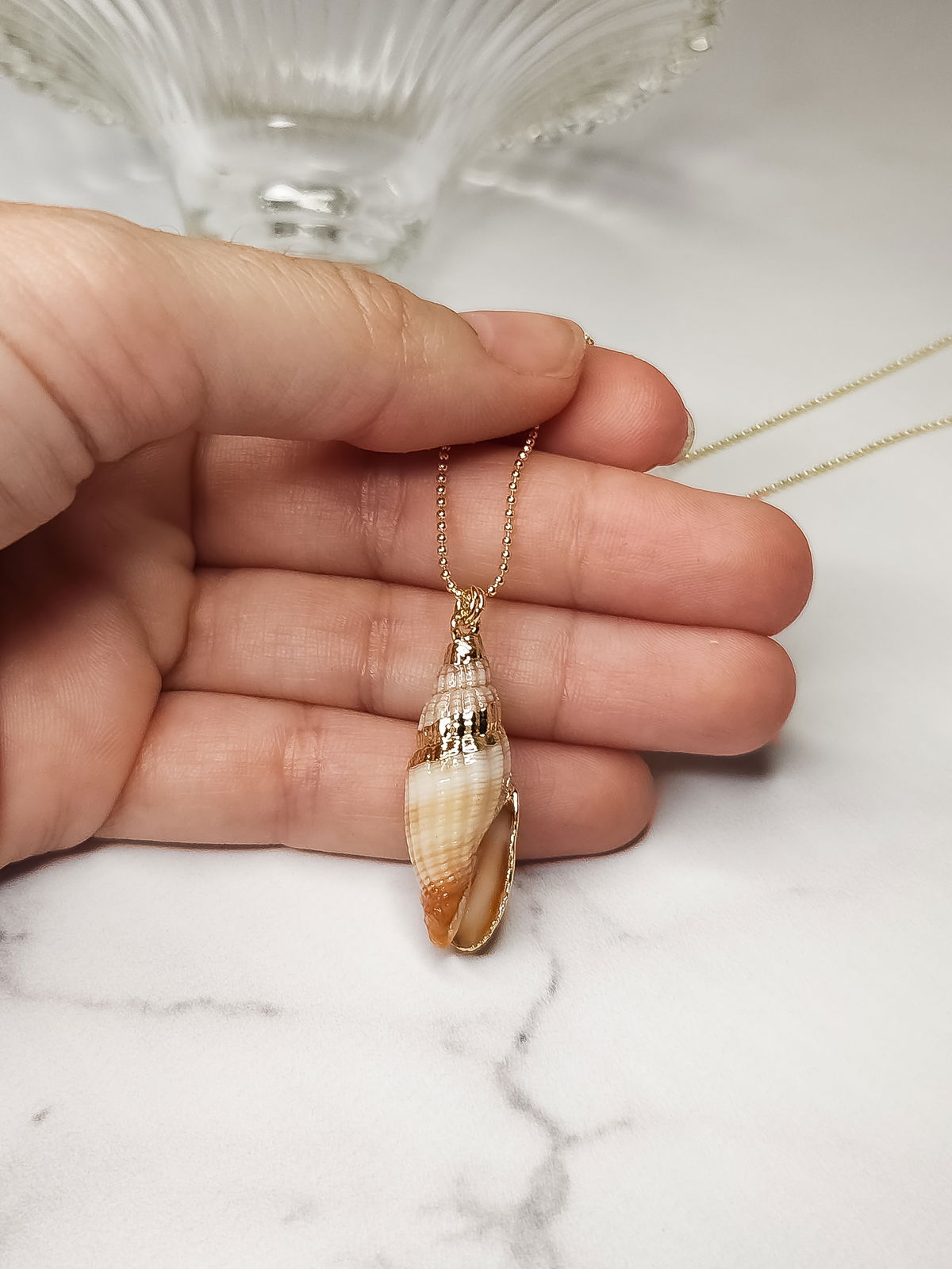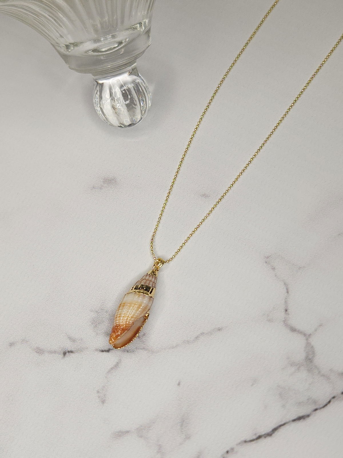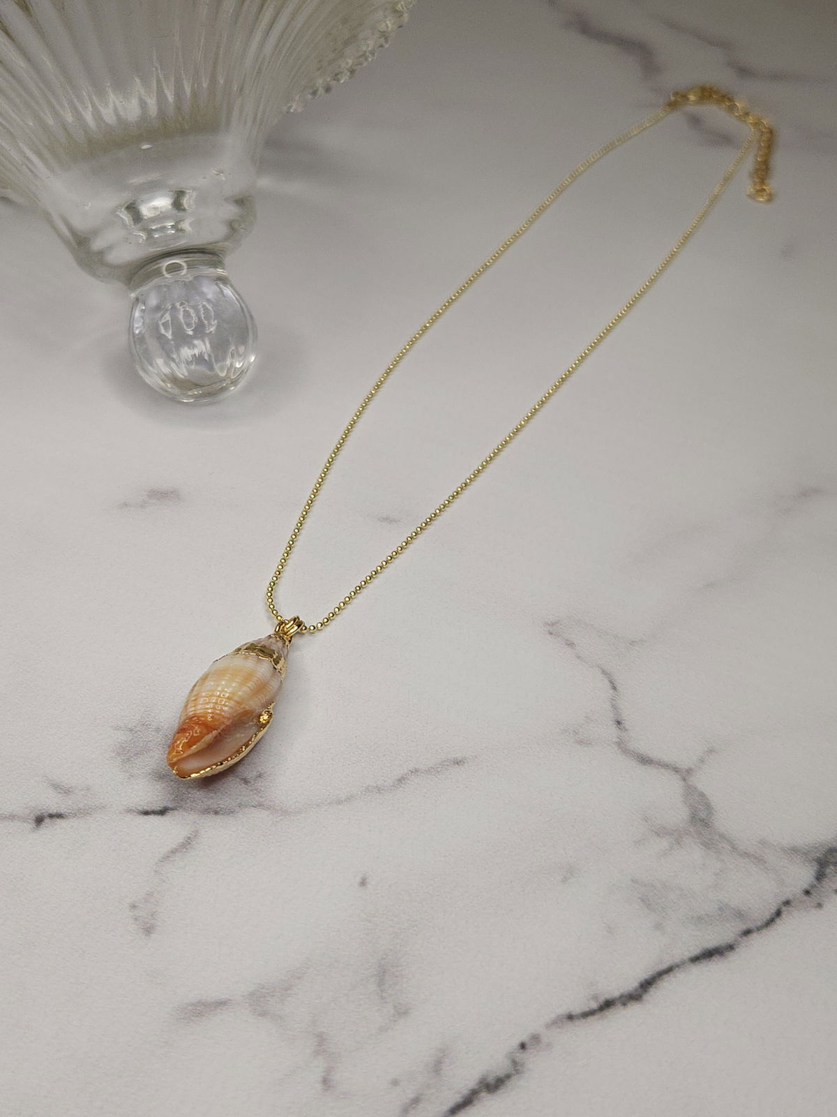Conjunto realizado con cadena finita en oro laminado y dije caracol natural en tonos naranja con detalles en dorado.