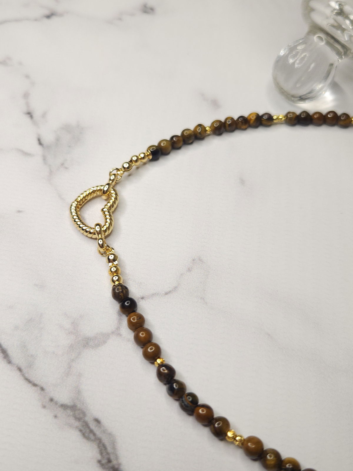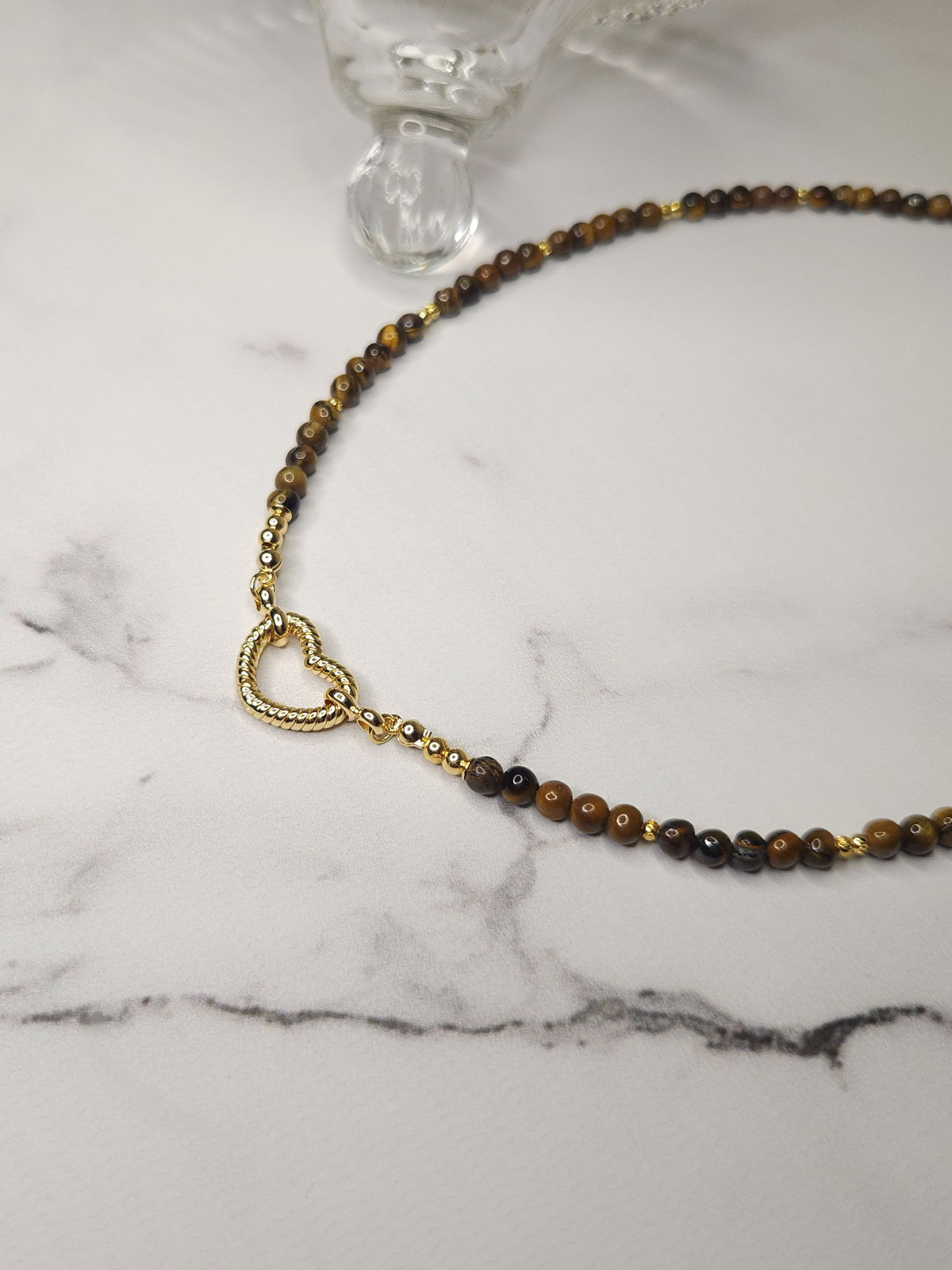 Conjunto realizado con piedras naturales Ojo de Tigre de 4 mm + broche en forma de corazón, detalles y terminaciones todo en oro laminado hipoalergenico.