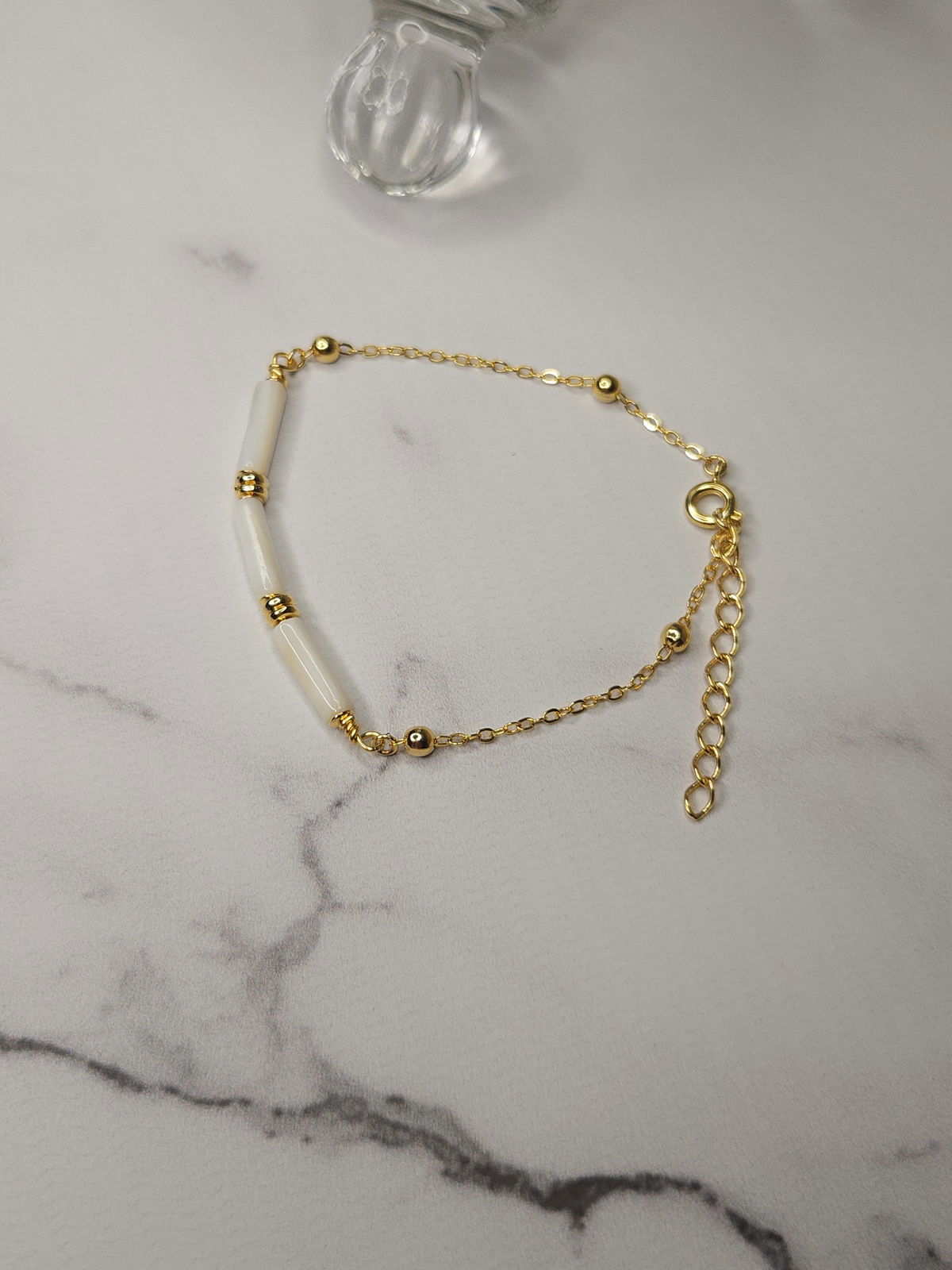 Pulsera realizada con cadena puntos de balín en oro laminado + Nacar en forma de tubo + detalles y terminaciones todo en oro laminado hipoalergenico.