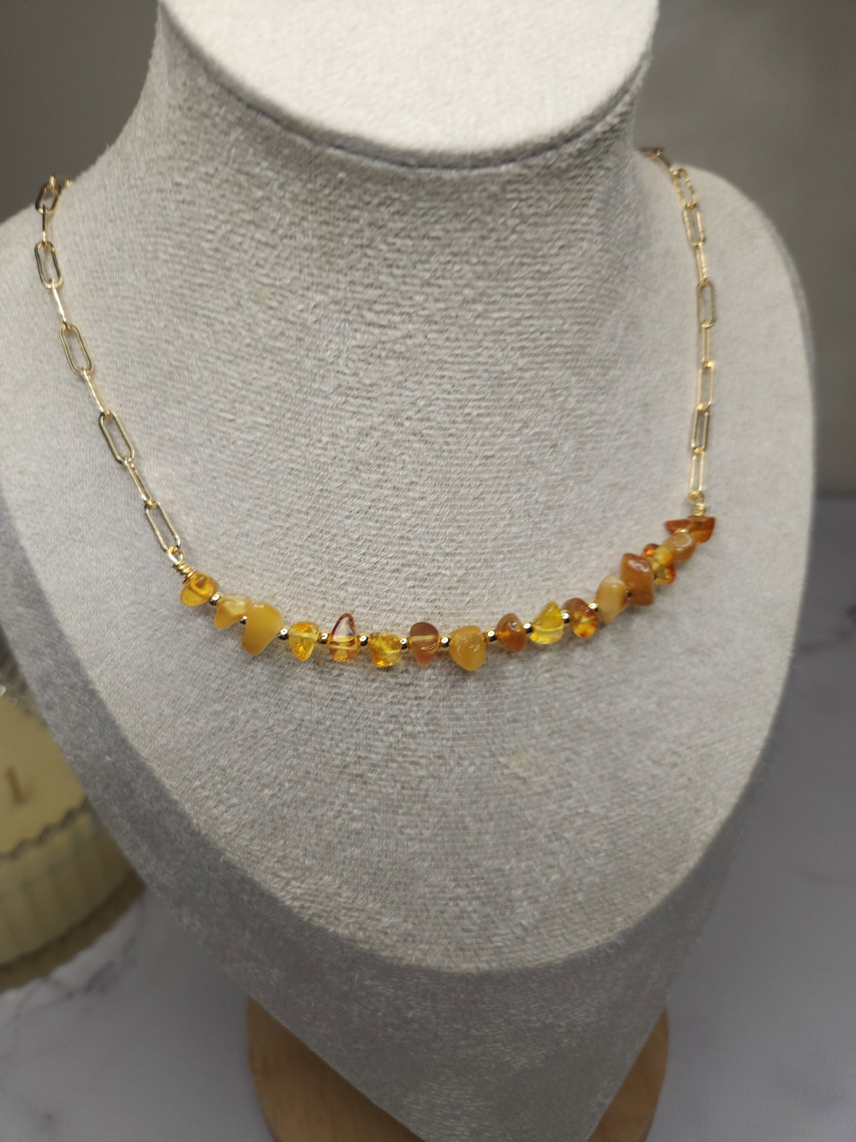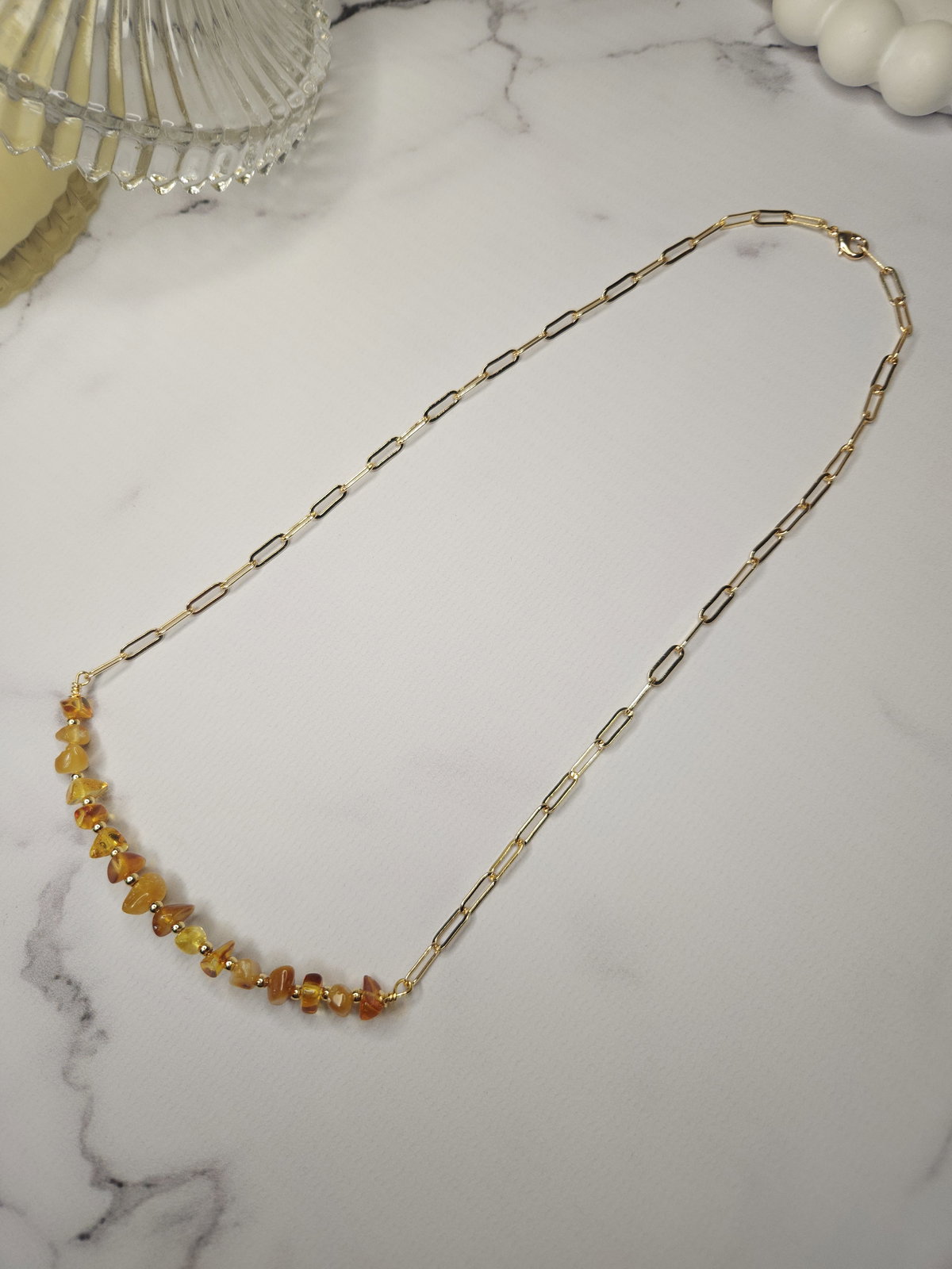 Conjunto Laminado realizado con escallas de Ámbar Natural + cadena eslabón + detalles y terminaciones todo en oro laminado hipoalergenico.