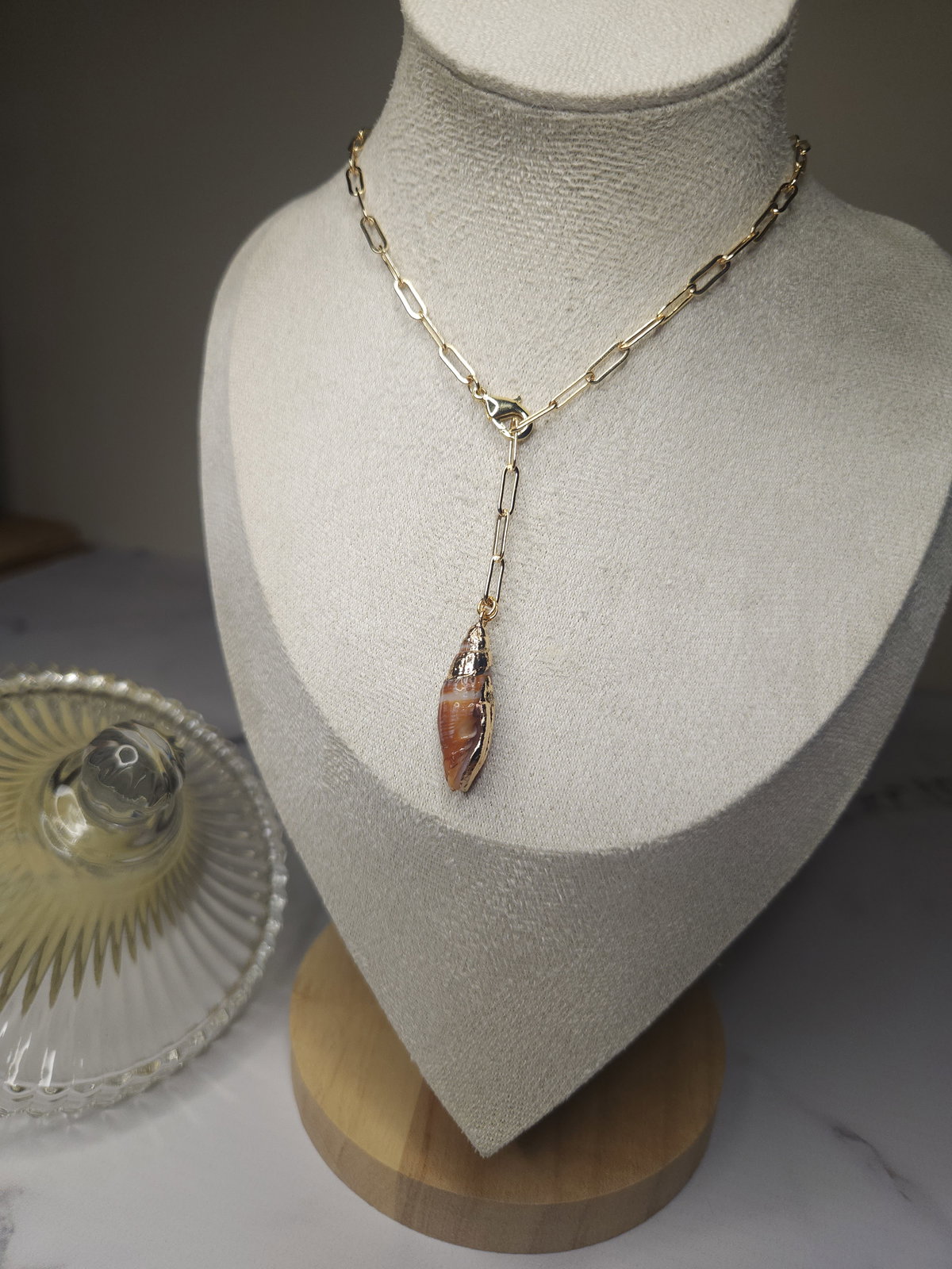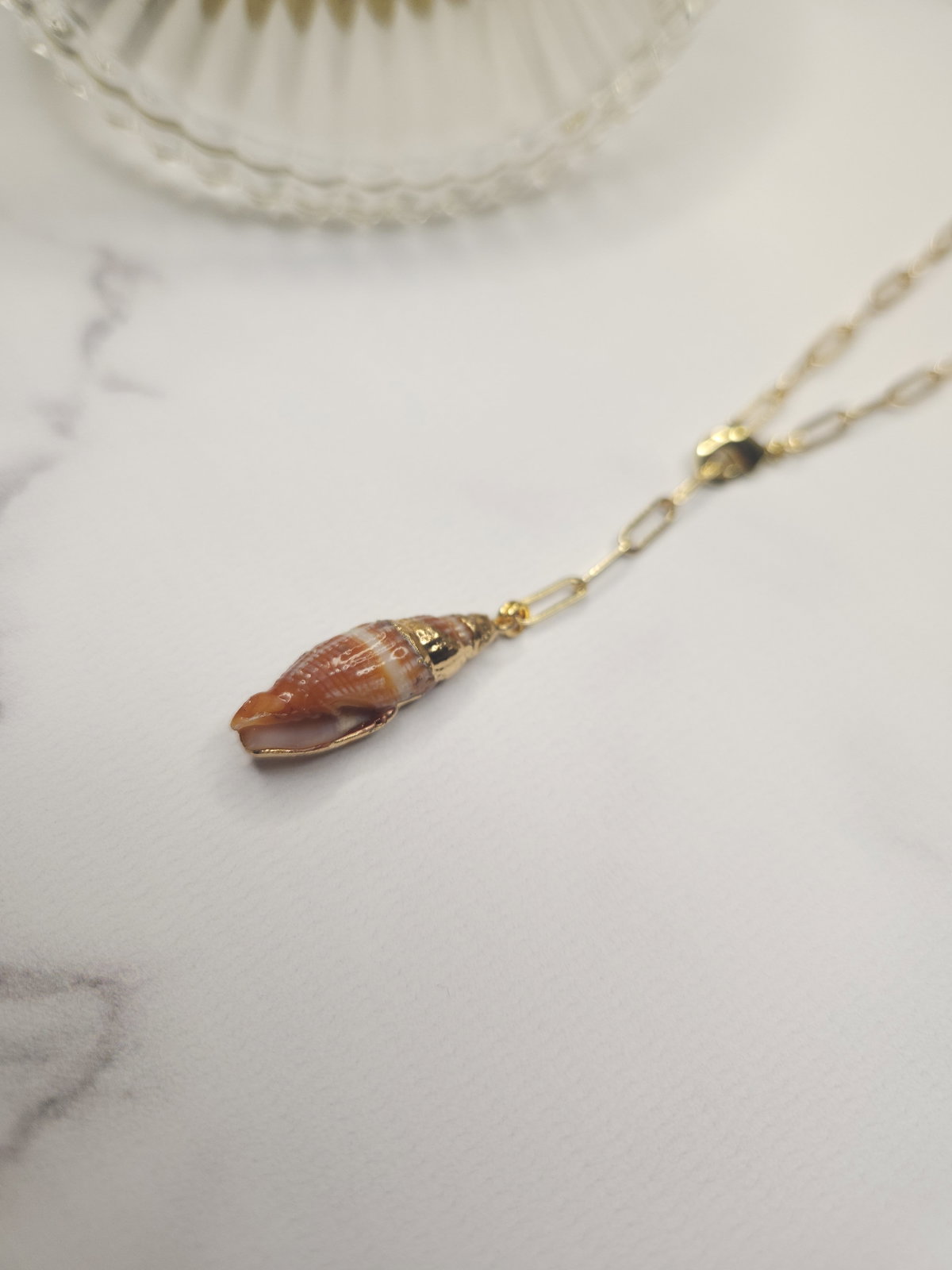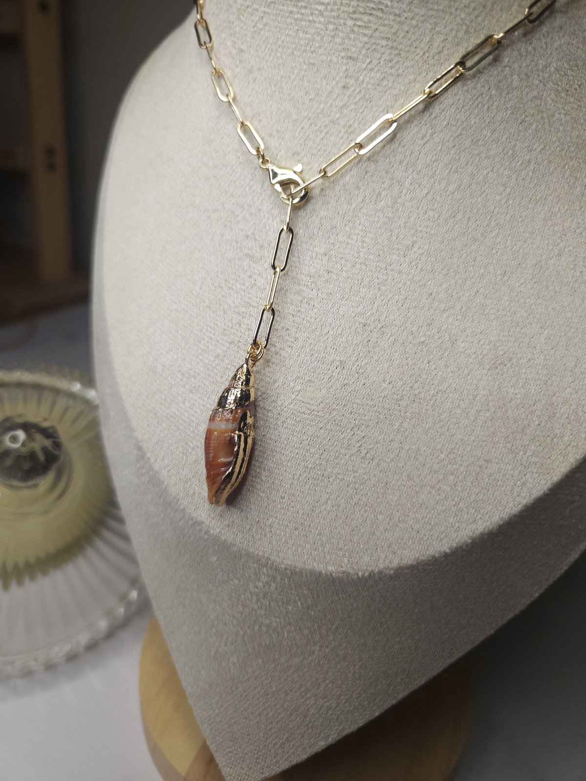 Conjunto realizado con cadena eslabon de 9,2 mm x 3,2 mm en oro laminado y dije caracol natural en tonos naranja con detalles en dorado.