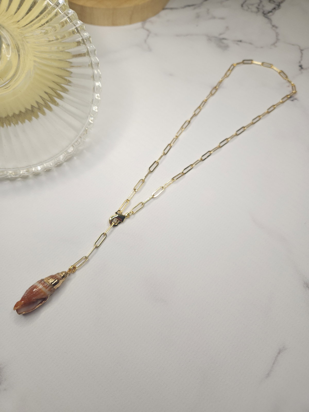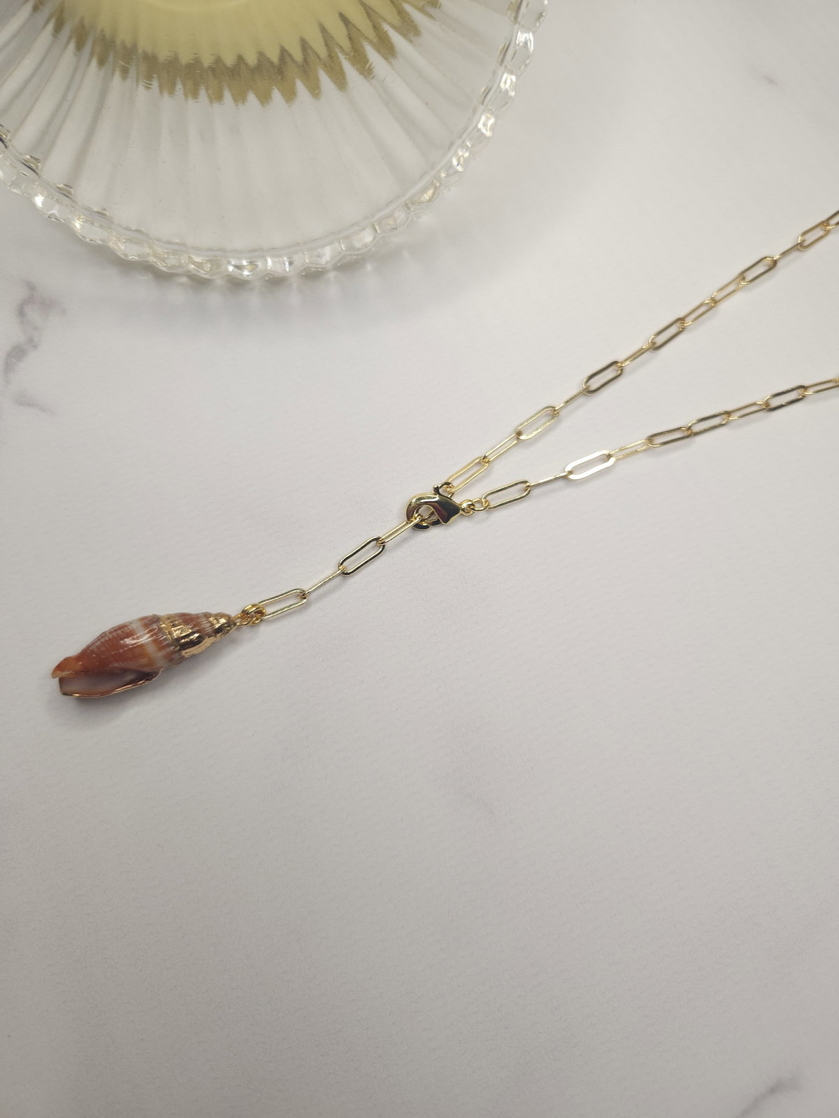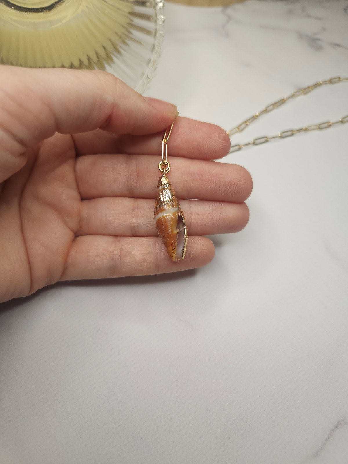 Conjunto realizado con cadena eslabon de 9,2 mm x 3,2 mm en oro laminado y dije caracol natural en tonos naranja con detalles en dorado.