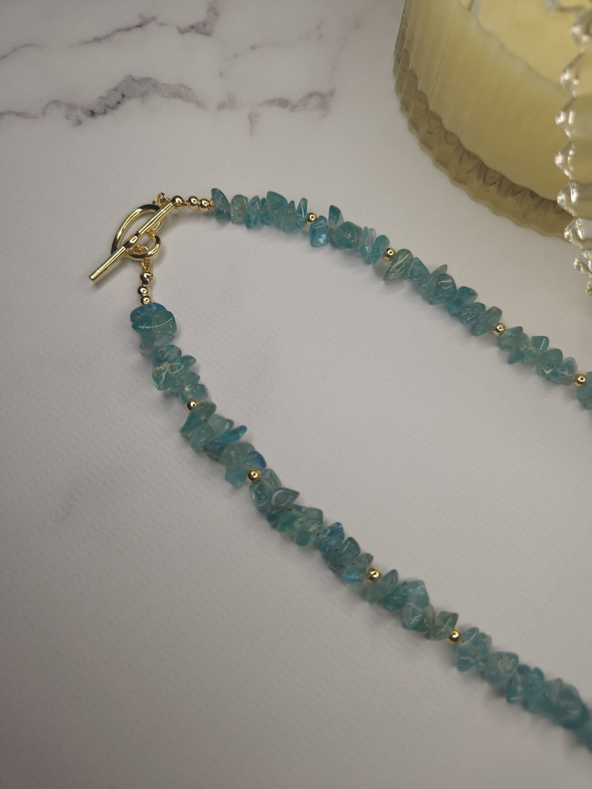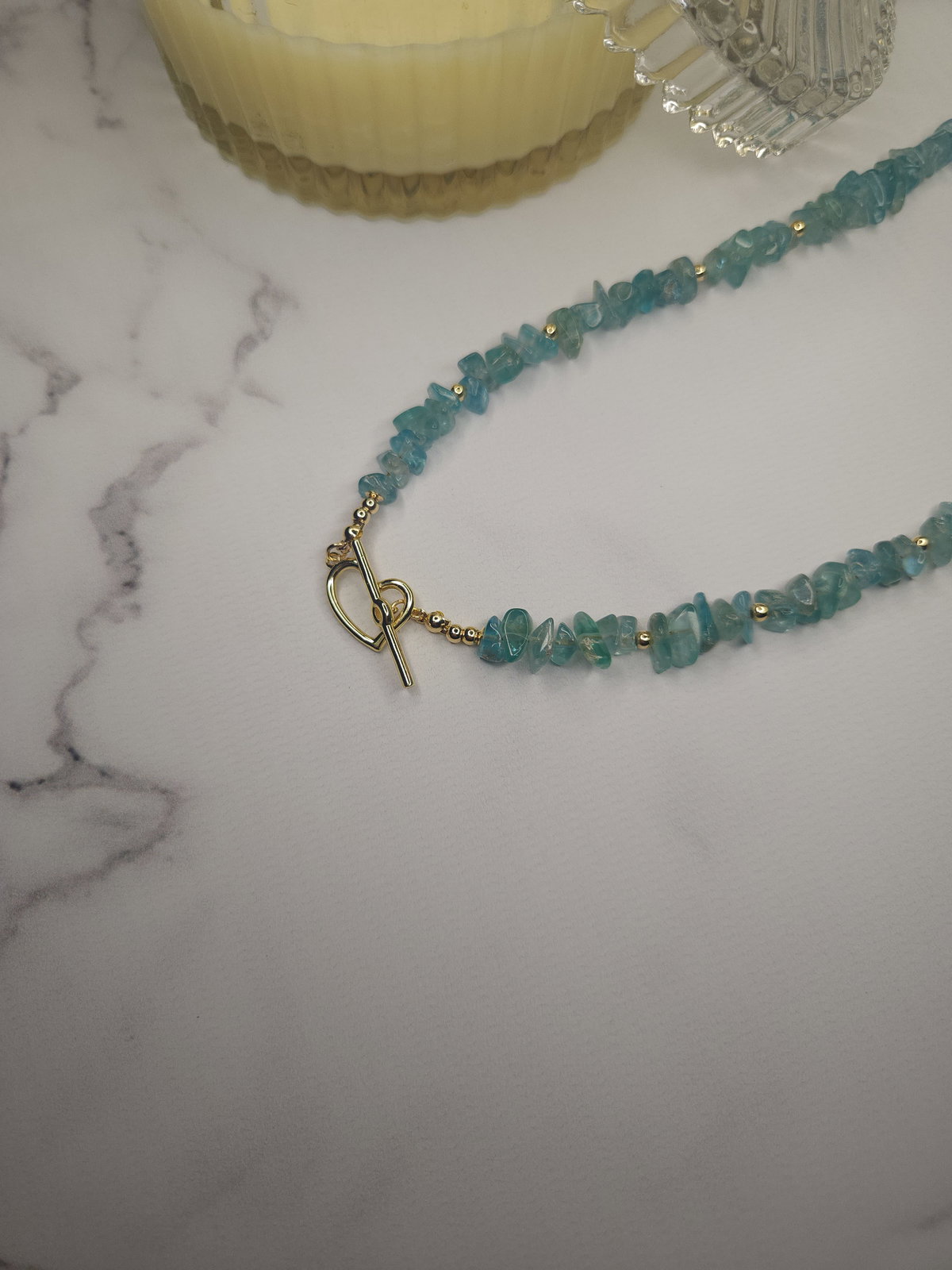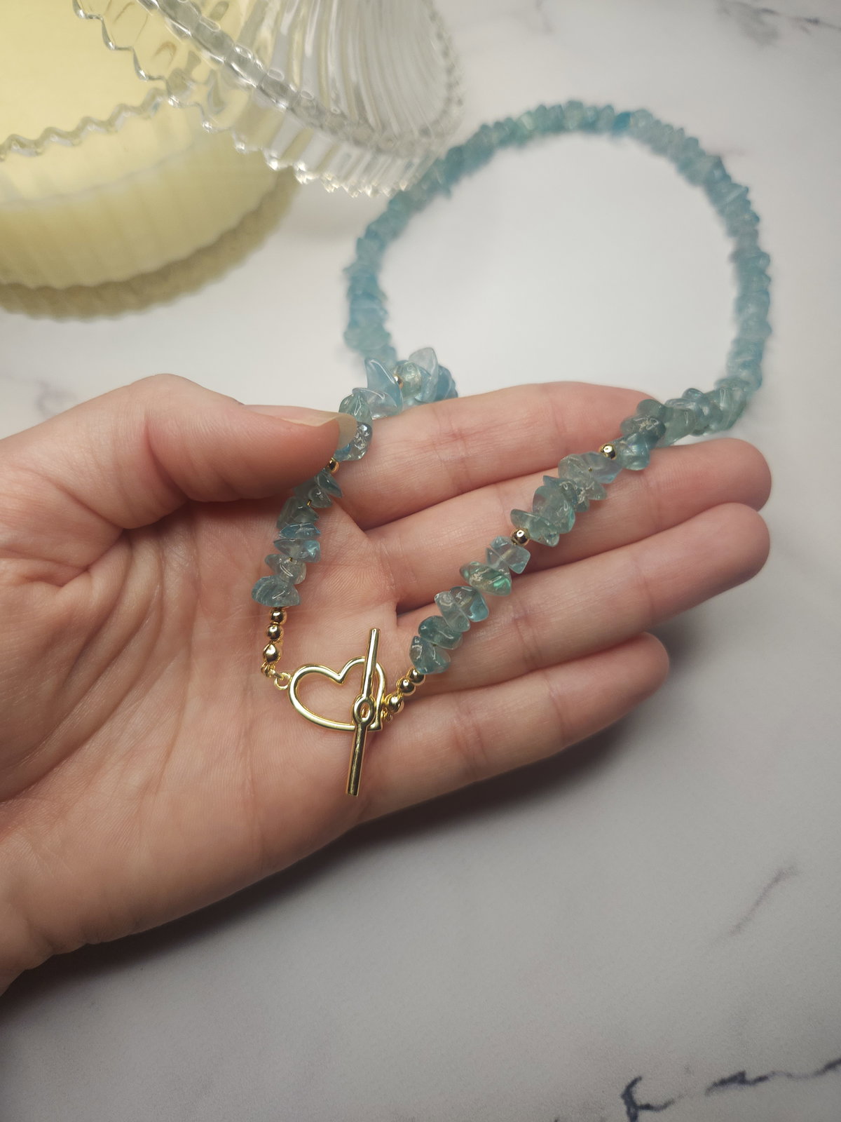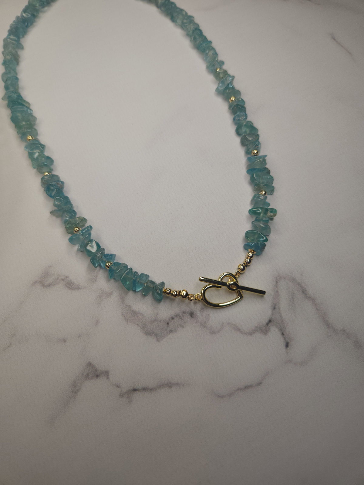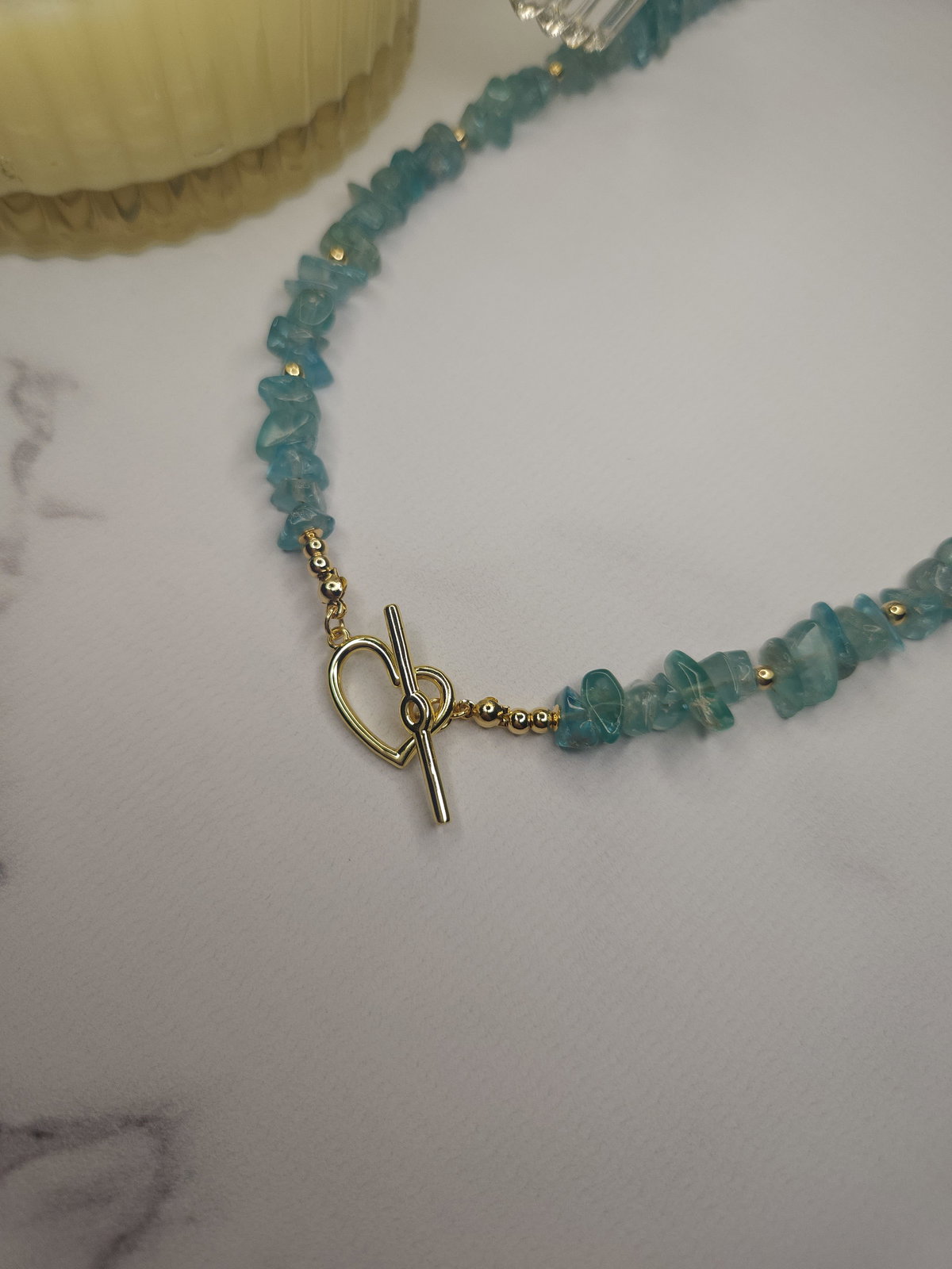Conjunto realizado con piedras naturales Topacio Azúl en forma de escallas + broche en forma de corazón + detalles y terminaciones todo en oro laminado hipoalergenico.
