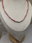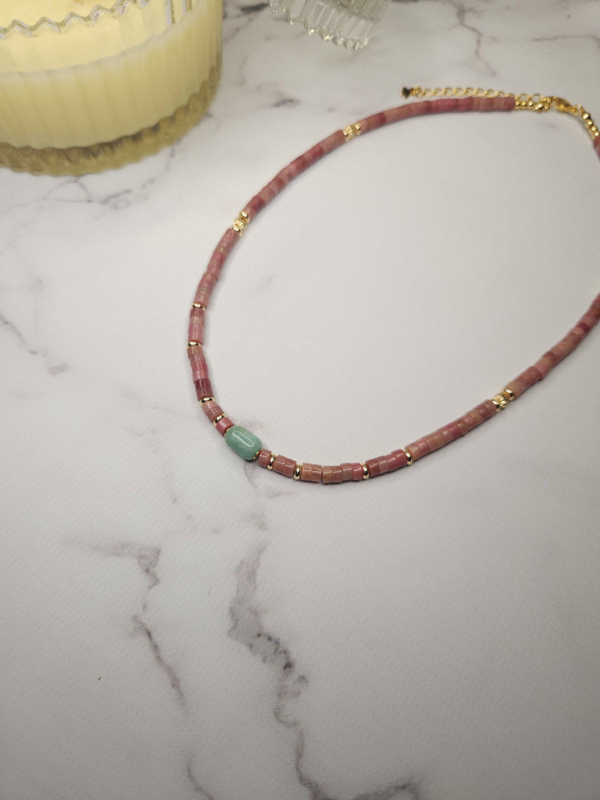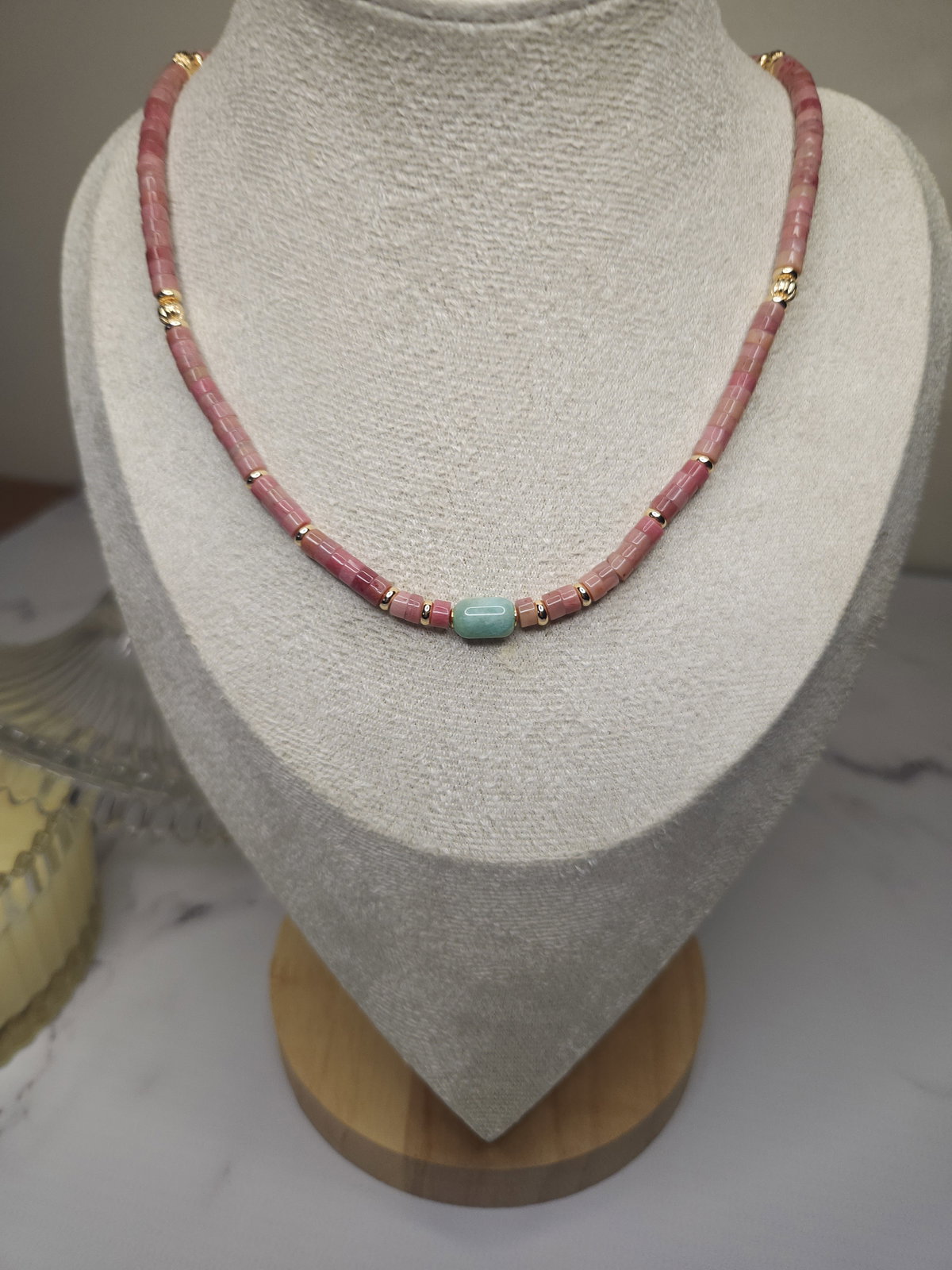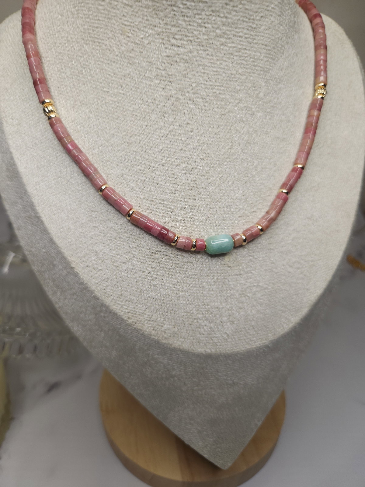 Conjunto Laminado realizado con piedras Rodonita Natural en forma de disco y 1 Amazonita en forma de columna + detalles y terminaciones todo en oro laminado hipoalergenico.
