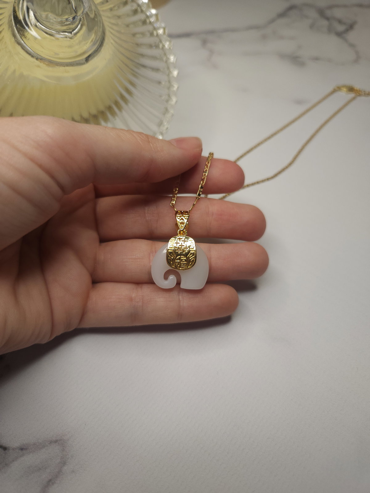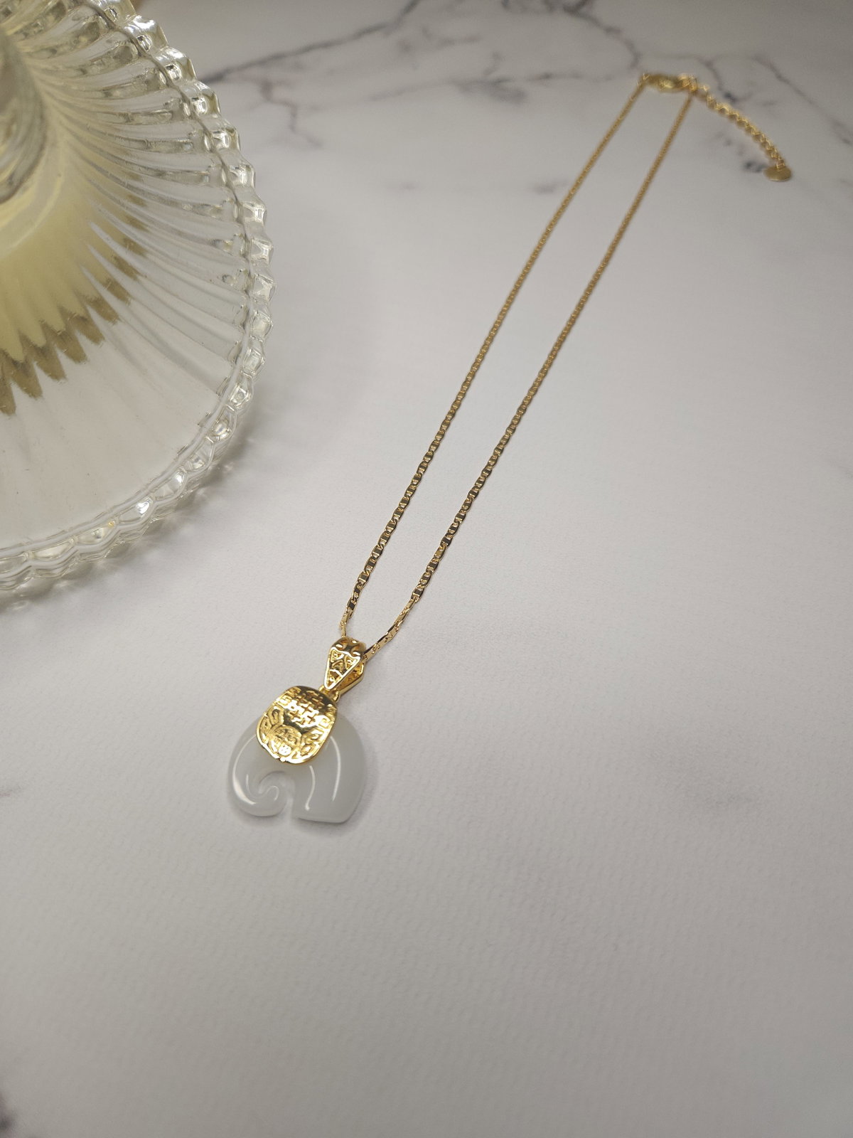 Conjunto realizado con cadena plana en oro laminado + dije elefante de piedra natural cuarzo blanco de 26,3 mm (incluido el portadije) x 18,6 mm.