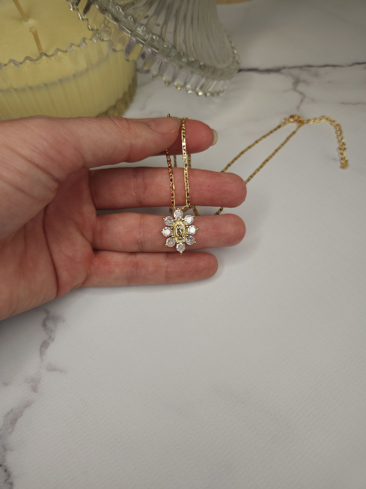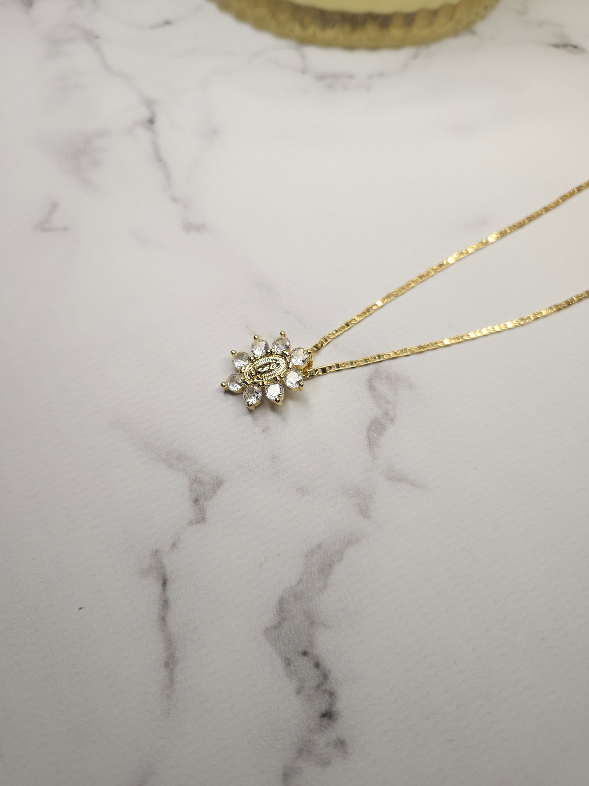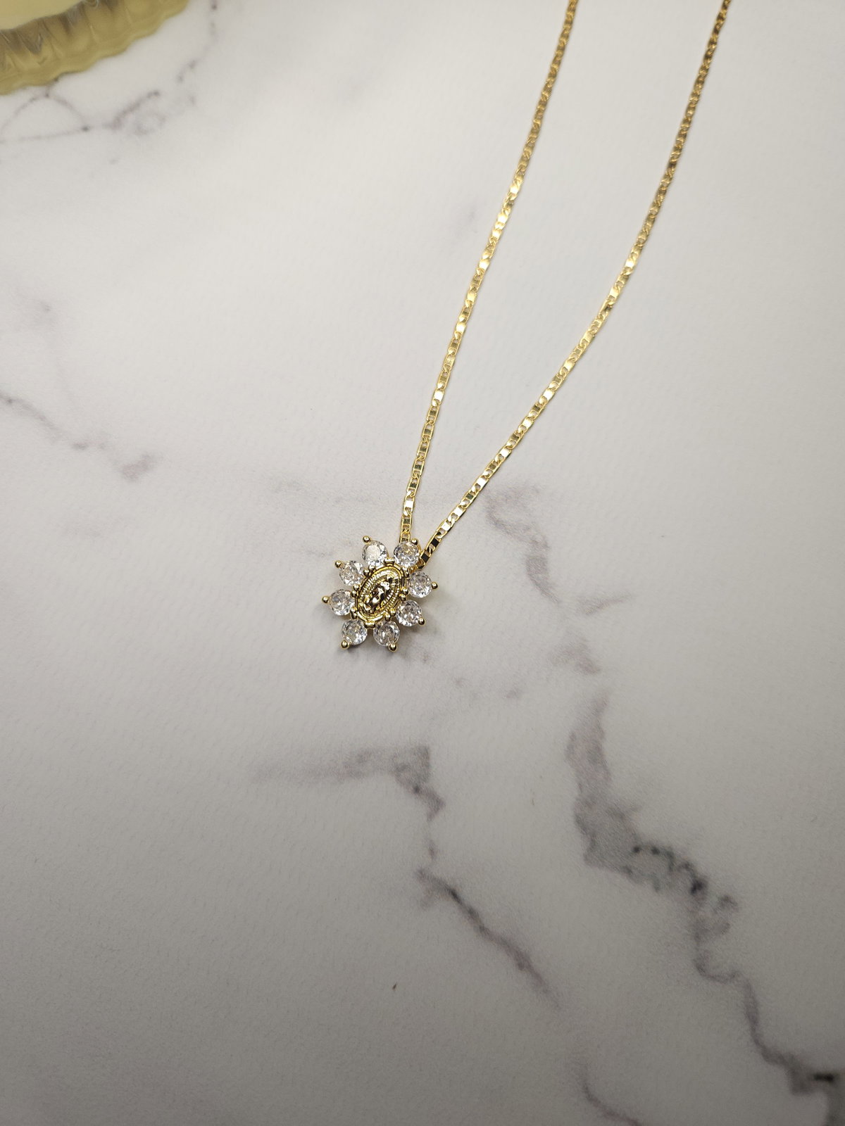 Conjunto realizado con cadena plana en oro laminado + dije flor virgen con zirconias de 17.5 mm x 14.5 mm.