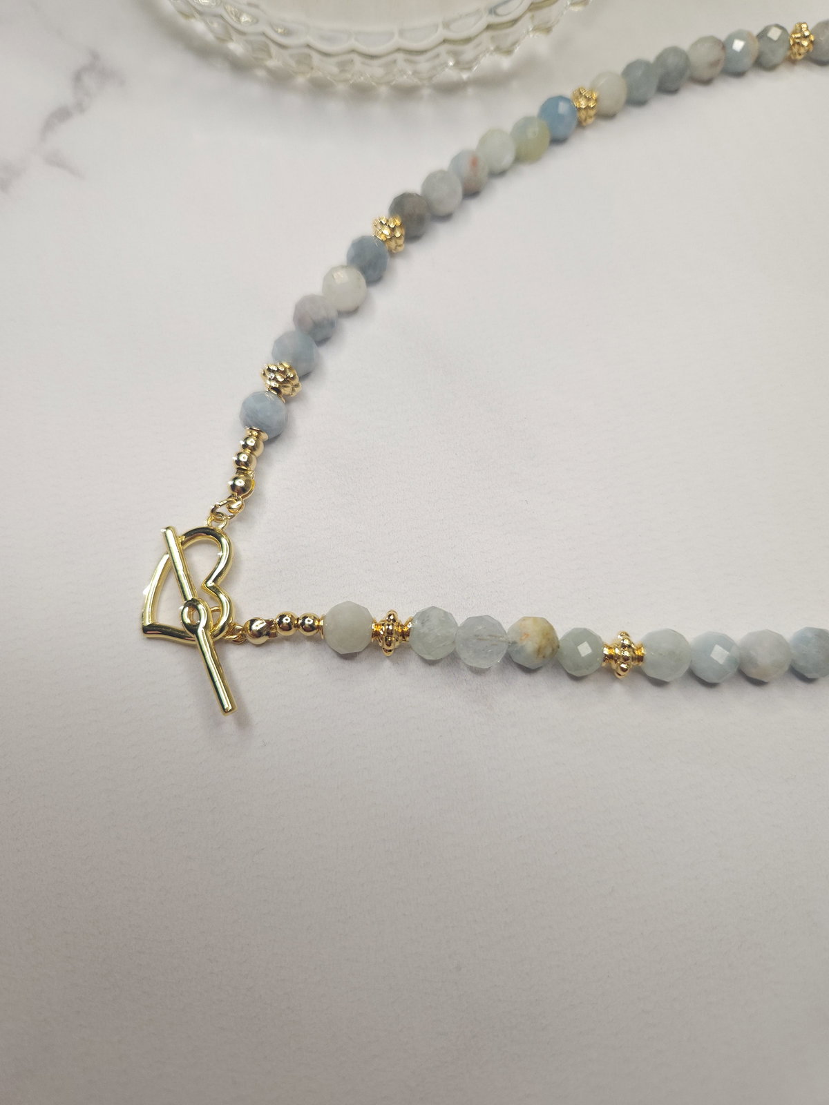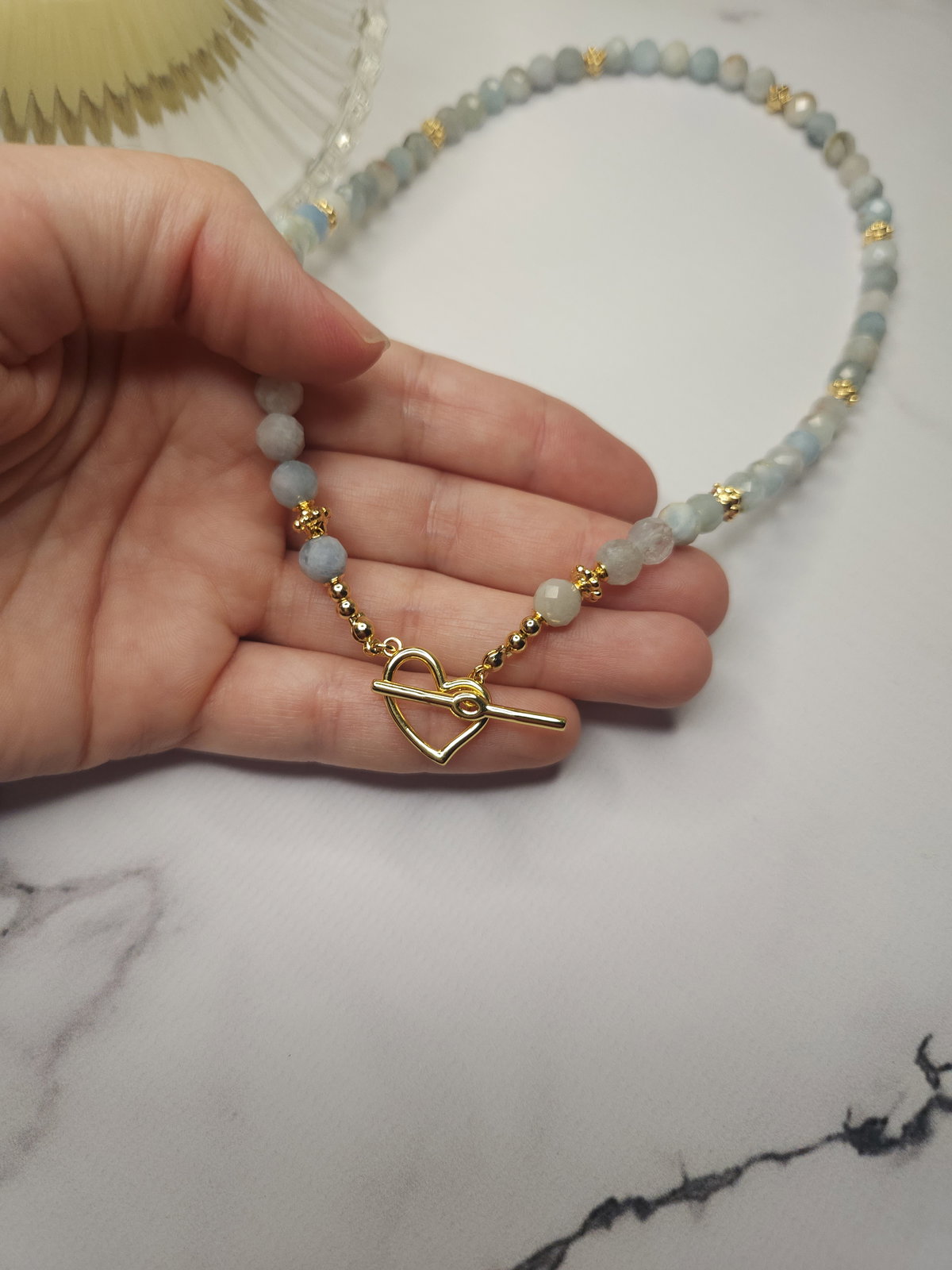 Conjunto realizado con piedras naturales Aguamarina facetada de 6 mm + broche en forma de corazón + detalles y terminaciones todo en oro laminado hipoalergenico.