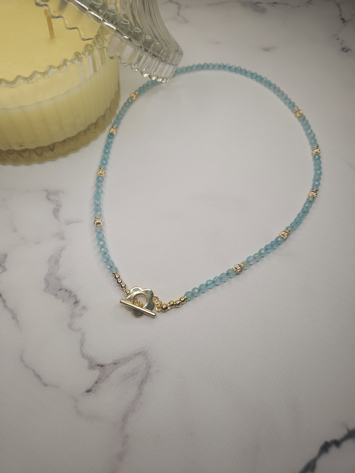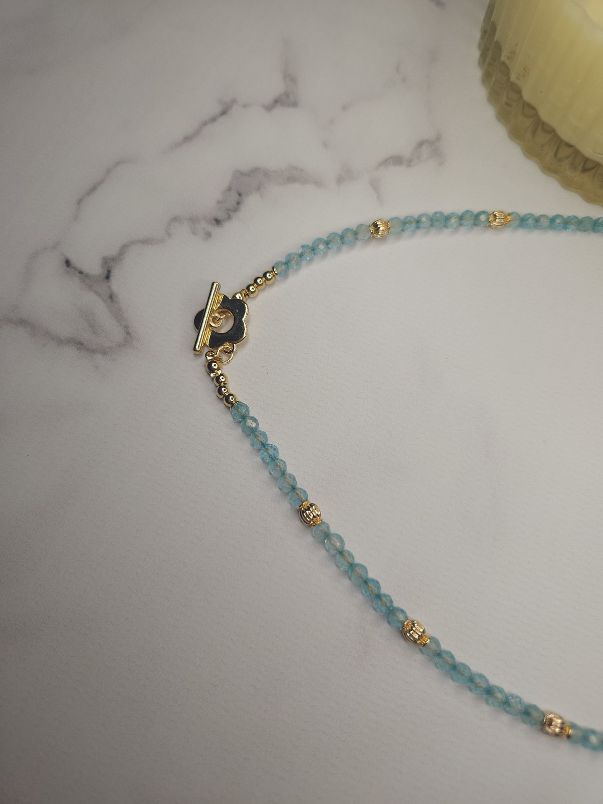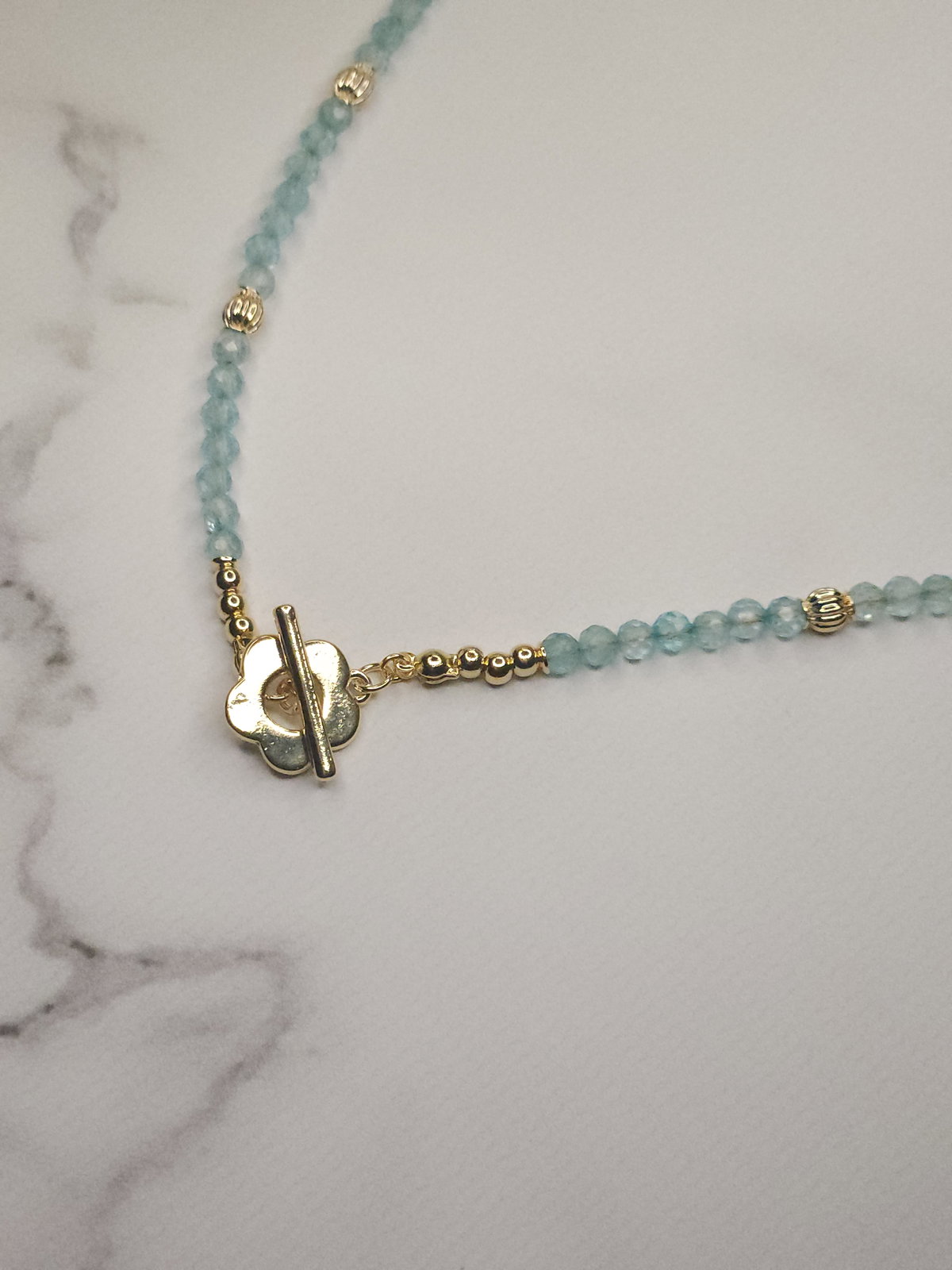 Conjunto realizado con piedras naturales facetadas Topacio Azúl de 3 mm + broche en forma de flor, detalles y terminaciones todo en oro laminado hipoalergenico.
