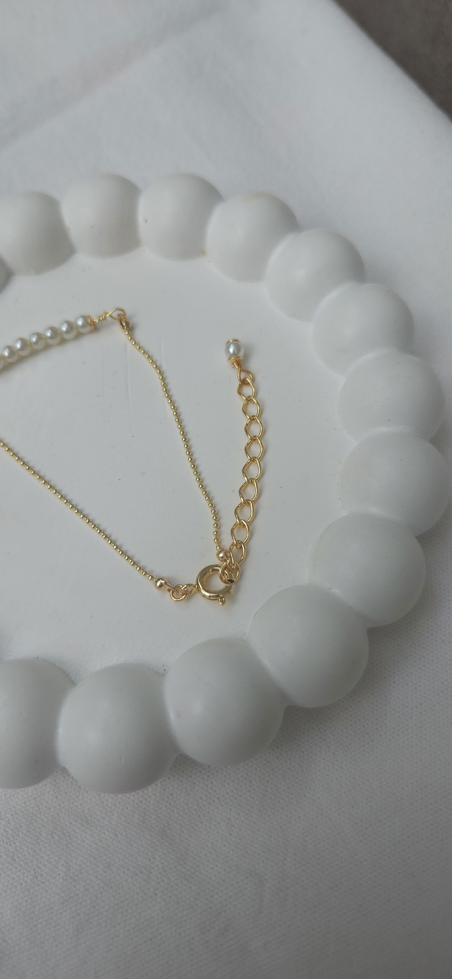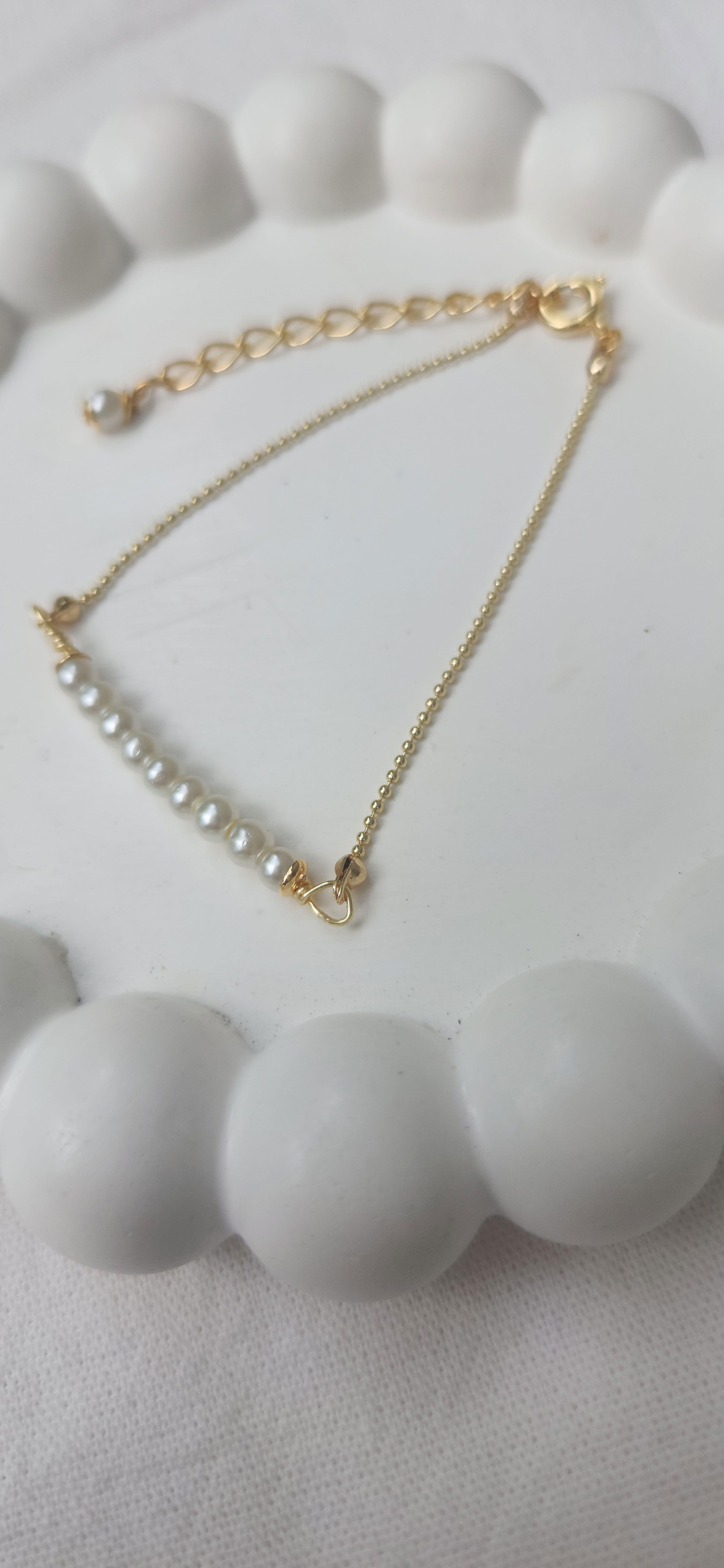 Pulsera flexible, realizado con perlas de vidrio de 3 mm aprox. + cadena finita en oro laminado hipoalergénico.