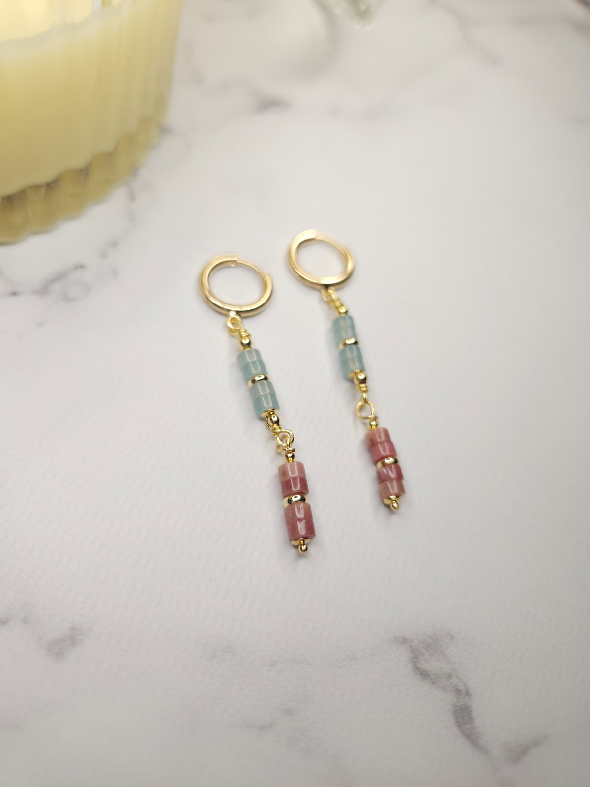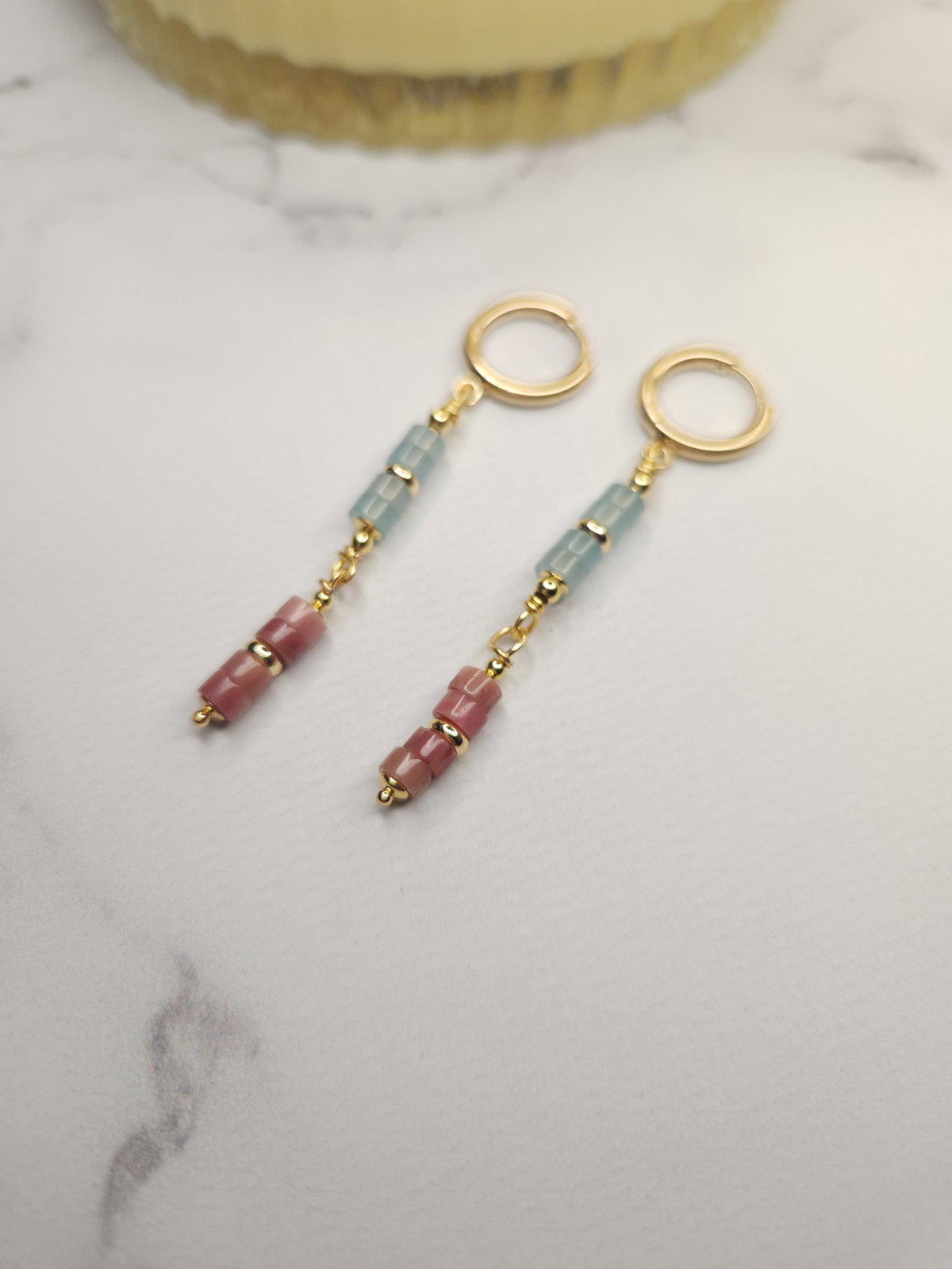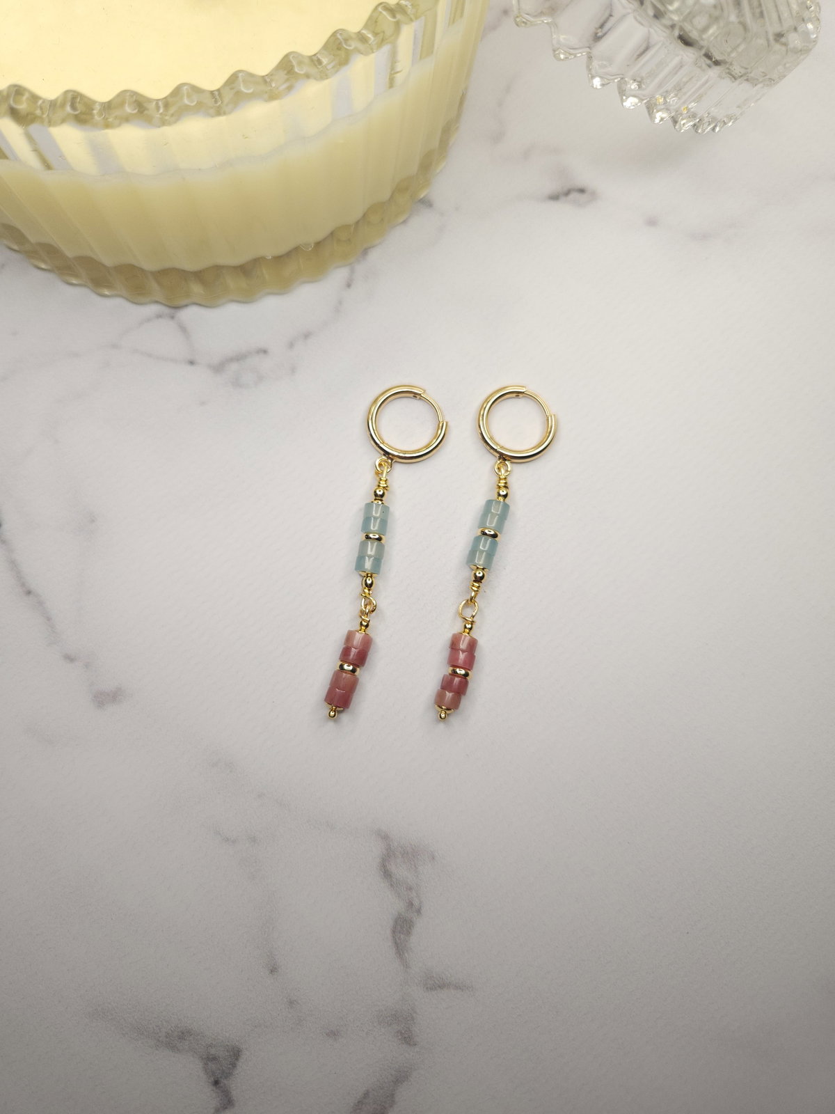 Par de aros realizado con piedras Rodonita Natural y Aguamarina en forma de disco + detalles y terminaciones todo en oro laminado hipoalergenico.