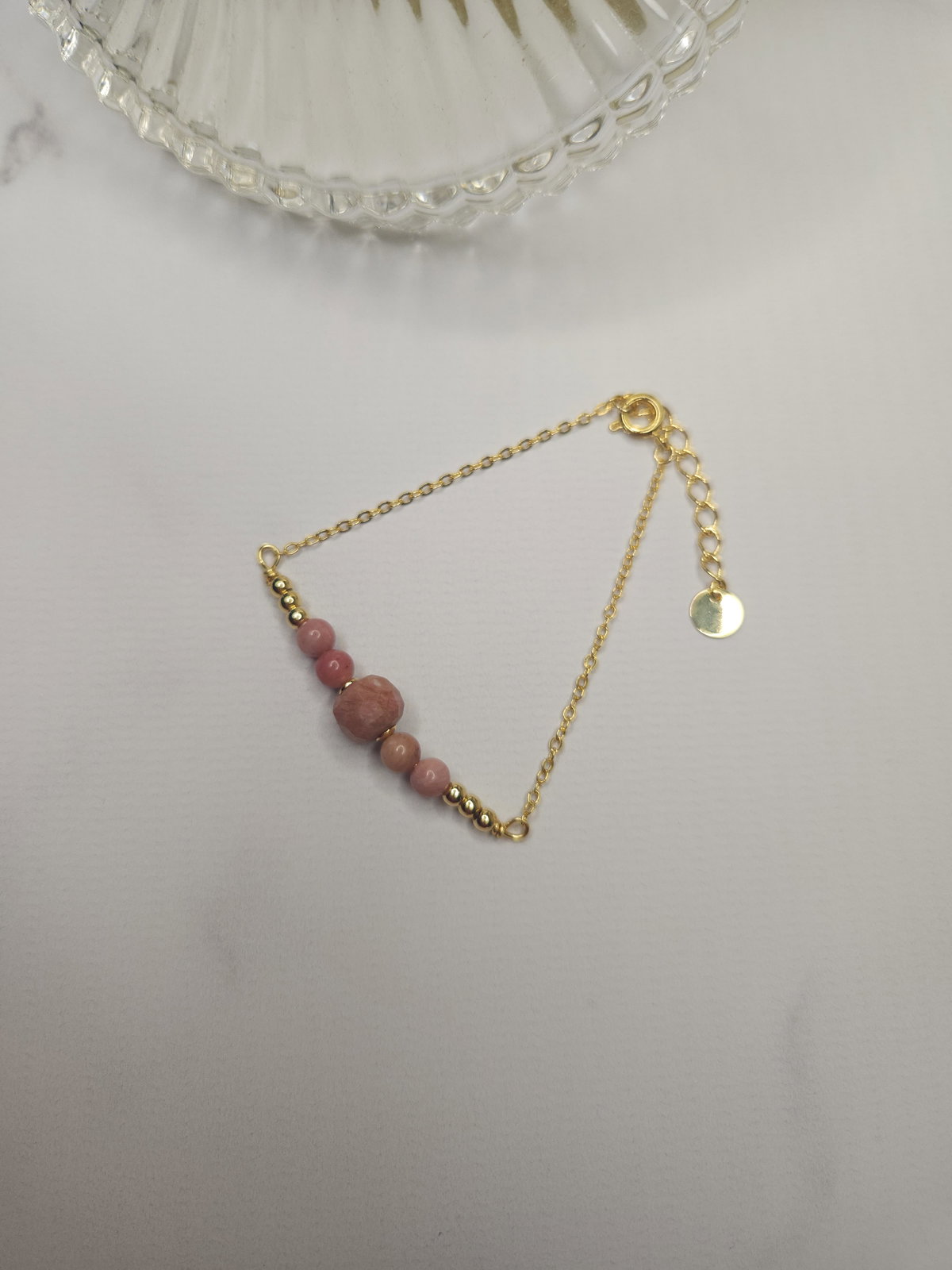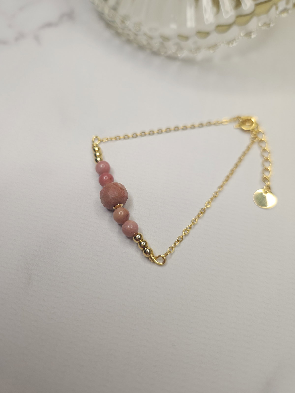 Pulsera realizada con piedras naturales Rodonita Natural de 4 mm y una en Rodonita facetada de 7x6 mm + cadena finita + detalles y terminaciones todo en oro laminado hipoalergenico.