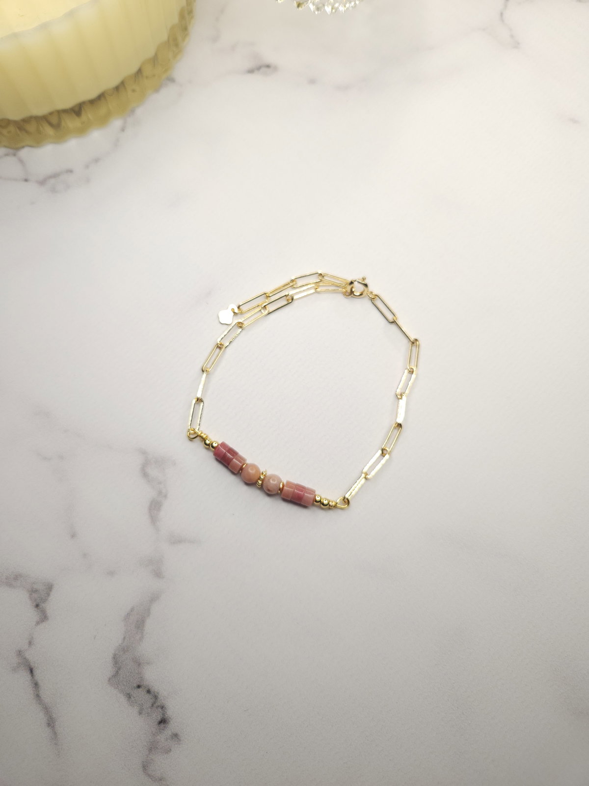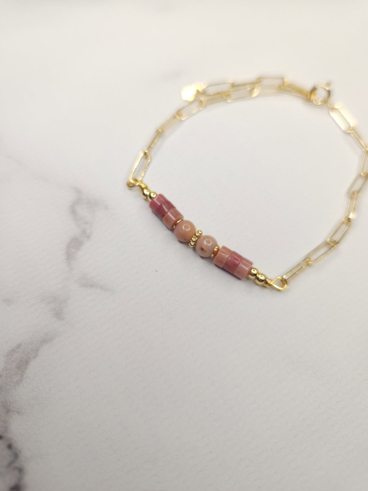 Pulsera realizada con piedras Rodonita Natural de 4 mm y Rodonita Natural en forma de disco + cadena eslabón + detalles y terminaciones todo en oro laminado hipoalergenico.