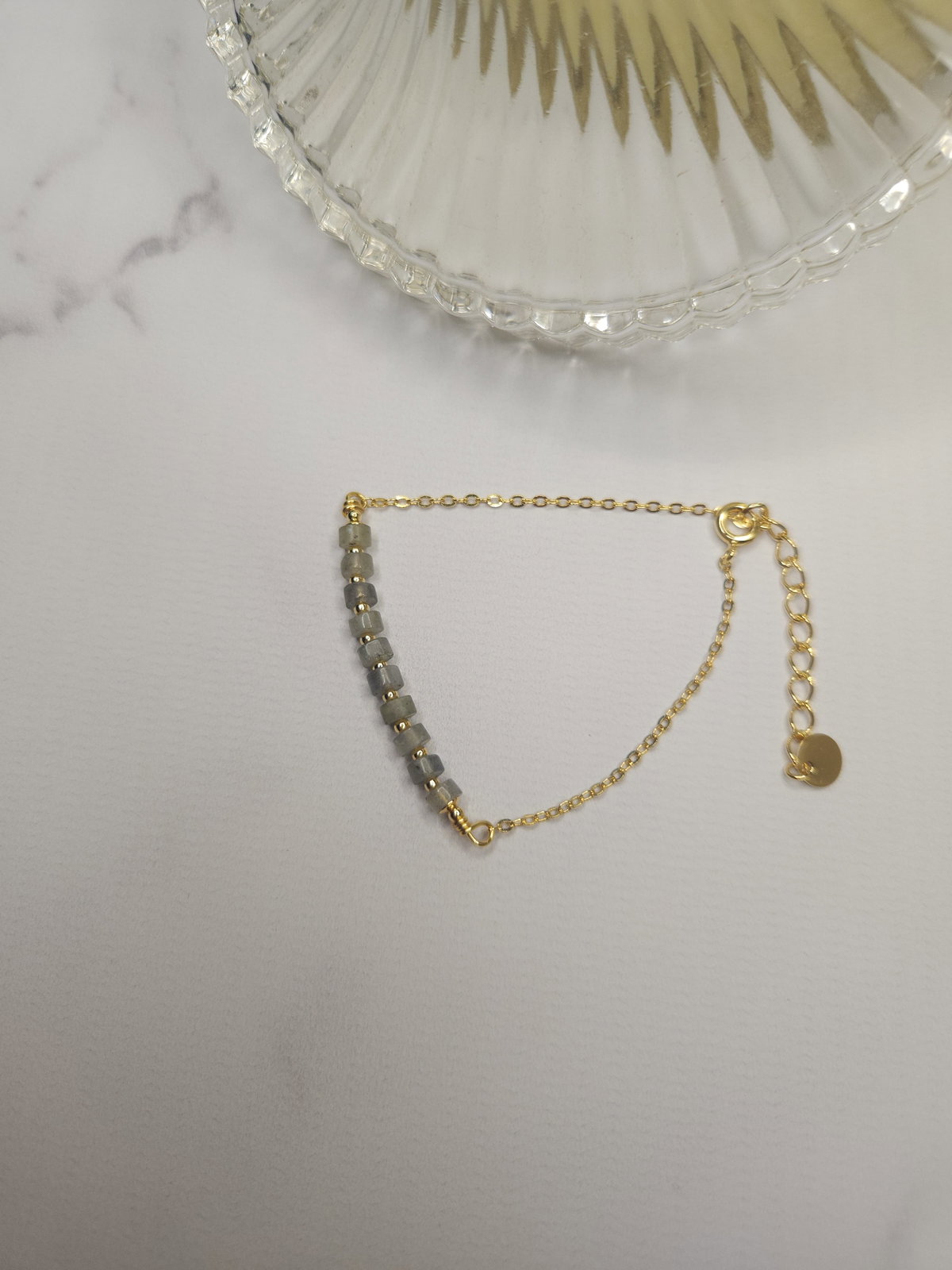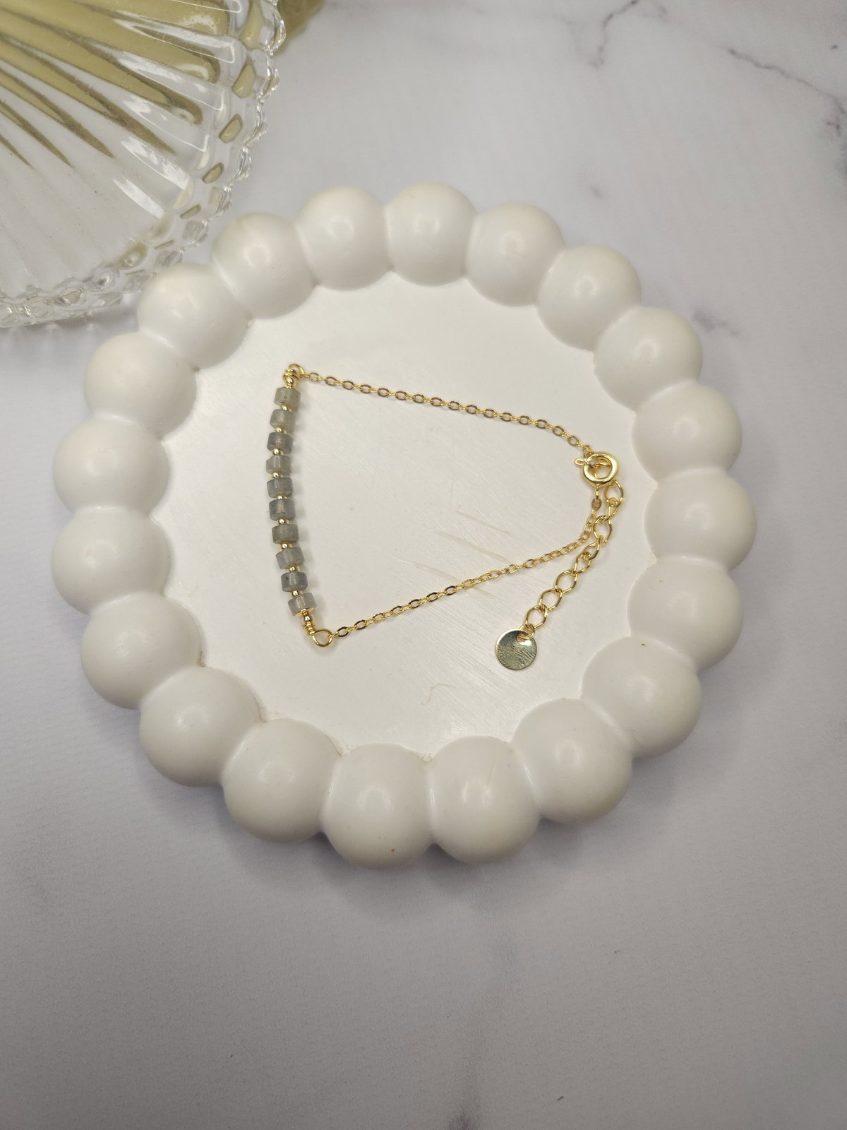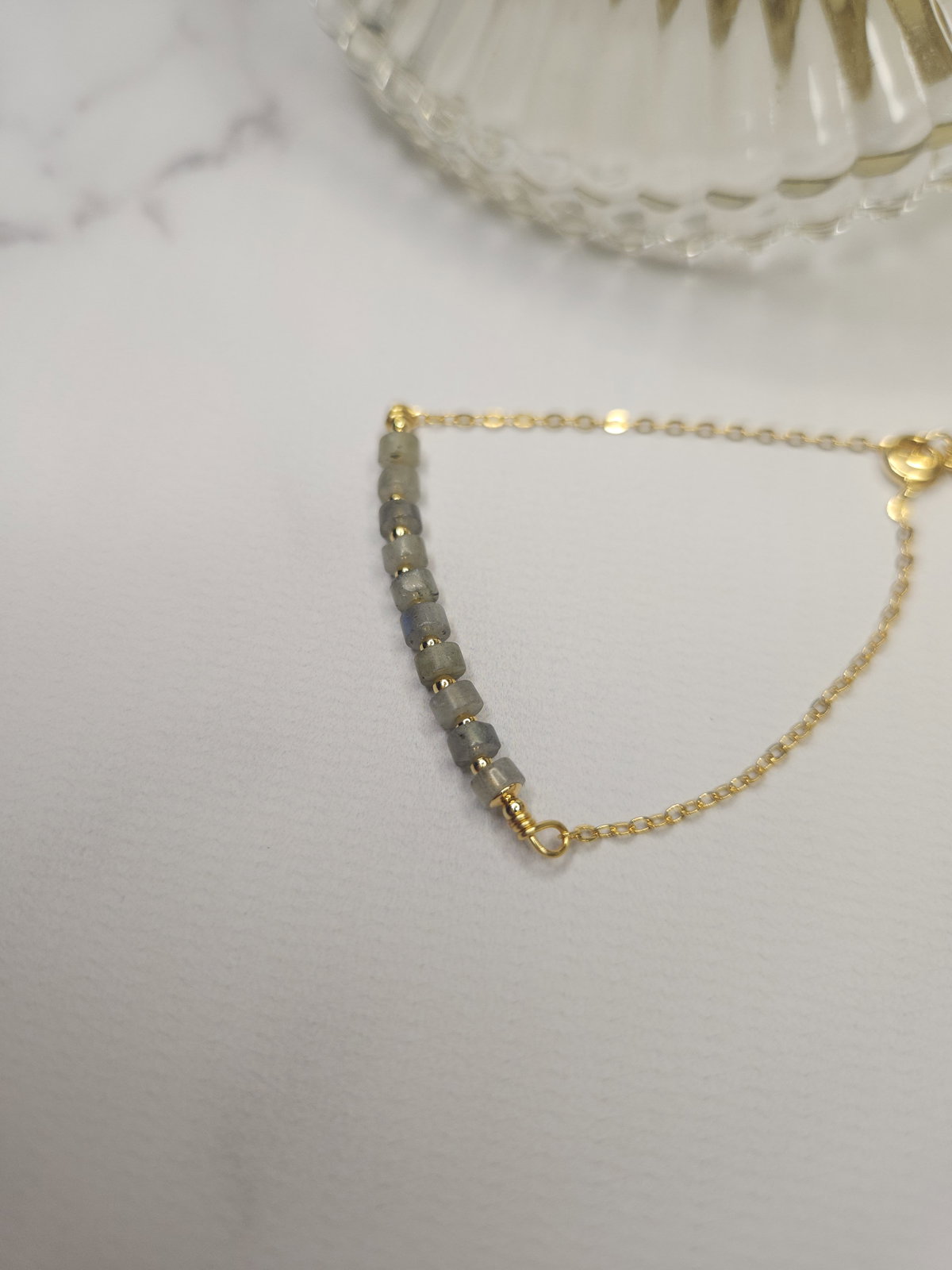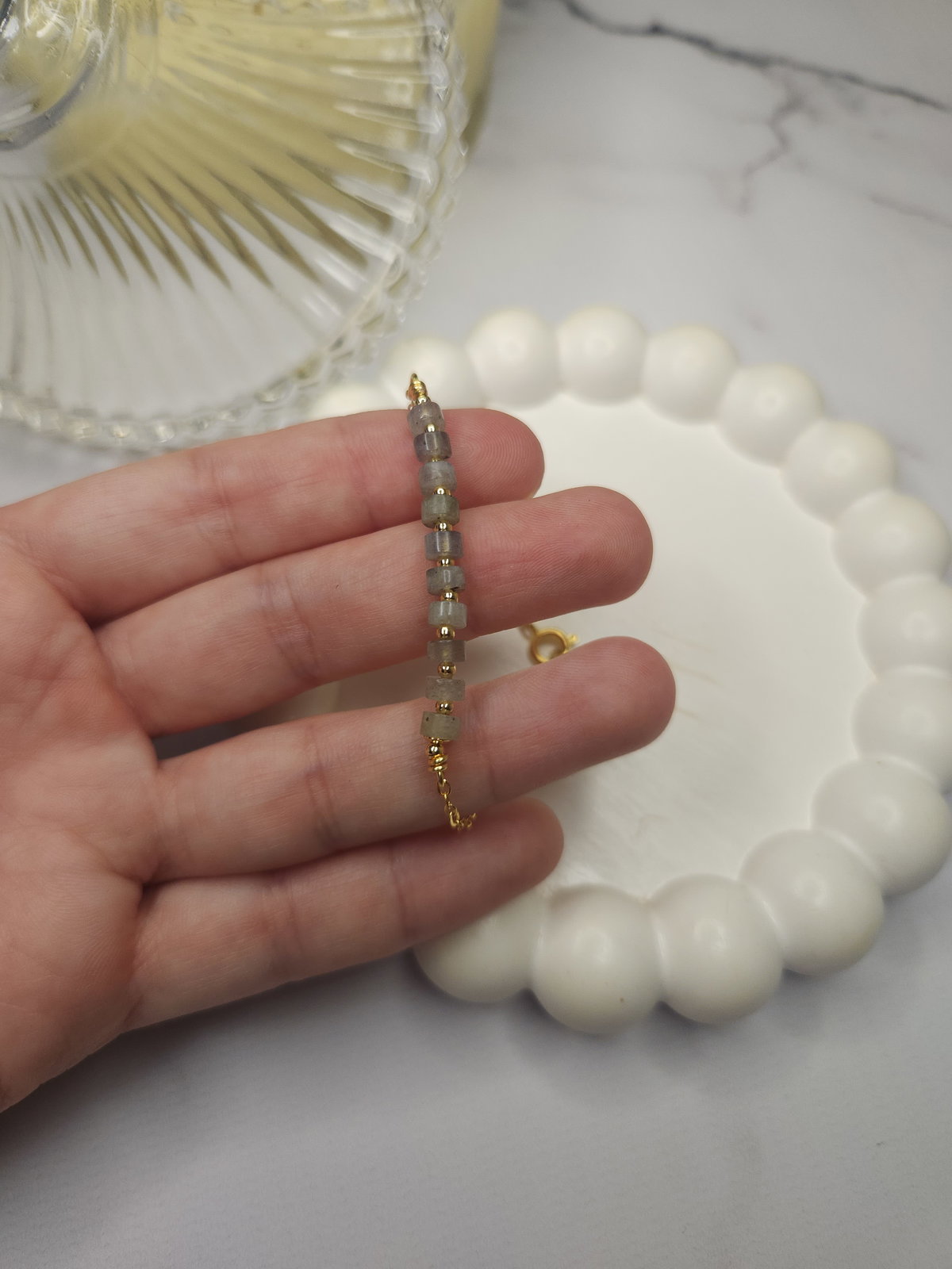 Pulsera realizado con piedras Labradorita en forma de discos de 4x2 mm + cadena finita + detalles y terminaciones todo en oro laminado hipoalergenico.