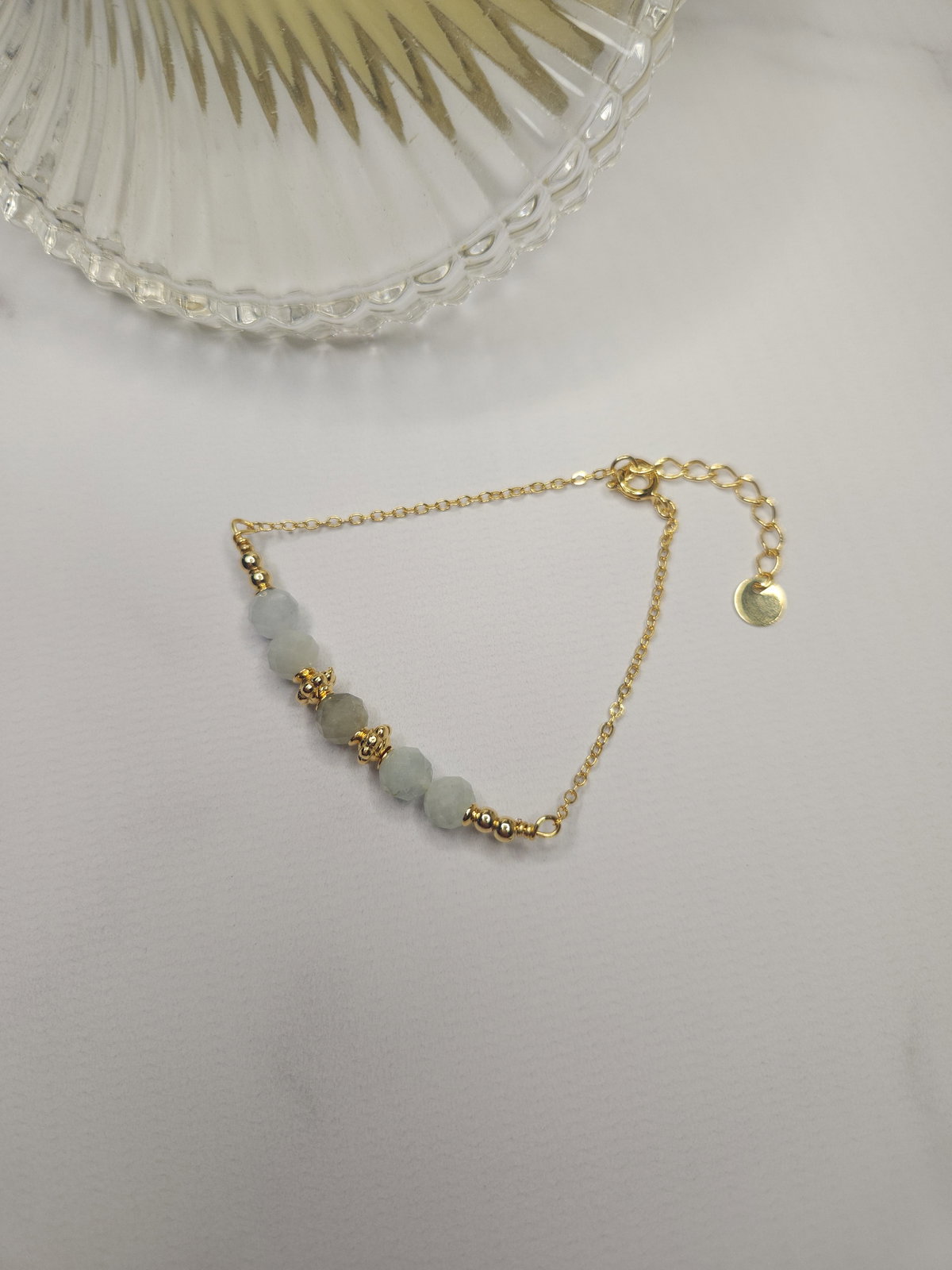Pulsera realizado con piedras Aguamarina facetada de 6 mm + cadena finita + detalles y terminaciones todo en oro laminado hipoalergenico.