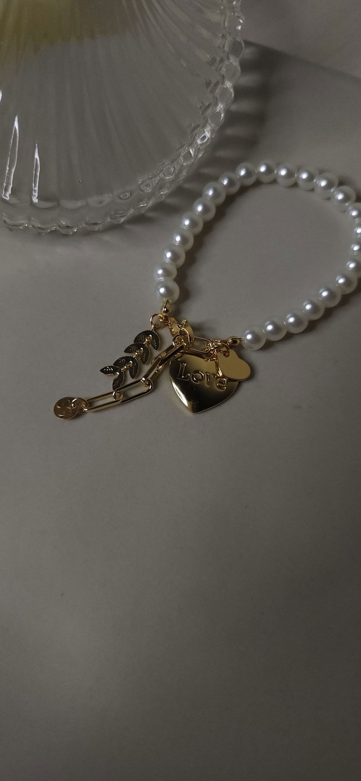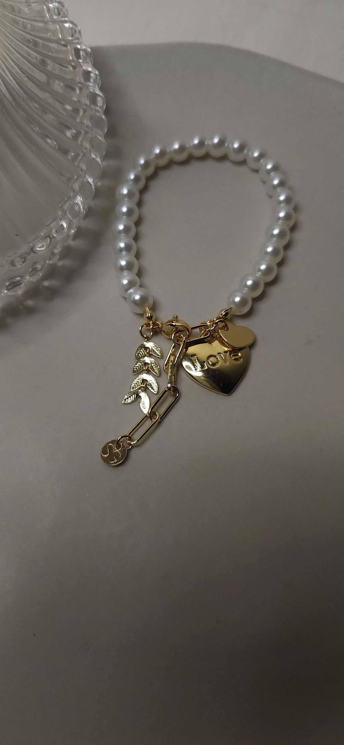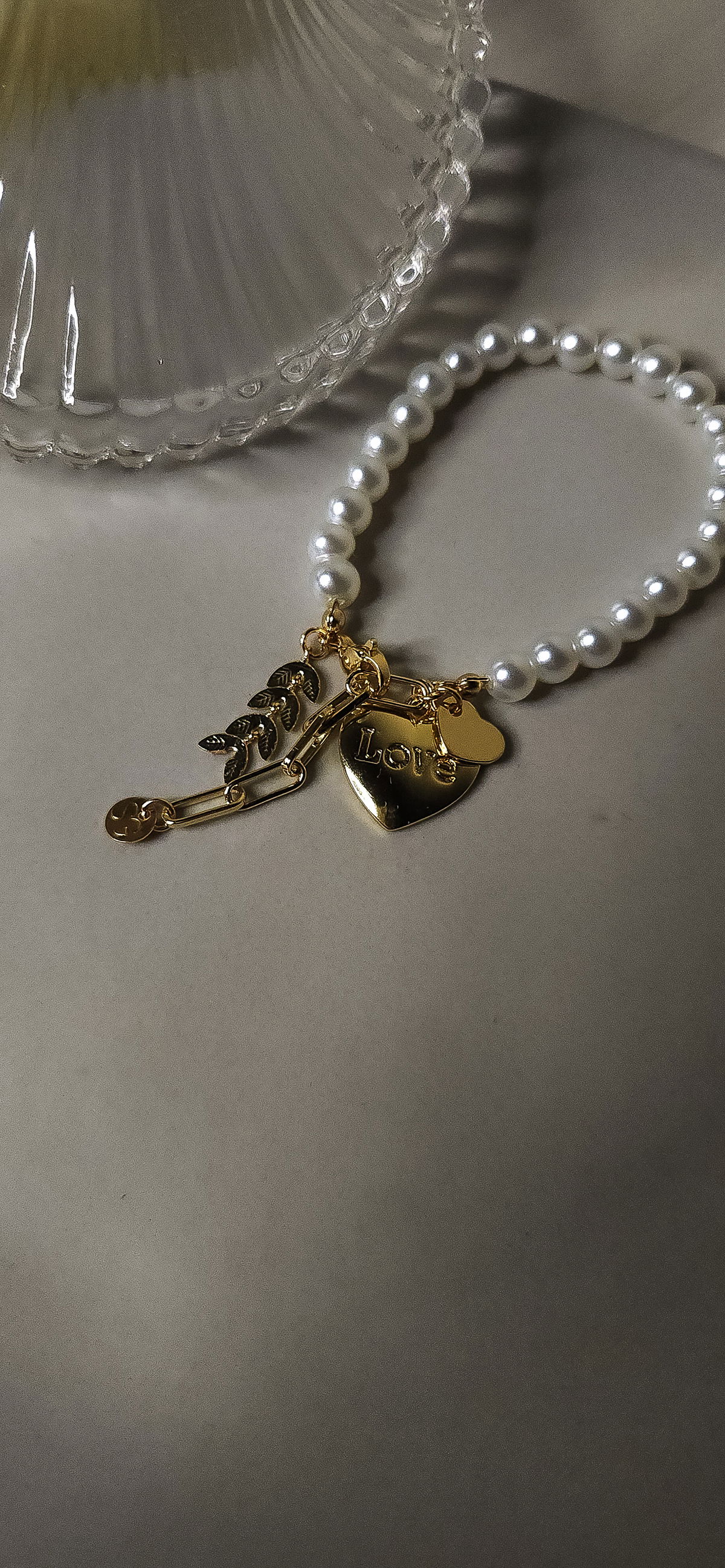 Pulsera realizada con perlas premium de 4 mm + dije corazón LOVE, corazón plano inclinado y parte de cadena flechas, todo en oro laminado hipoalergénico.