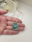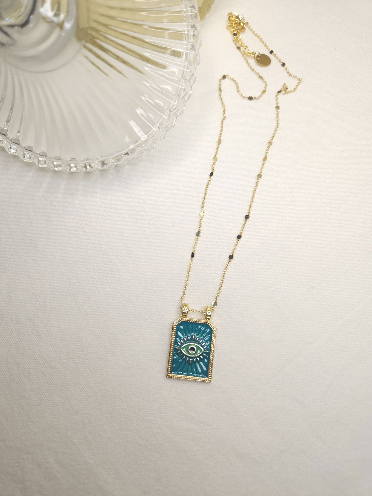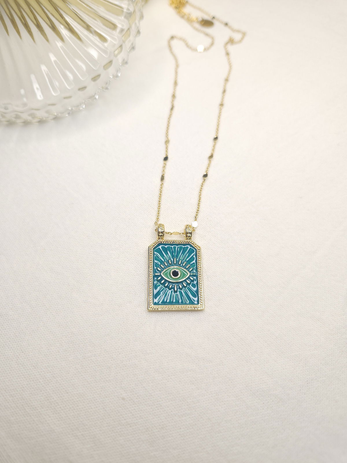 Conjunto en oro laminado con cadena destello finita y dije placa esmaltado ojito en color verde.