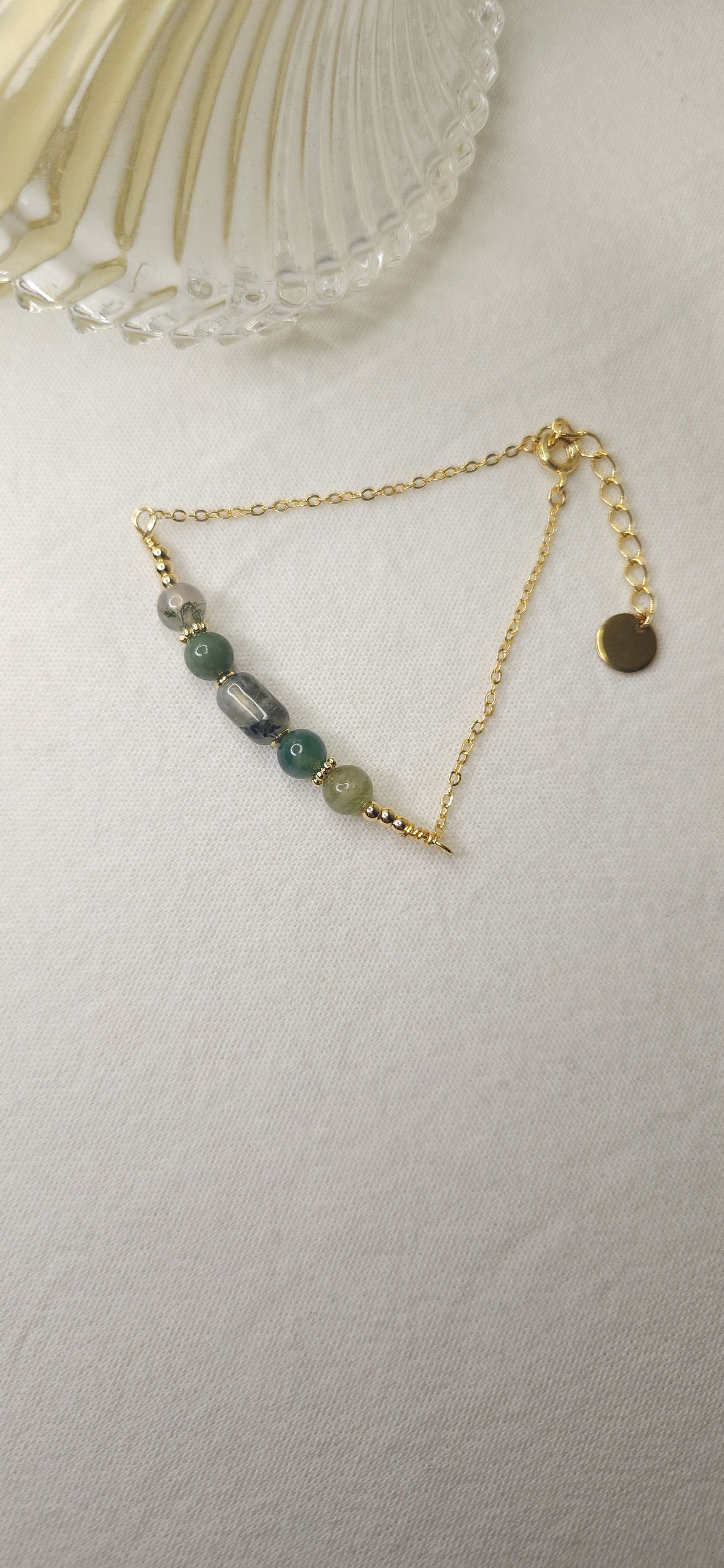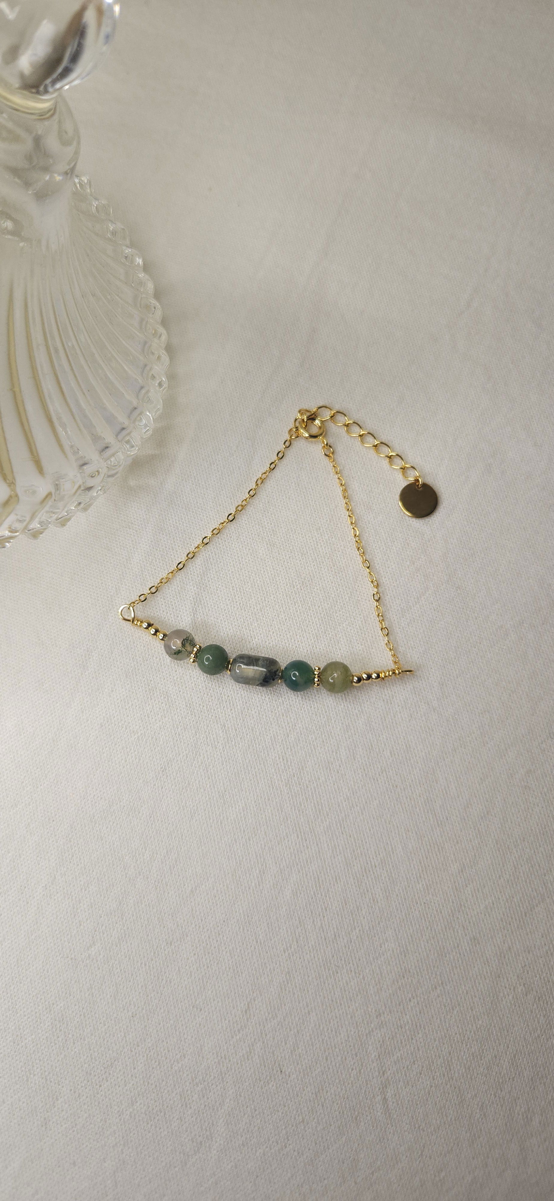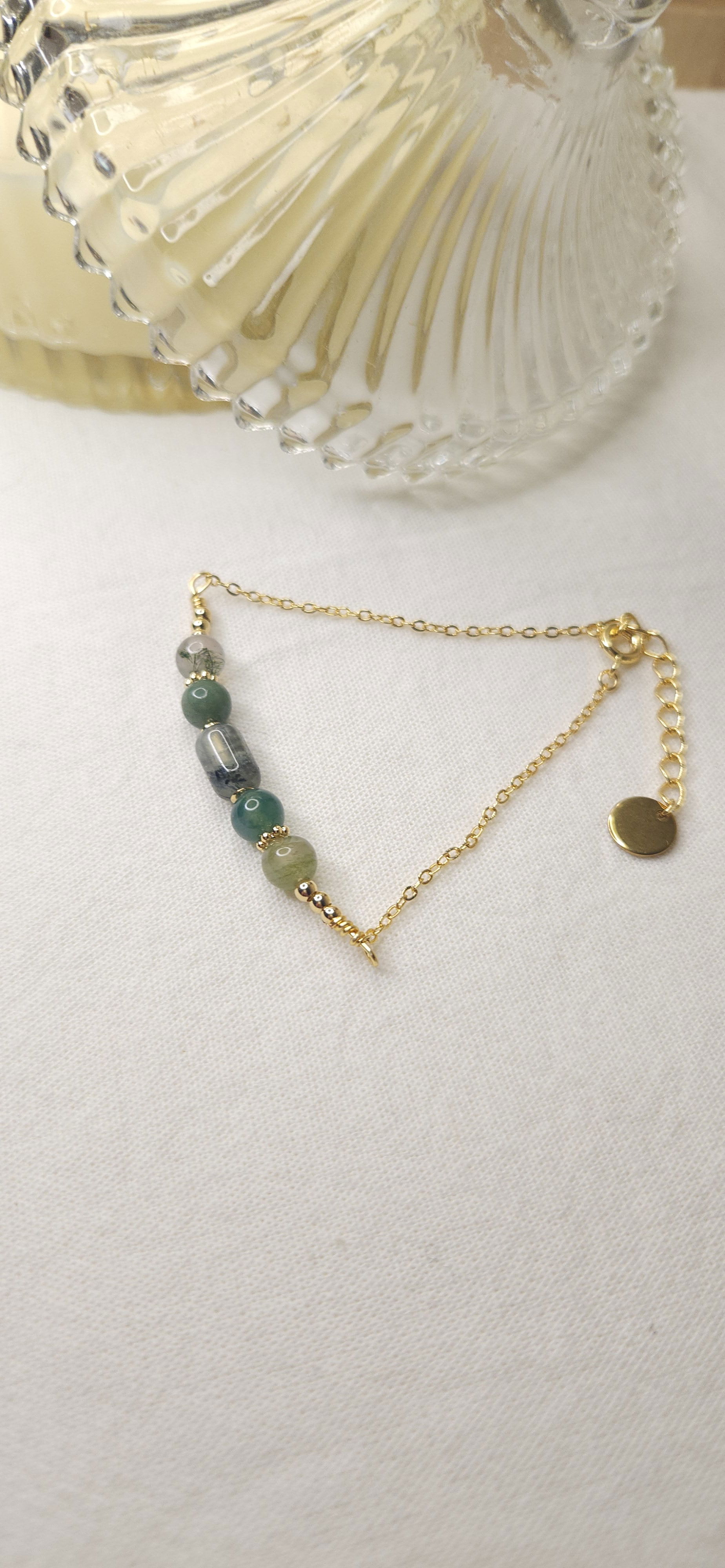 Pulsera en Oro Laminado hipoalergénico con con cadena finita + piedras naturales Prehnita y Ágata Musgo, con separadores en oro laminado.
