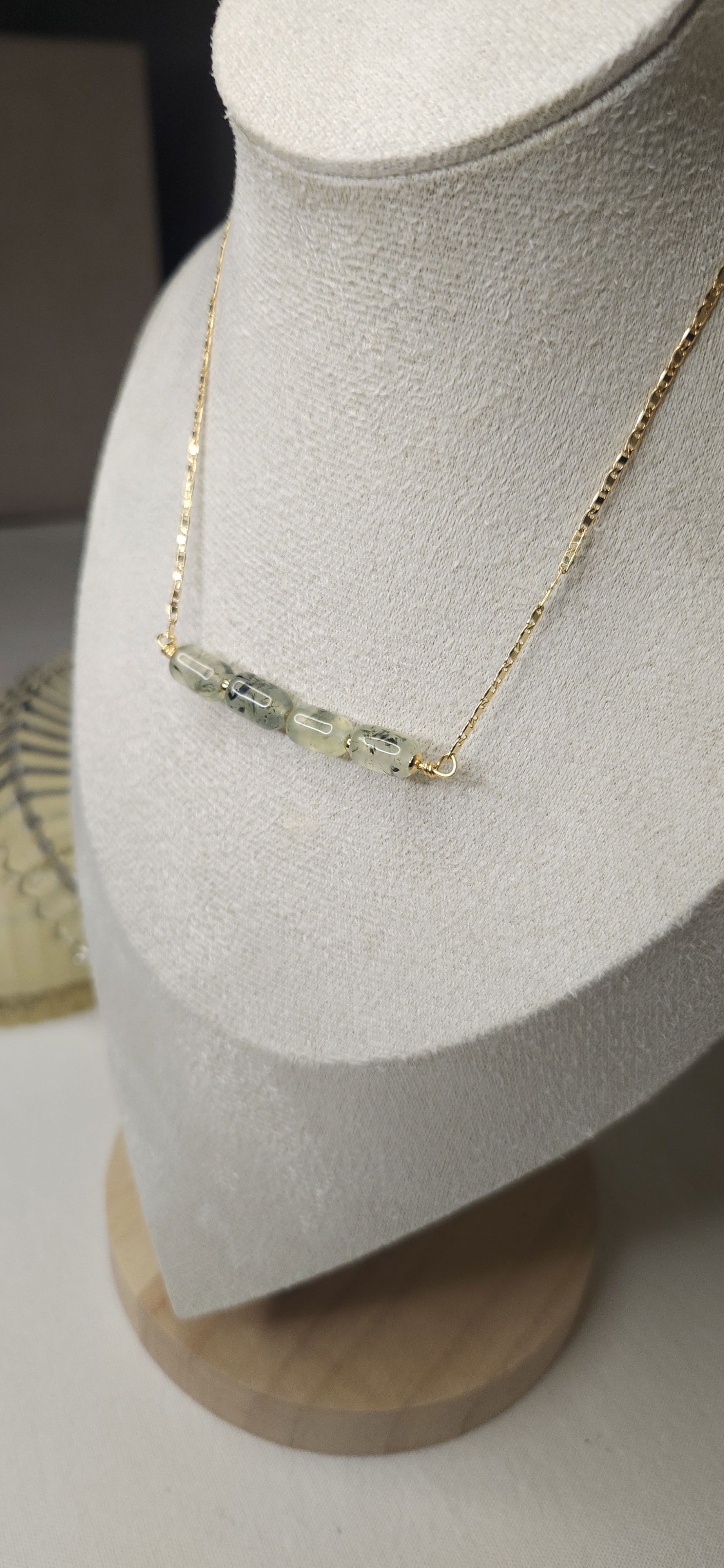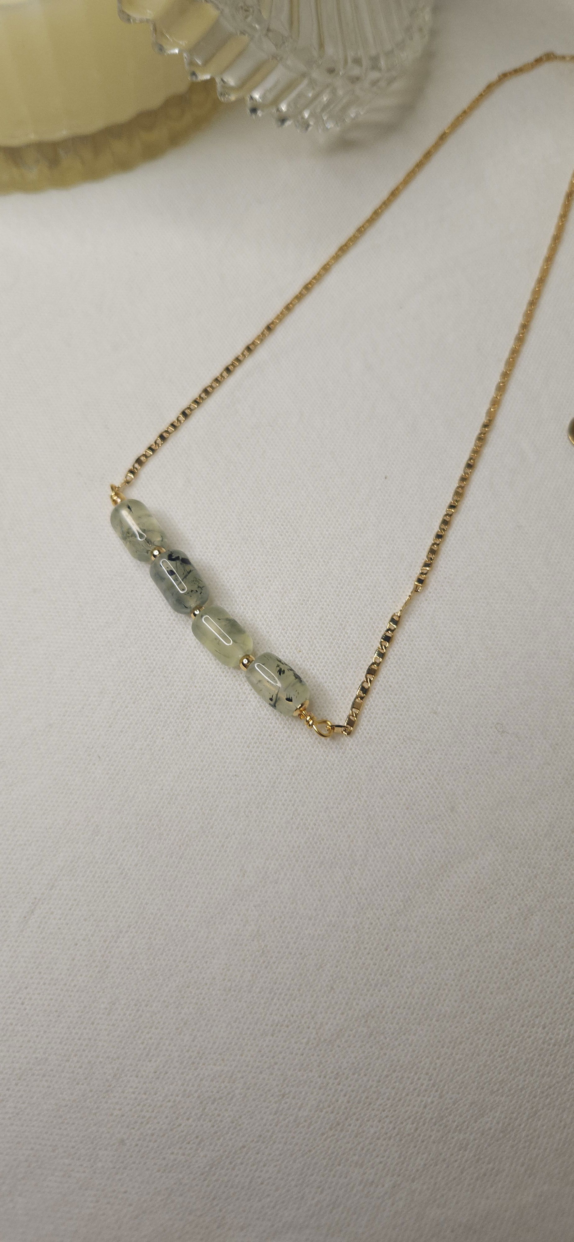 Conjunto realizado con cadena en oro laminado + dijes piedras natural prehnita, y separadores en oro laminado.