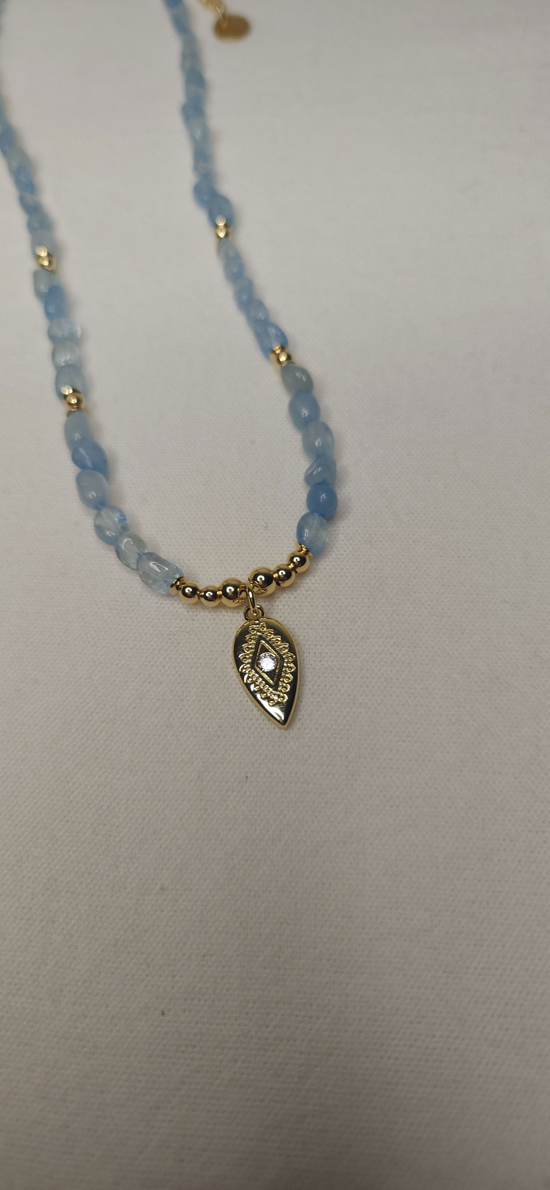 Conjunto realizado con piedras naturales semillas aguamarina de 3-5mm + dije ojo turco + detalles y terminaciones todo en oro laminado hipoalergenico.