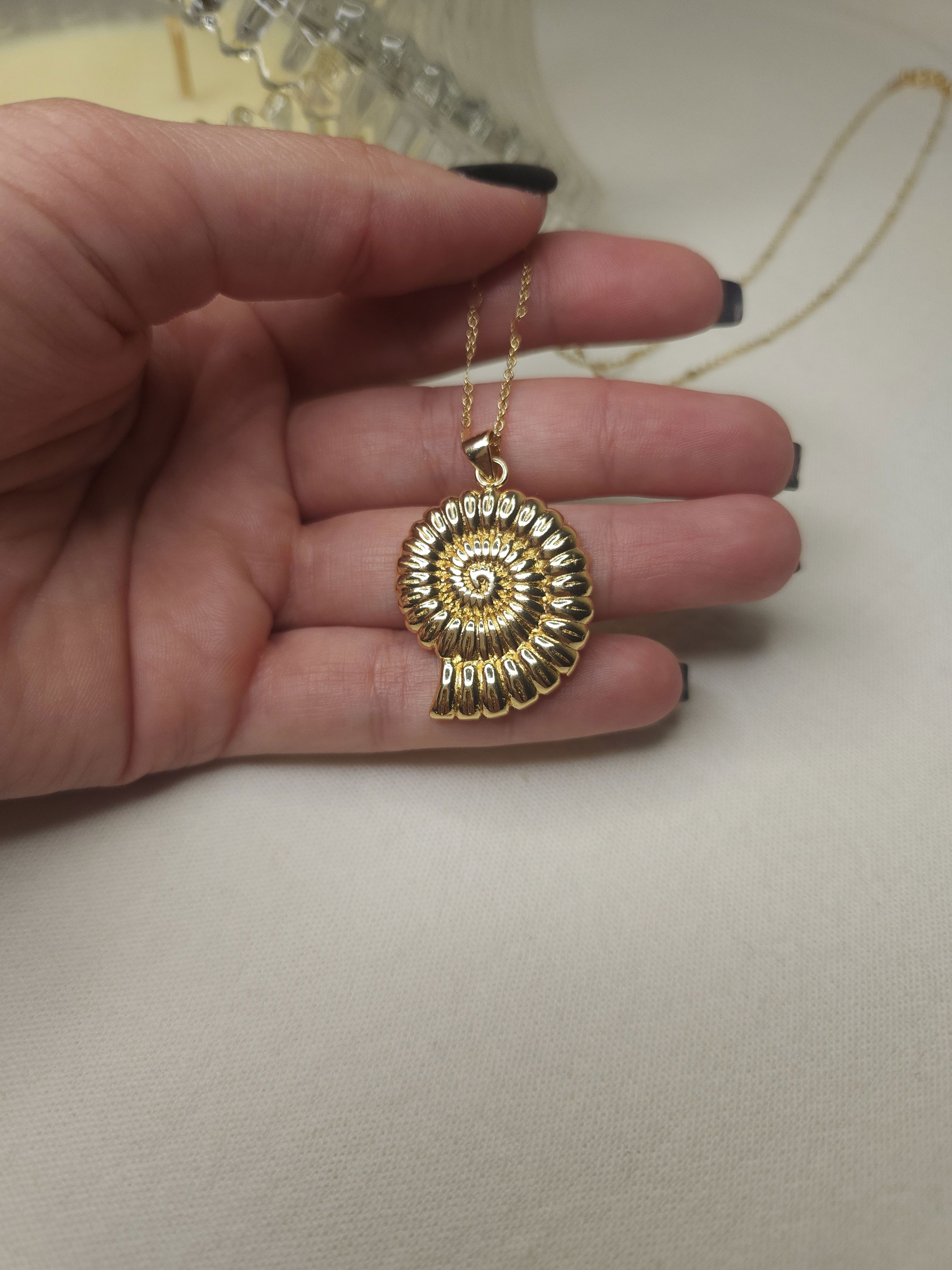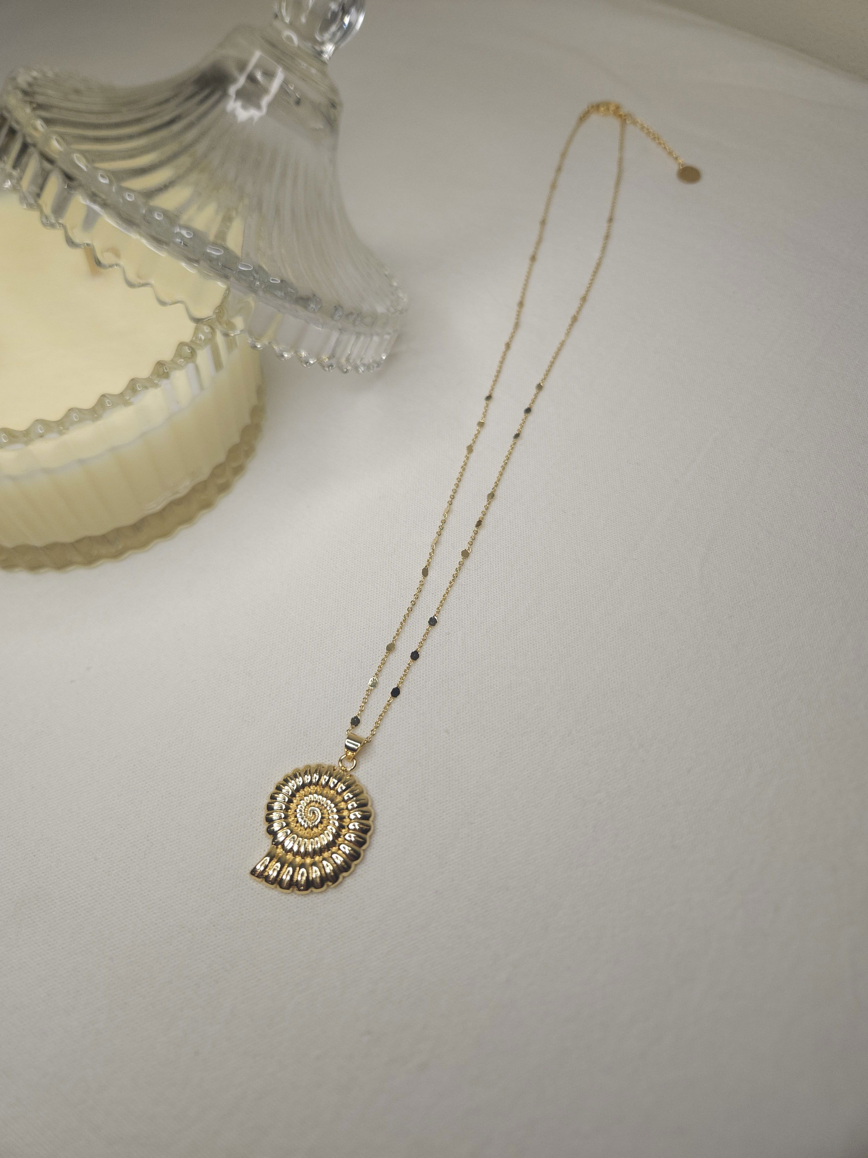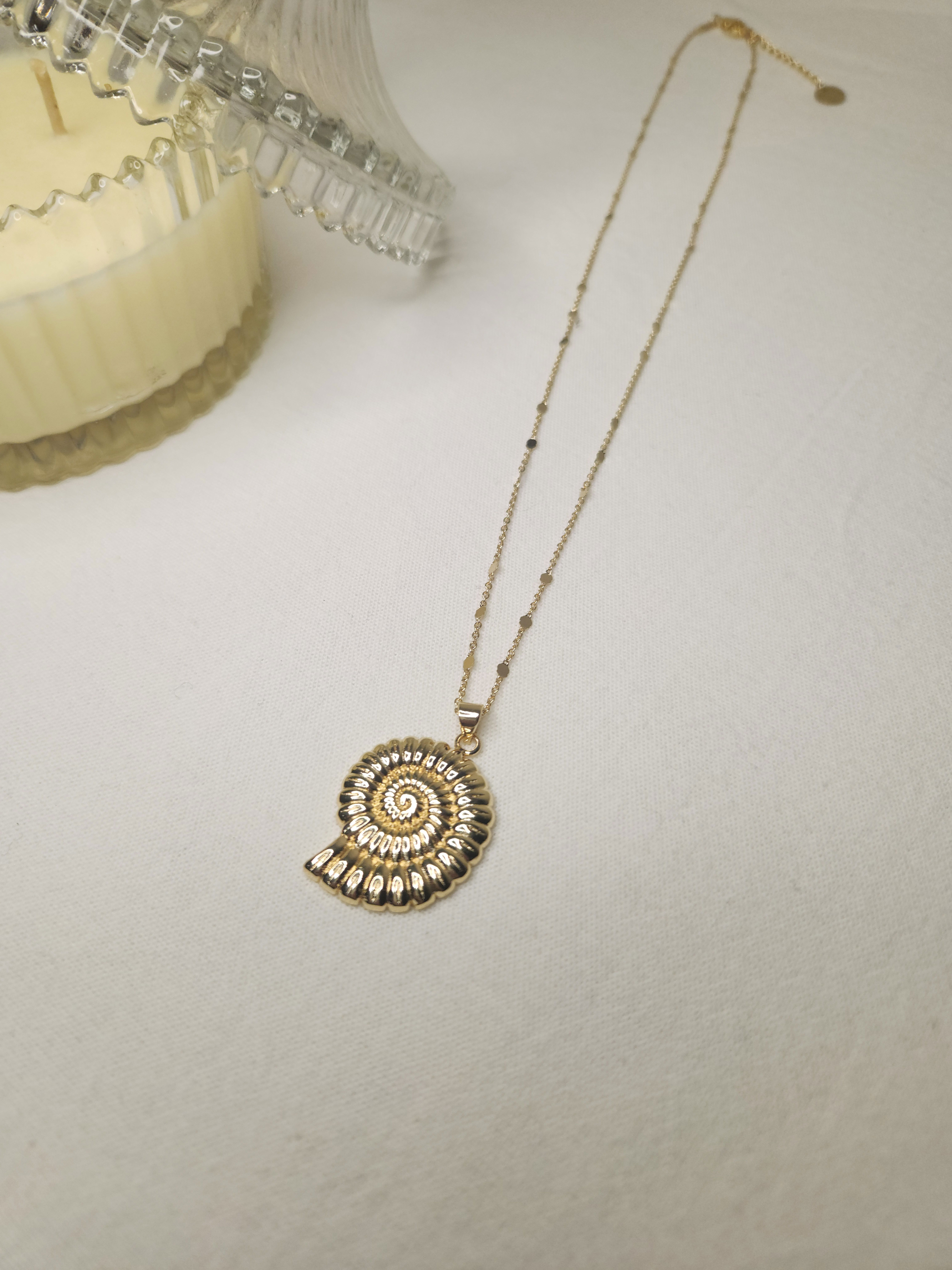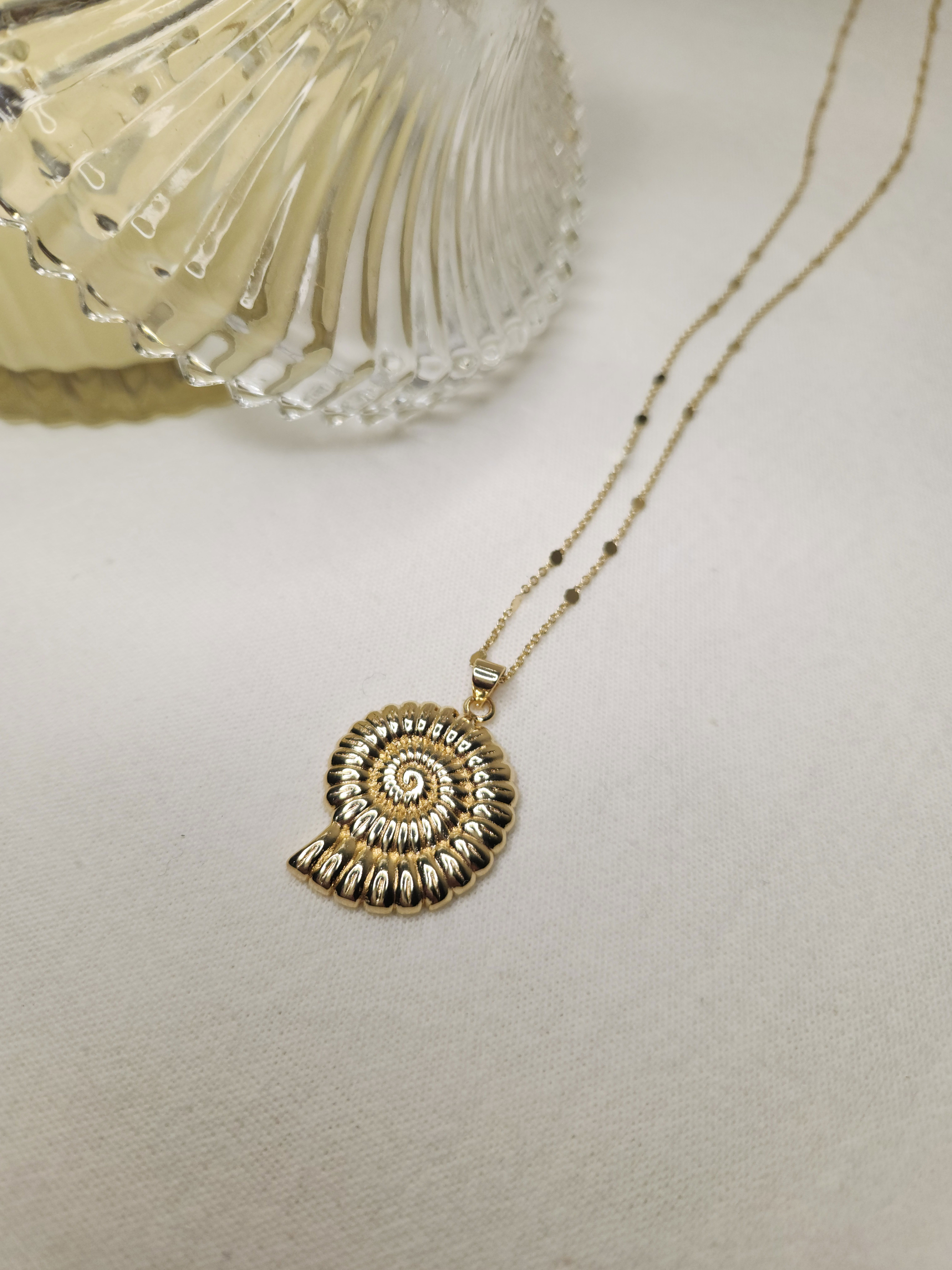 Conjunto en oro laminado con cadena destello finita y dije buzio espiral de 30,4 mm.
